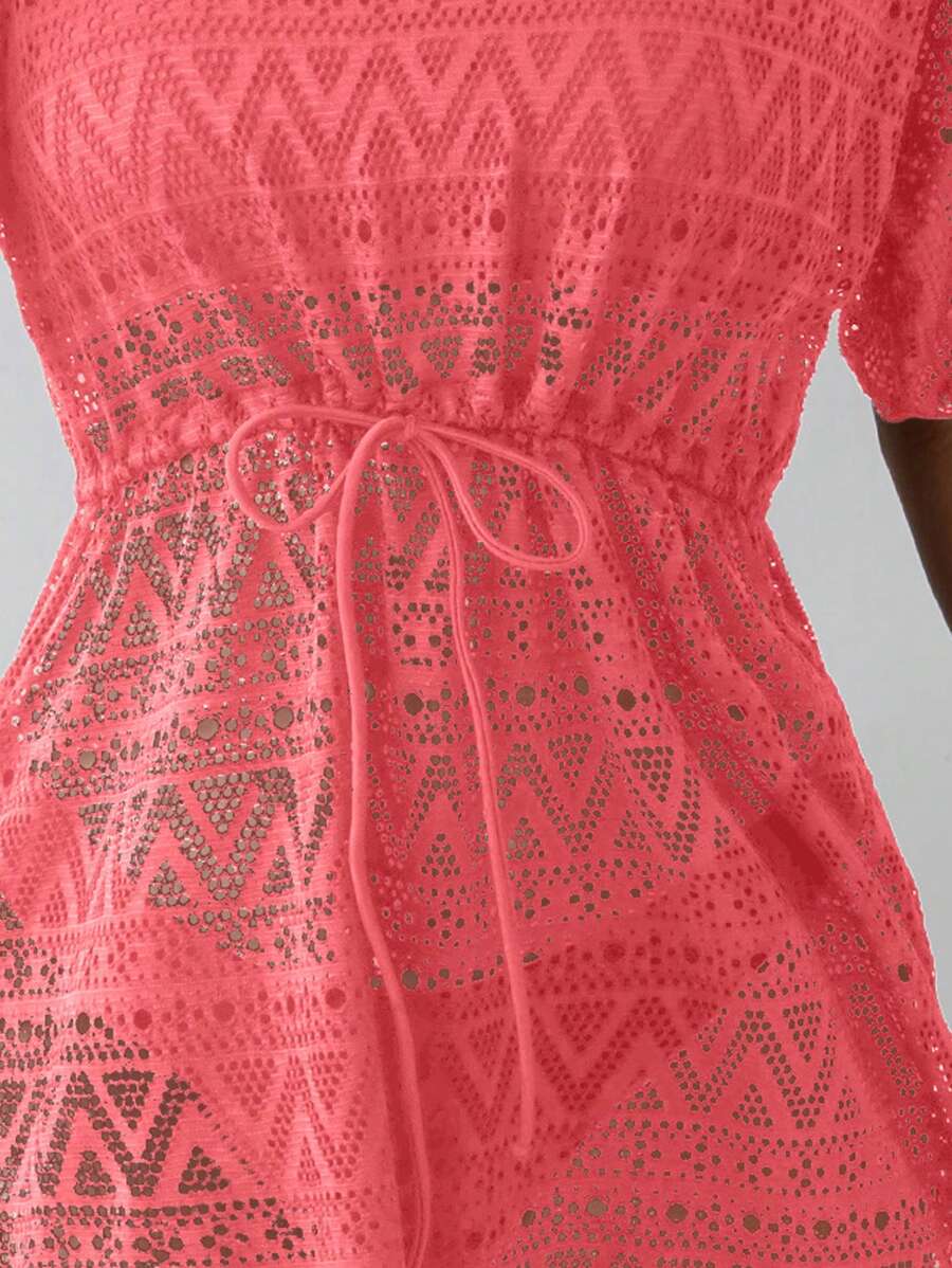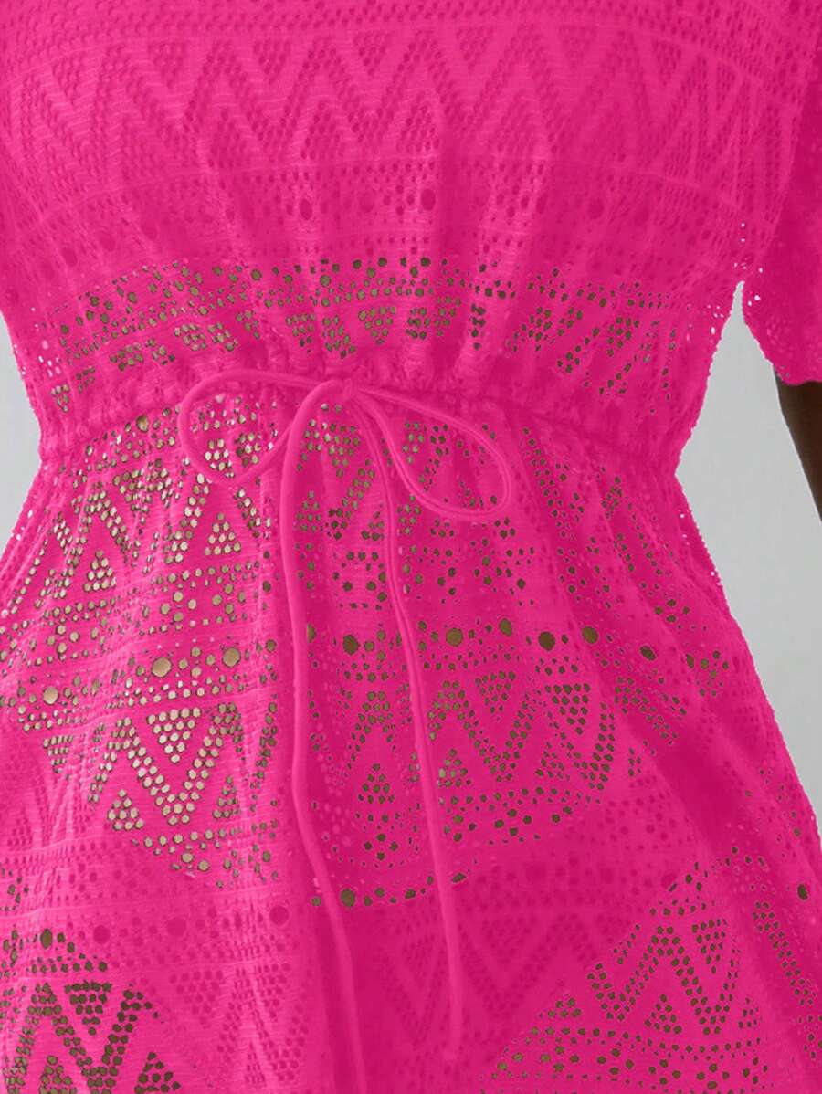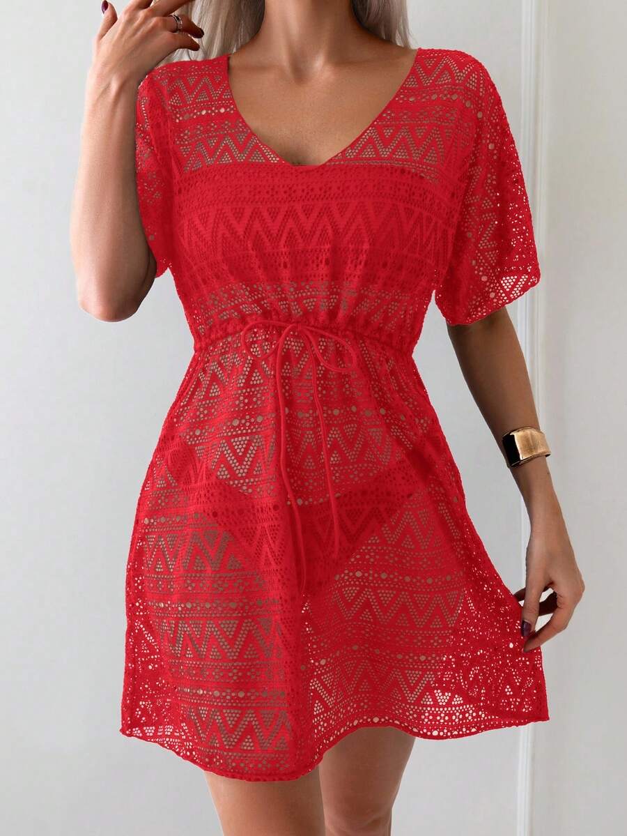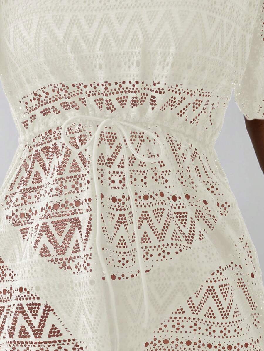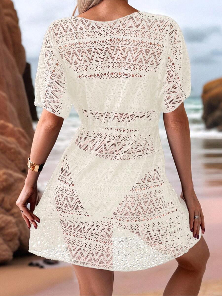 Vestido de playa para mujer con escote en v, manga corta, cintura calada y lazo