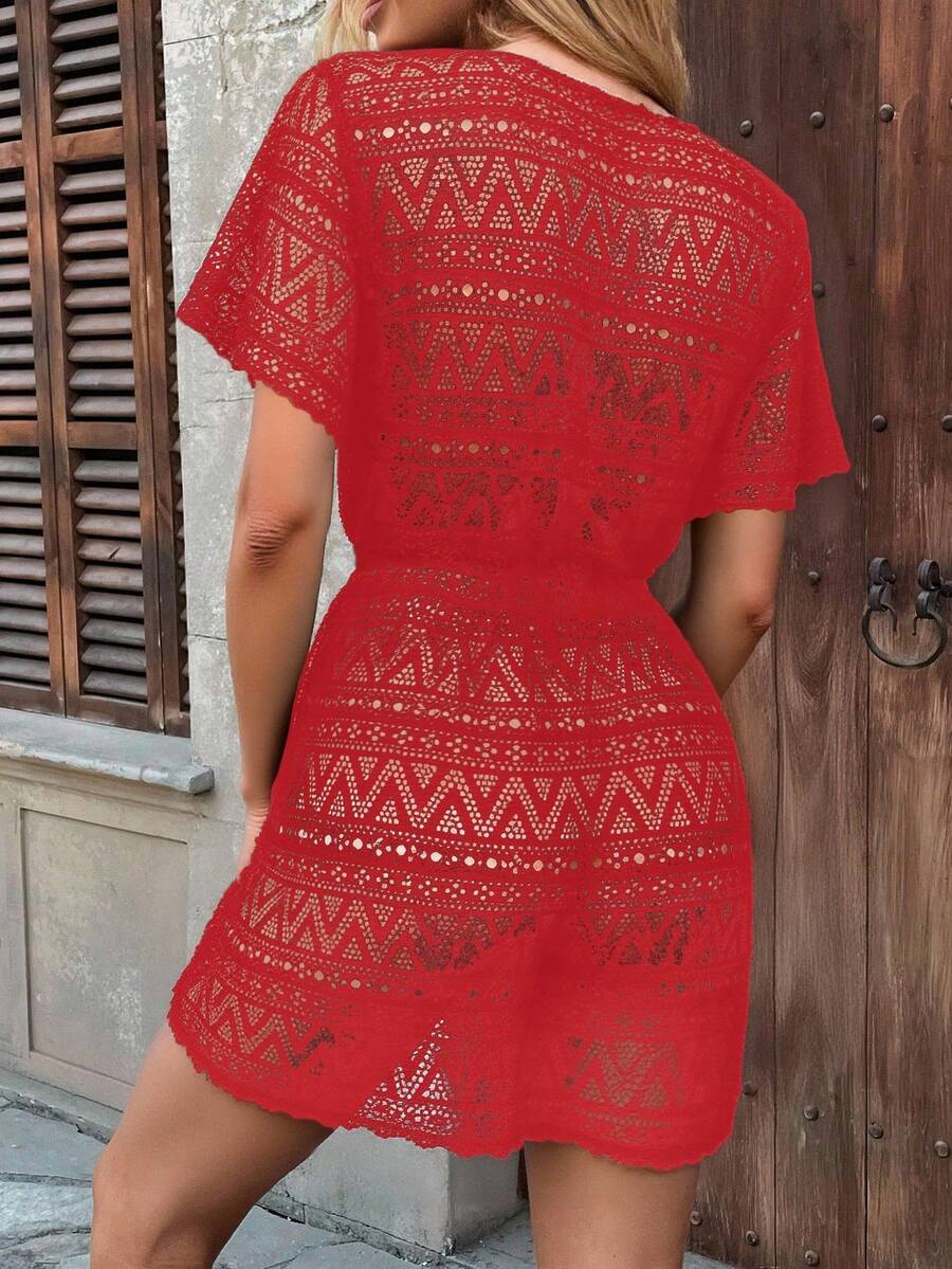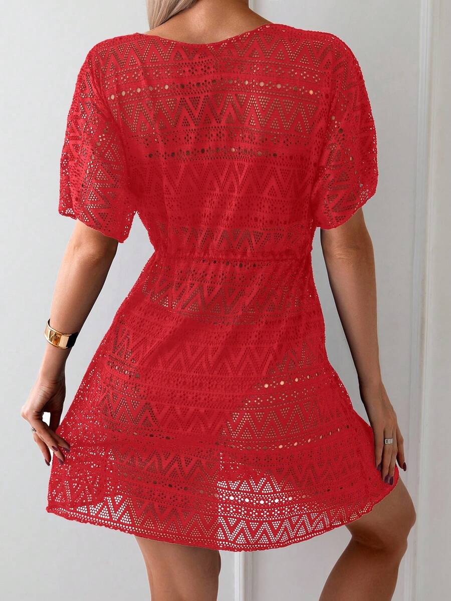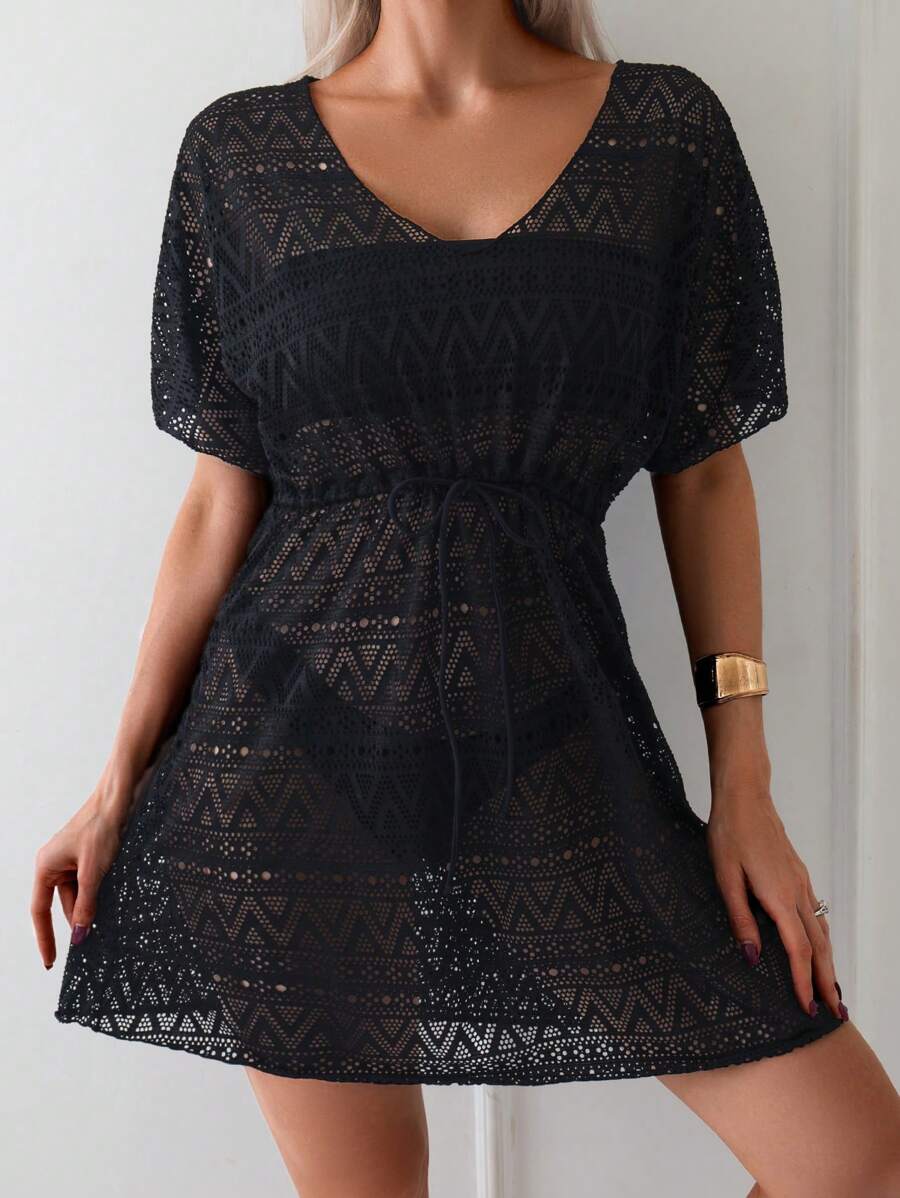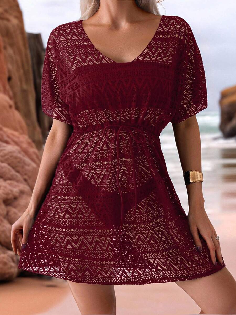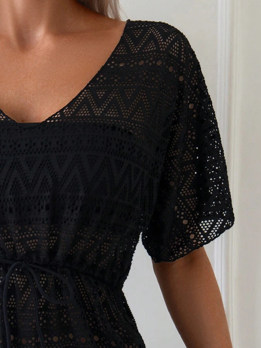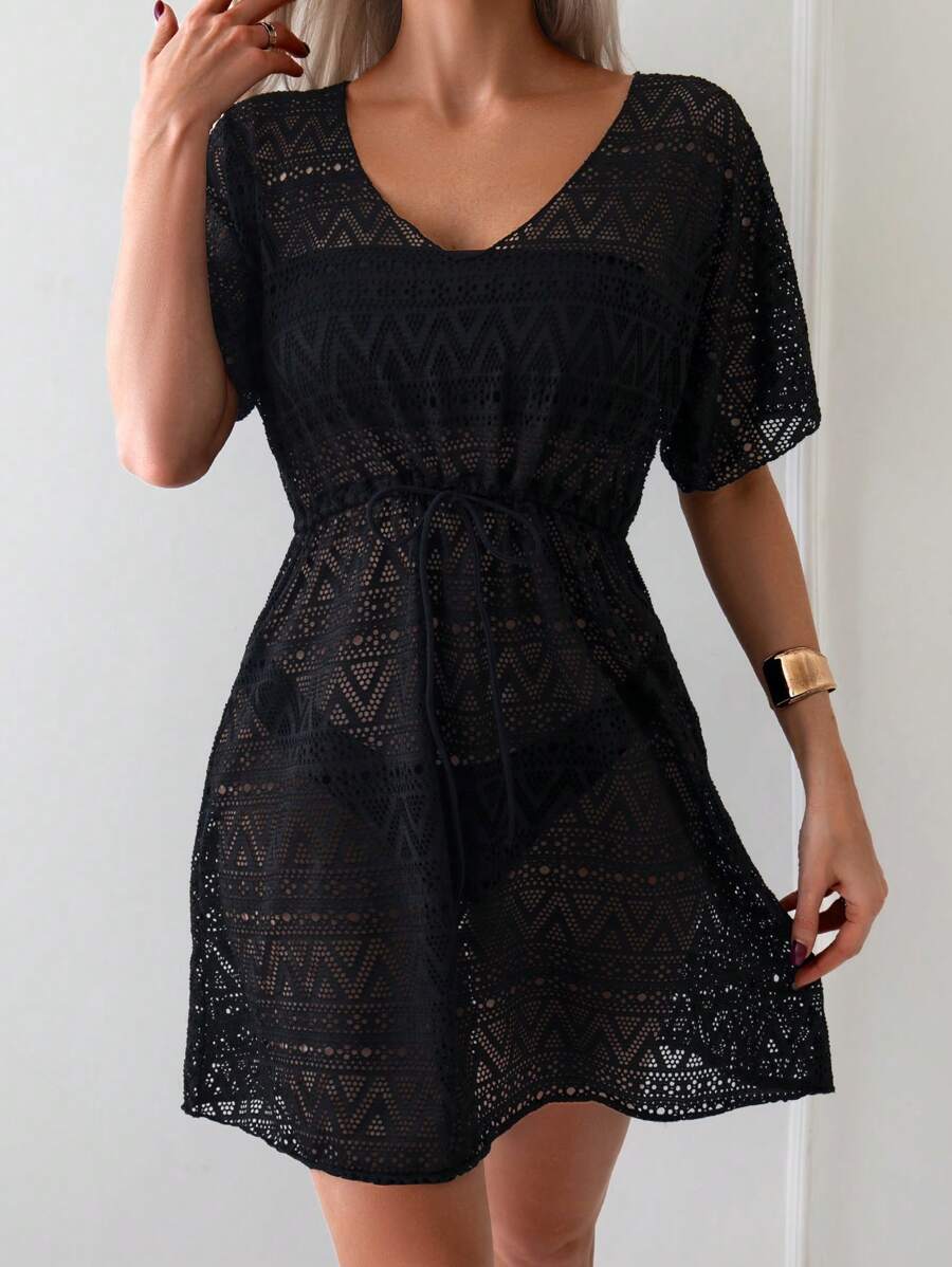 Vestido de playa para mujer con escote en v, manga corta, cintura calada y lazo
