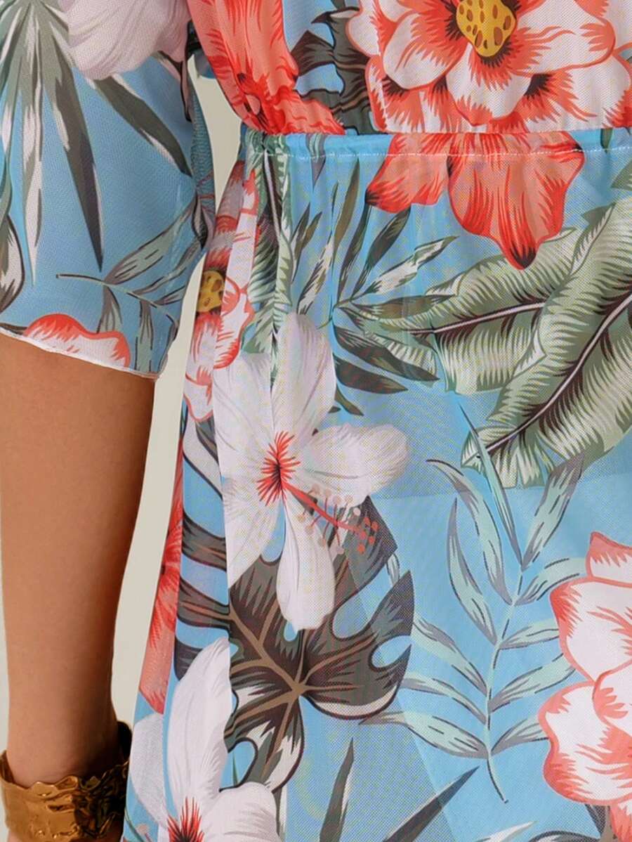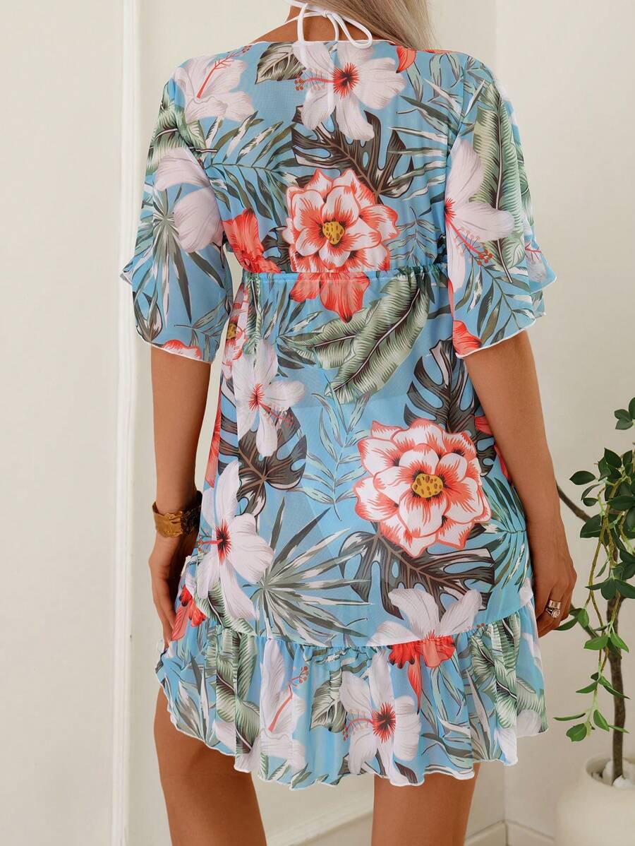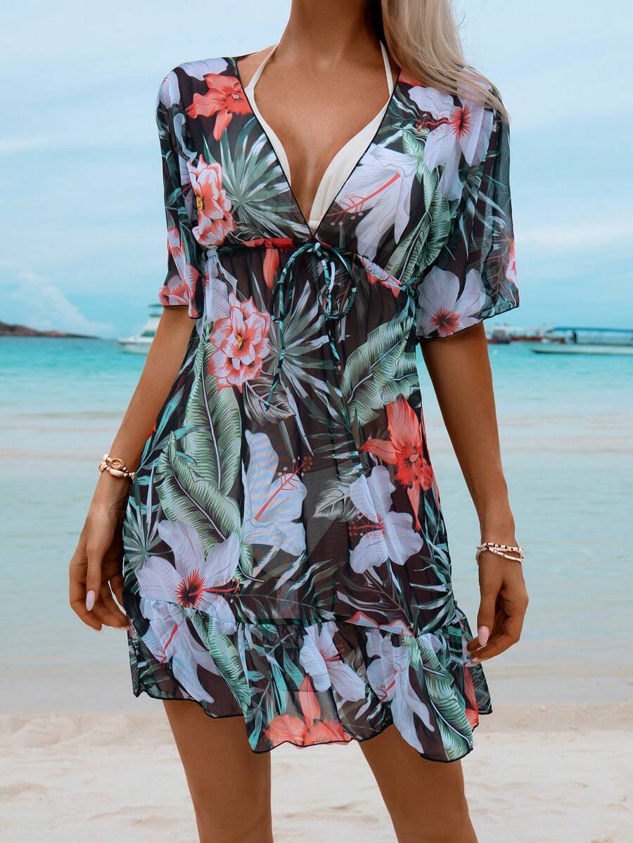 Lushoire ropa de playa con estampado floral, cuello en v profundo, bajo con volantes para mujer, ideal para dias soleados y de fiesta en vacaciones