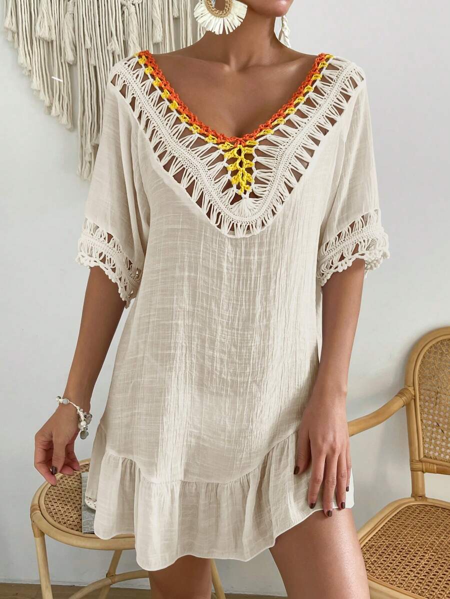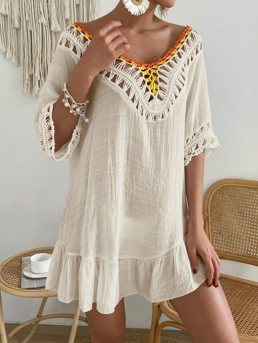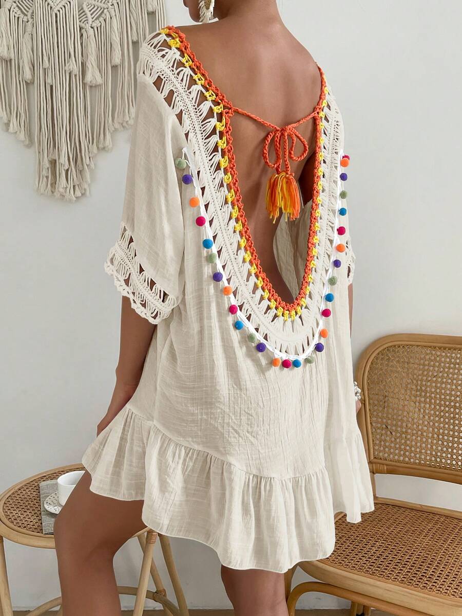 Cubrecuerpo casual de vacaciones para mujer con decoracion de flor de ganchillo y pompones