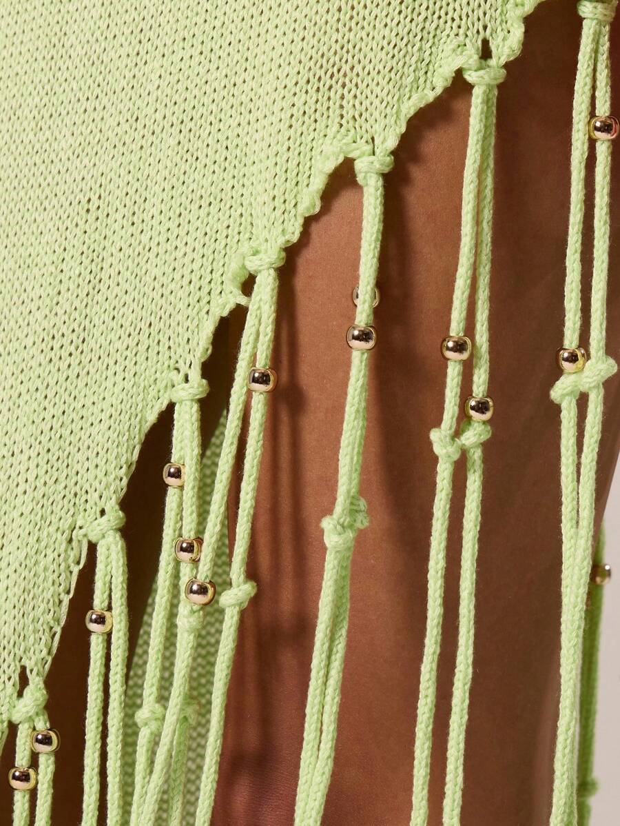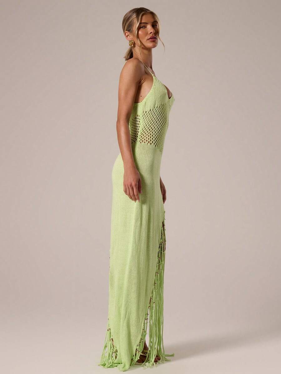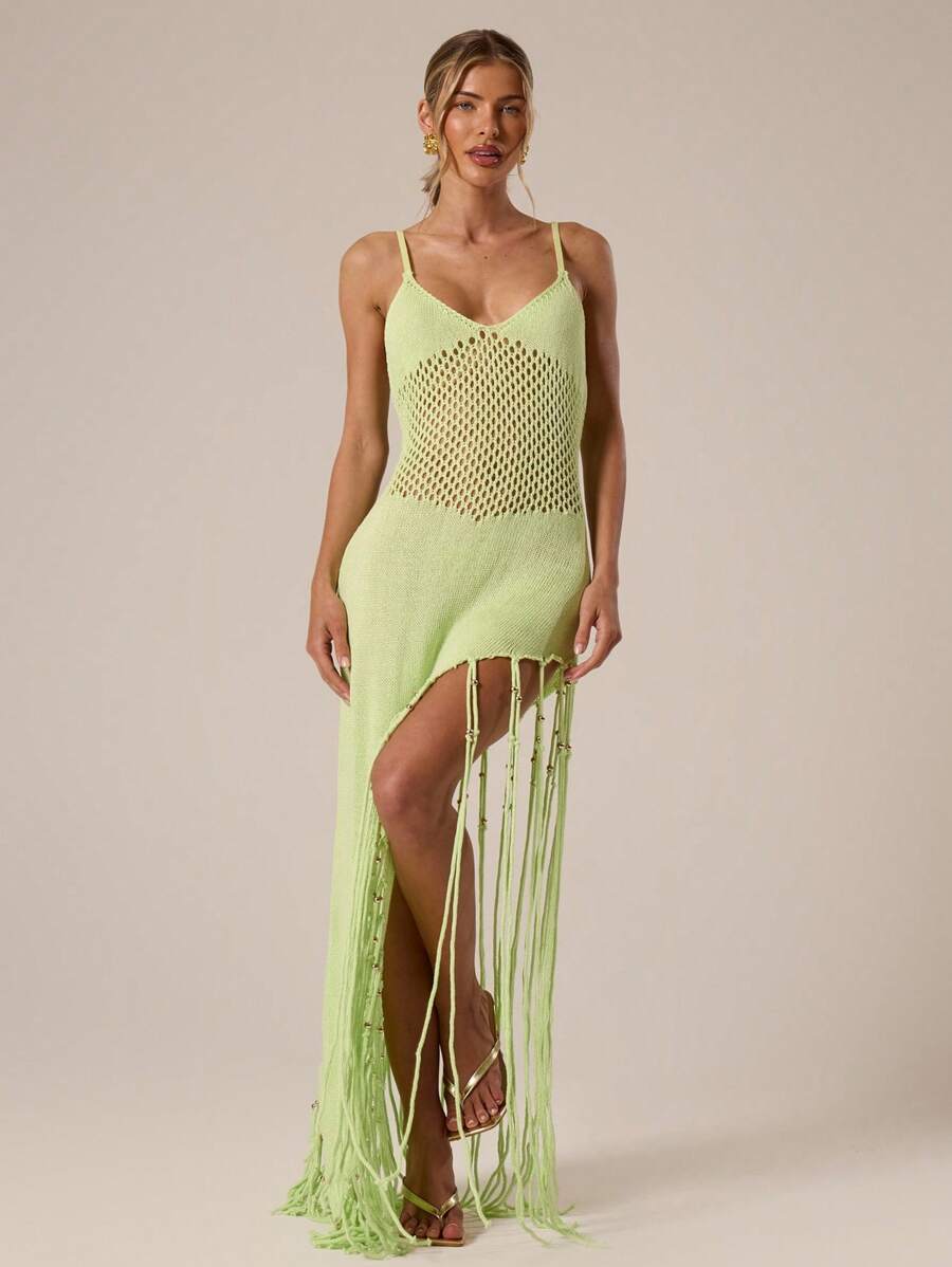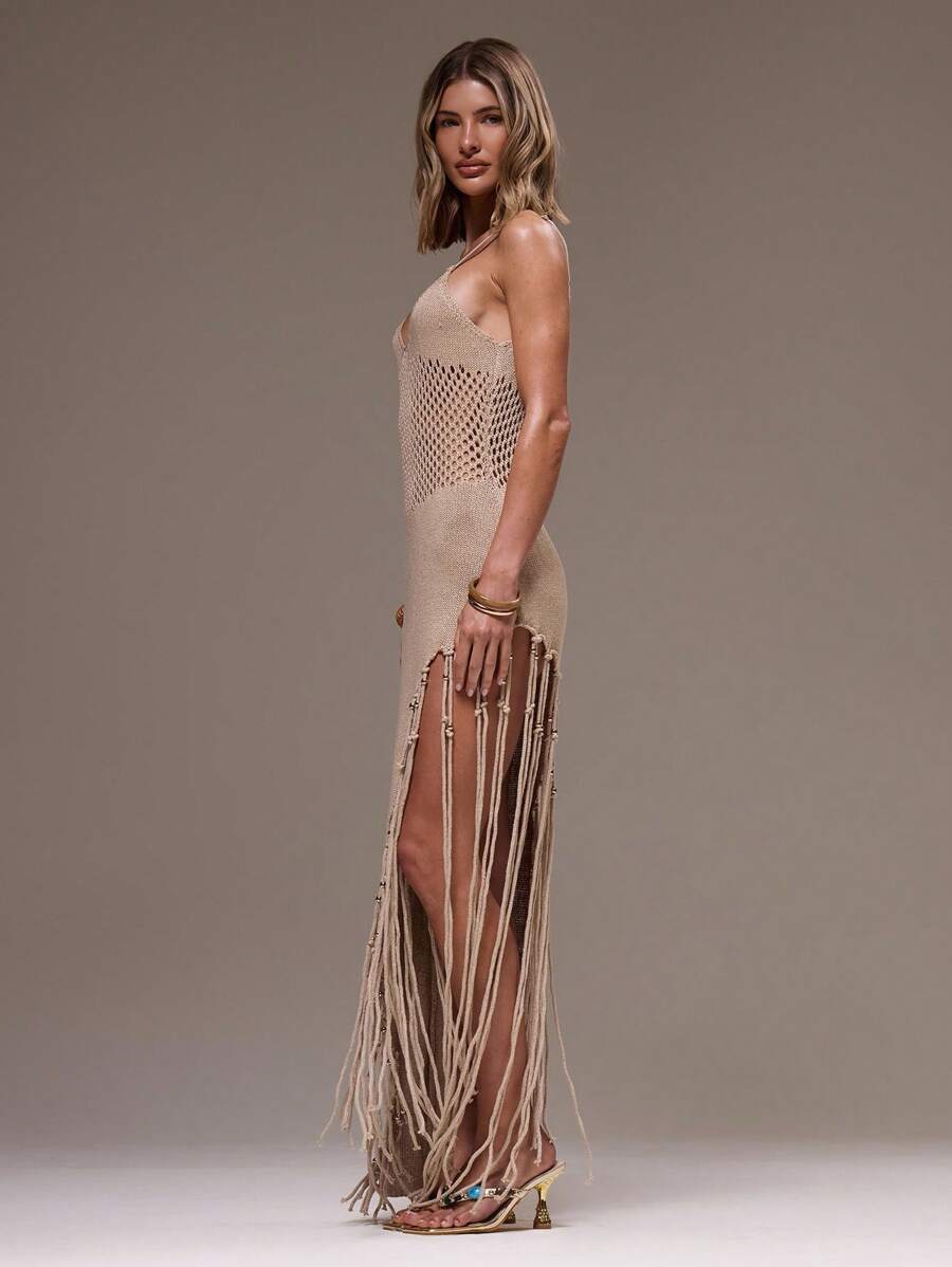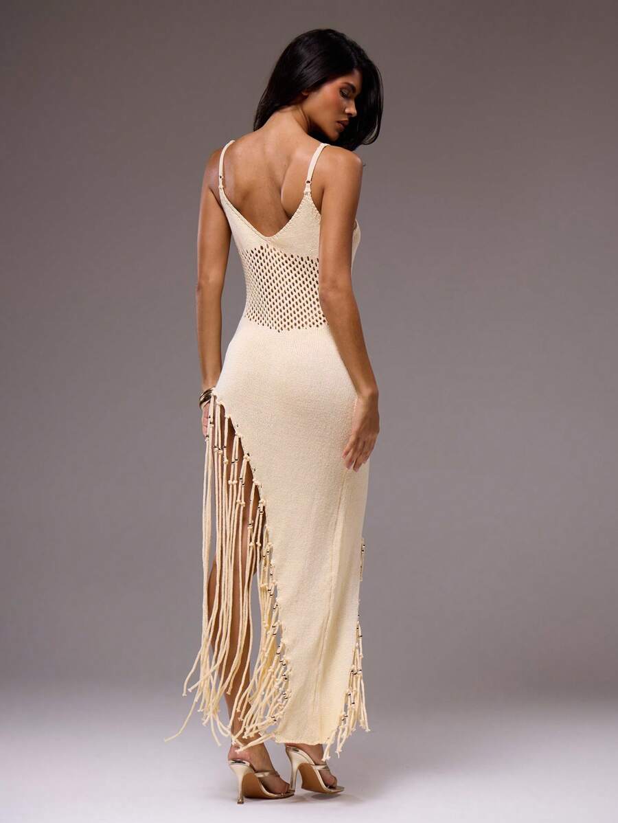 Vestido crochet de punto con detalle de flecos con cuentas, vestido ajustado largo para cubrir, estilo elegante de vacaciones en ibiza, look lindo para playa, festival y estilo boho, ropa de vacaciones de verano