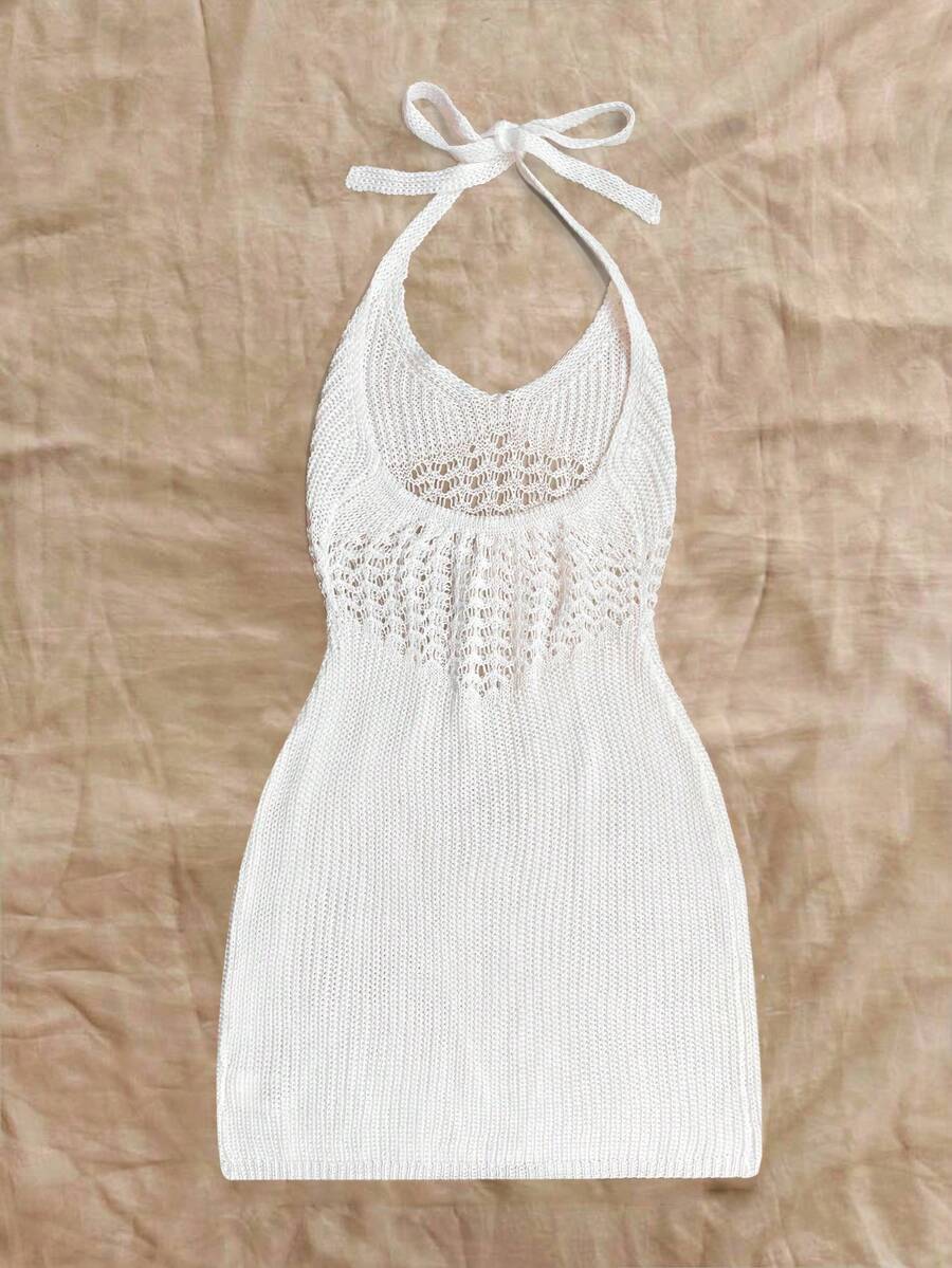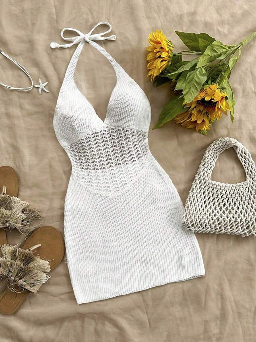 Vestido corto de verano para mujer de unicolor, estilo bohemio, sexy, transparente, de escote en v bajo y espalda descubierta