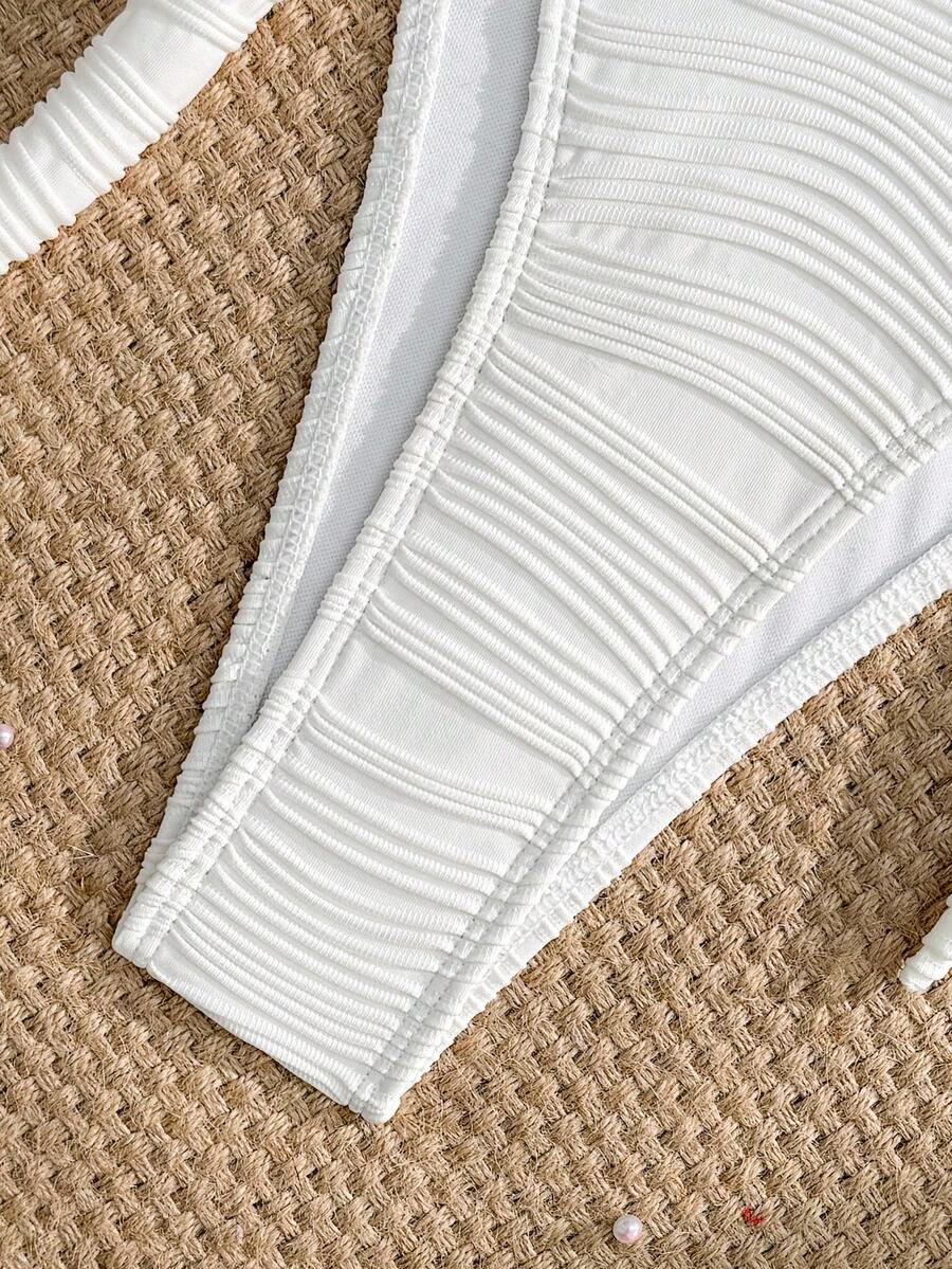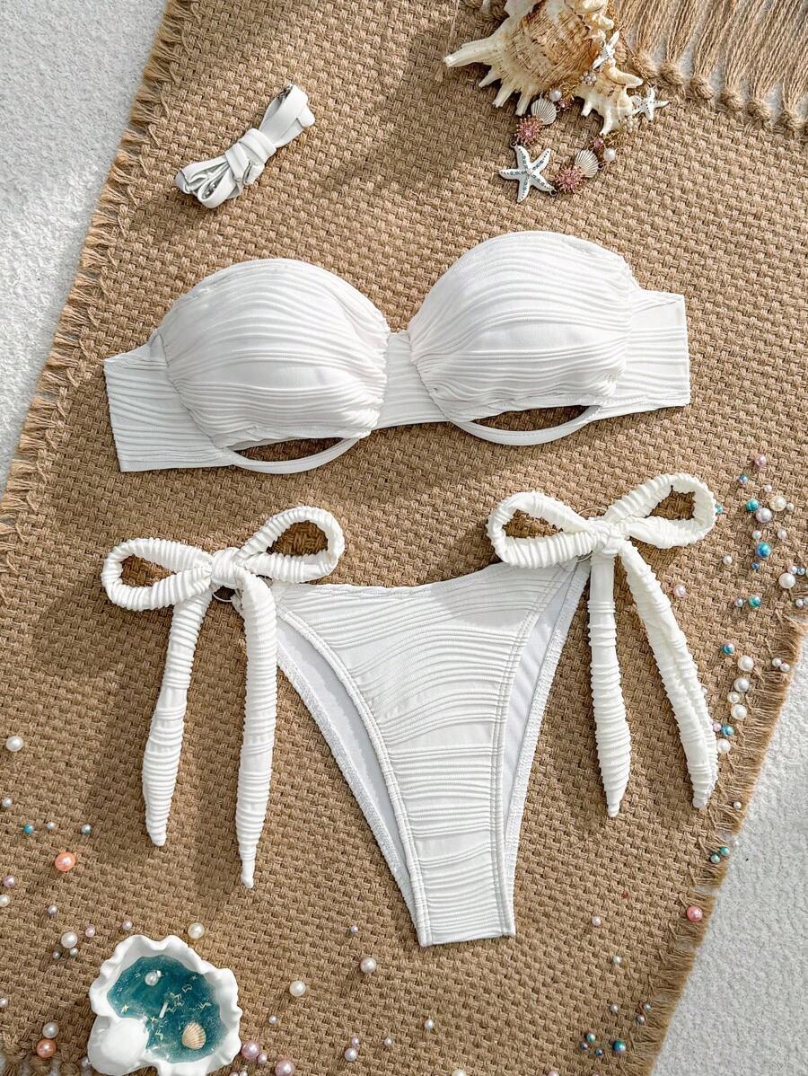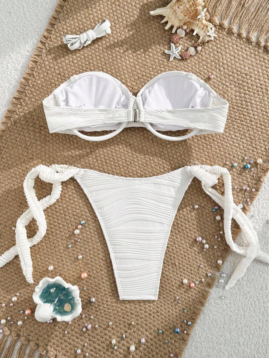 Conjunto de 2 piezas de traje de bano sexy con pantalones con cordones y brasier con aros de tela especial, todo en blanco