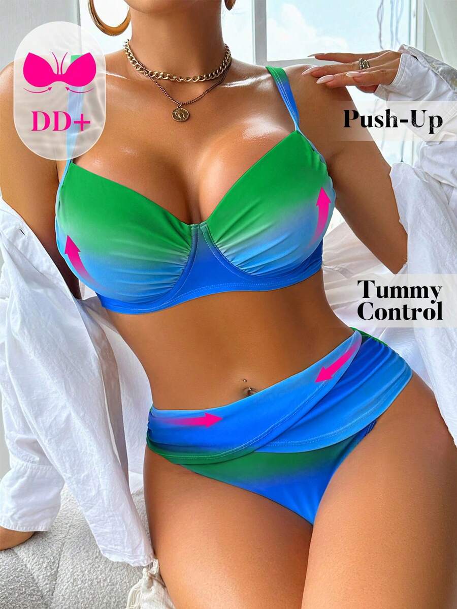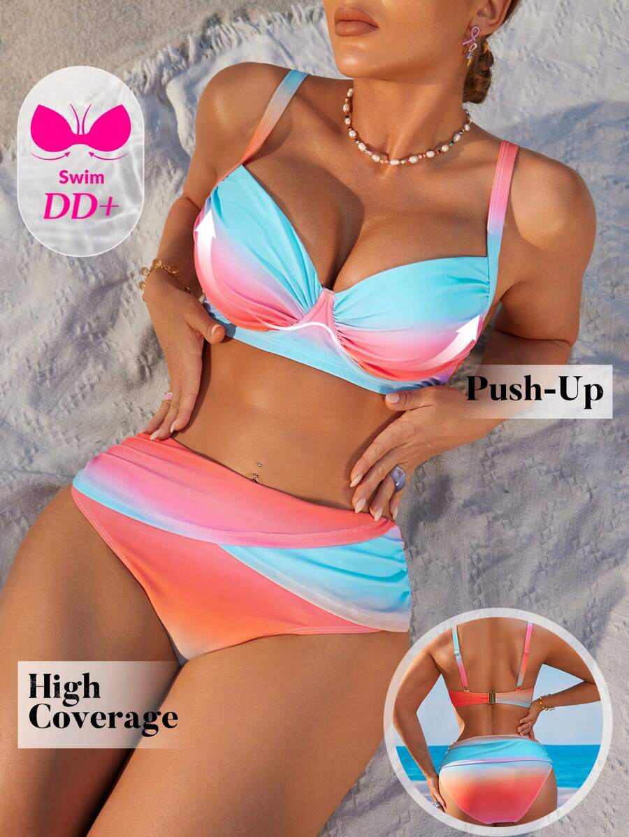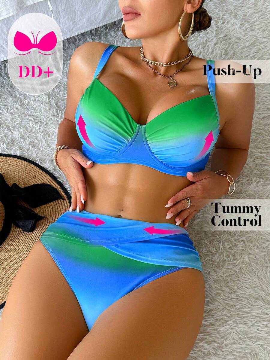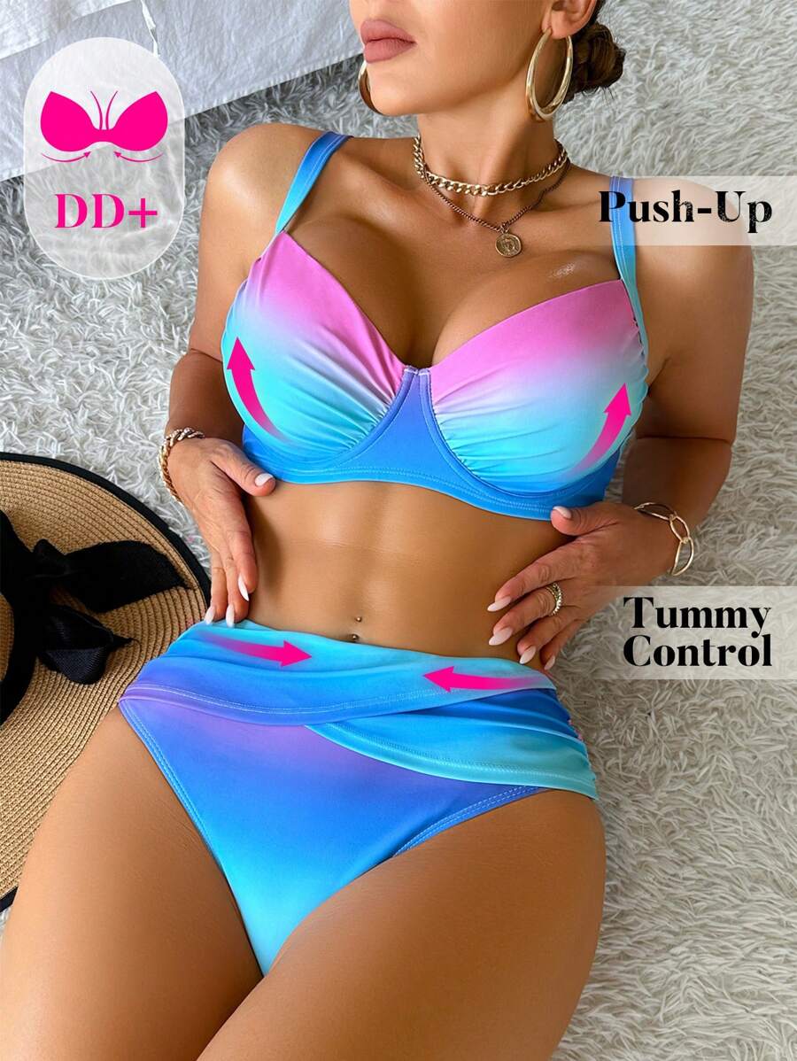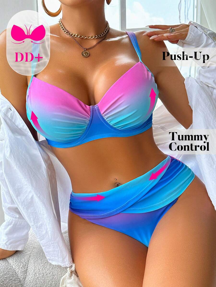 Dd+ conjunto de traje de bano tipo tankini con brasier con aros y plisados en degradado