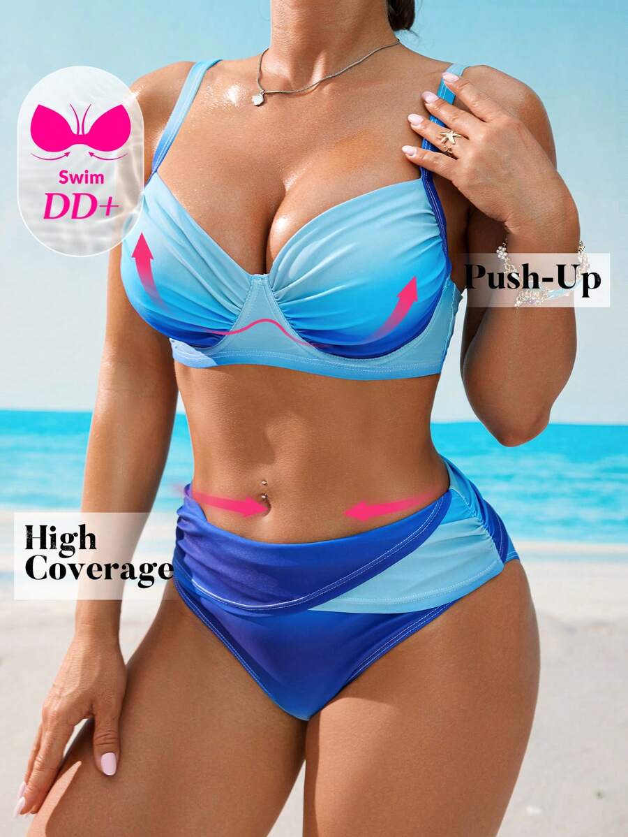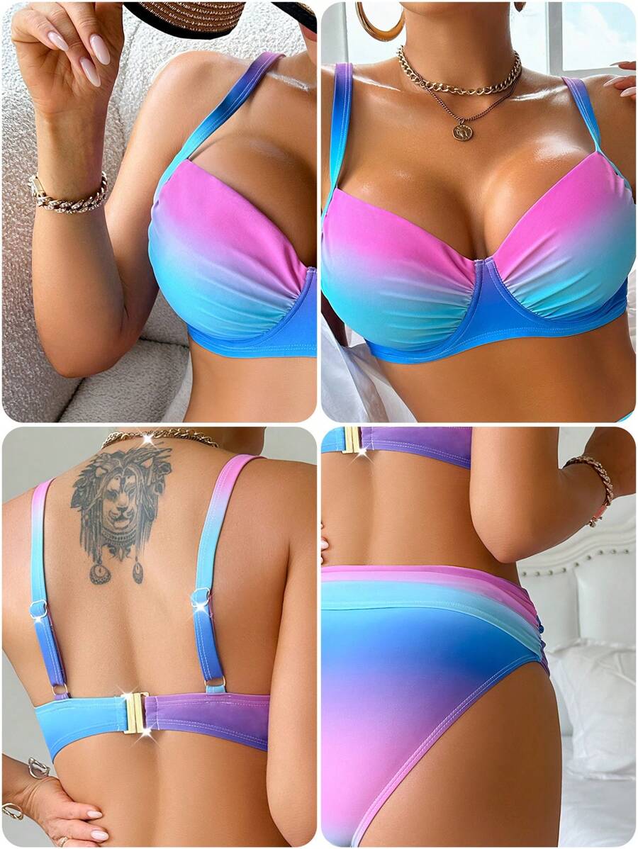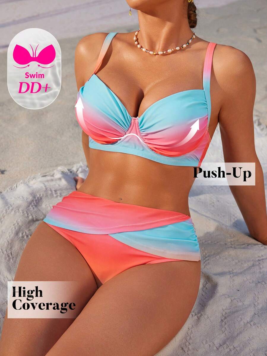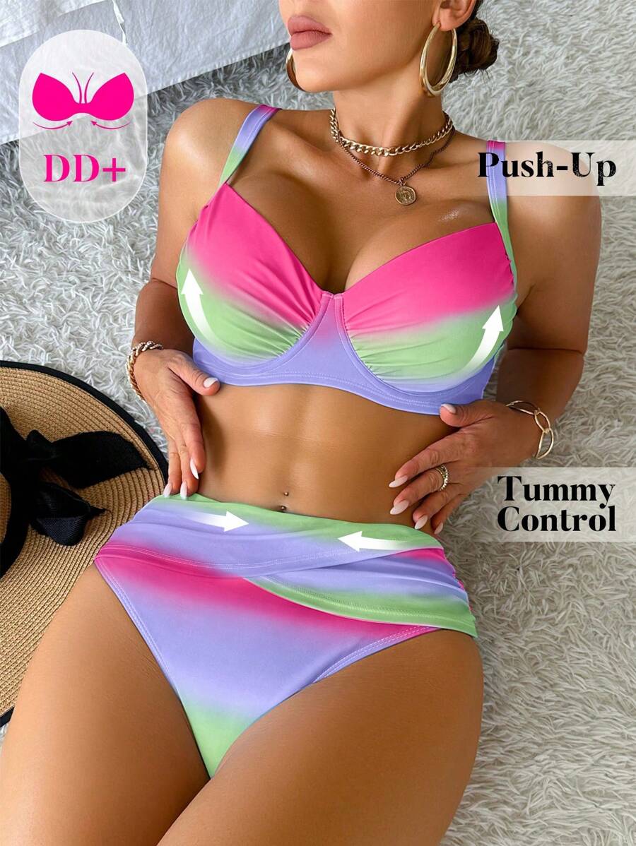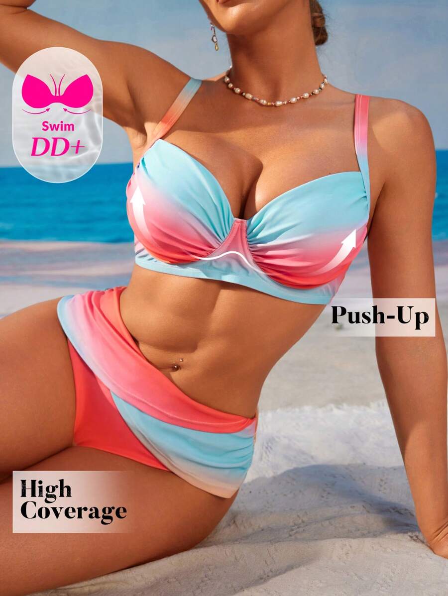 Dd+ conjunto de traje de bano tipo tankini con brasier con aros y plisados en degradado