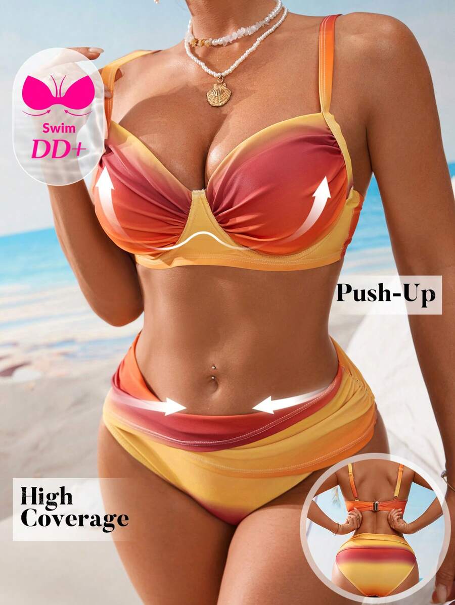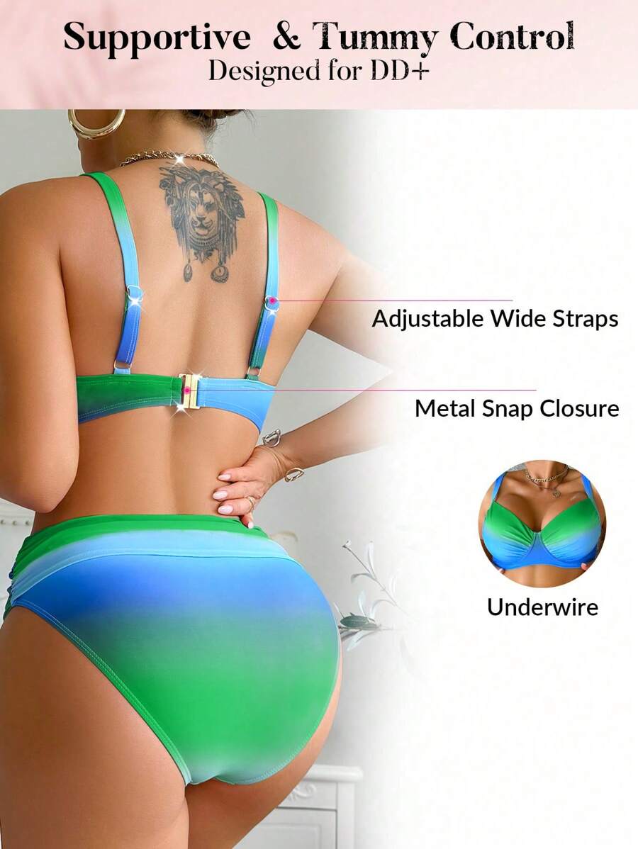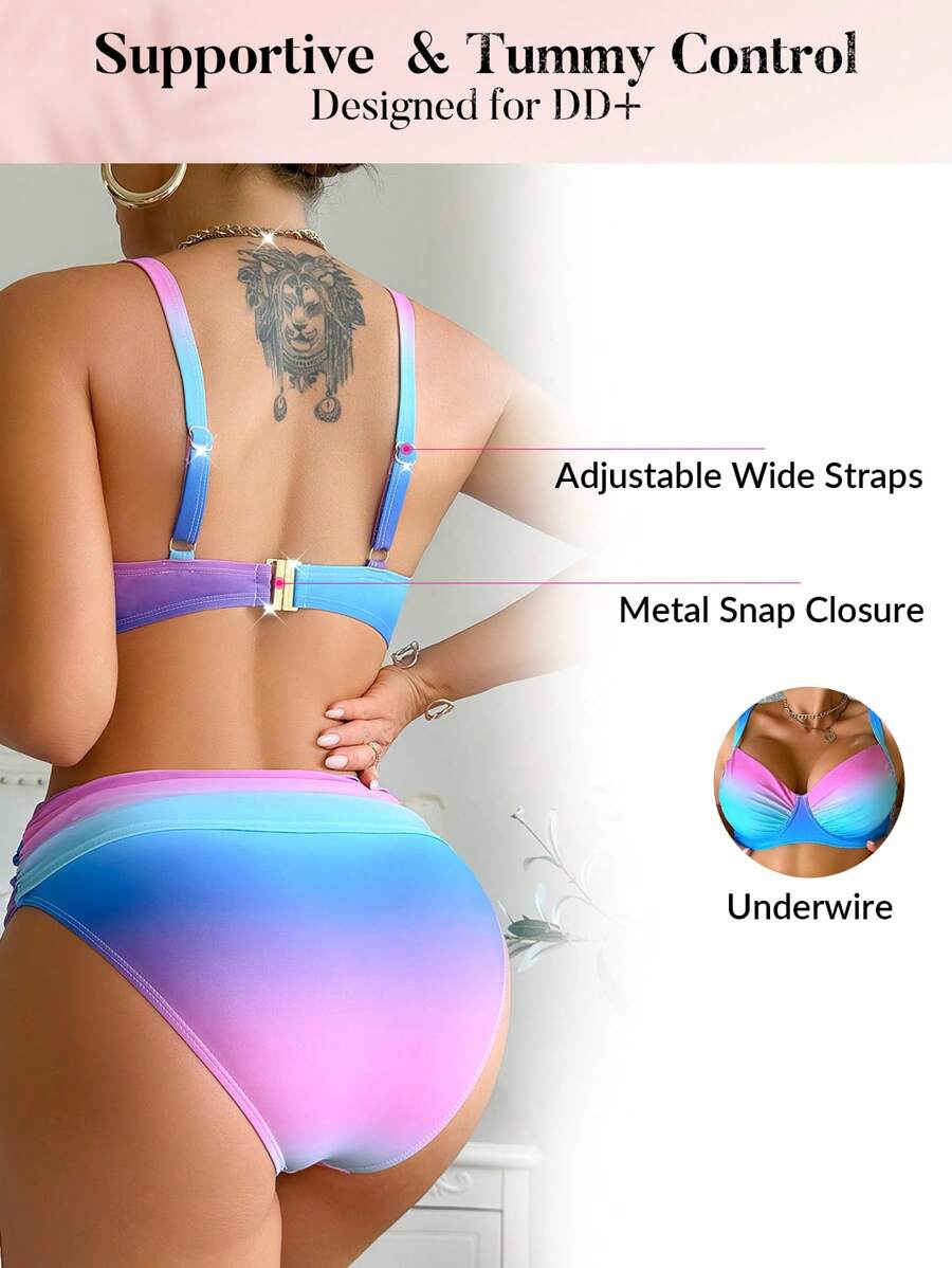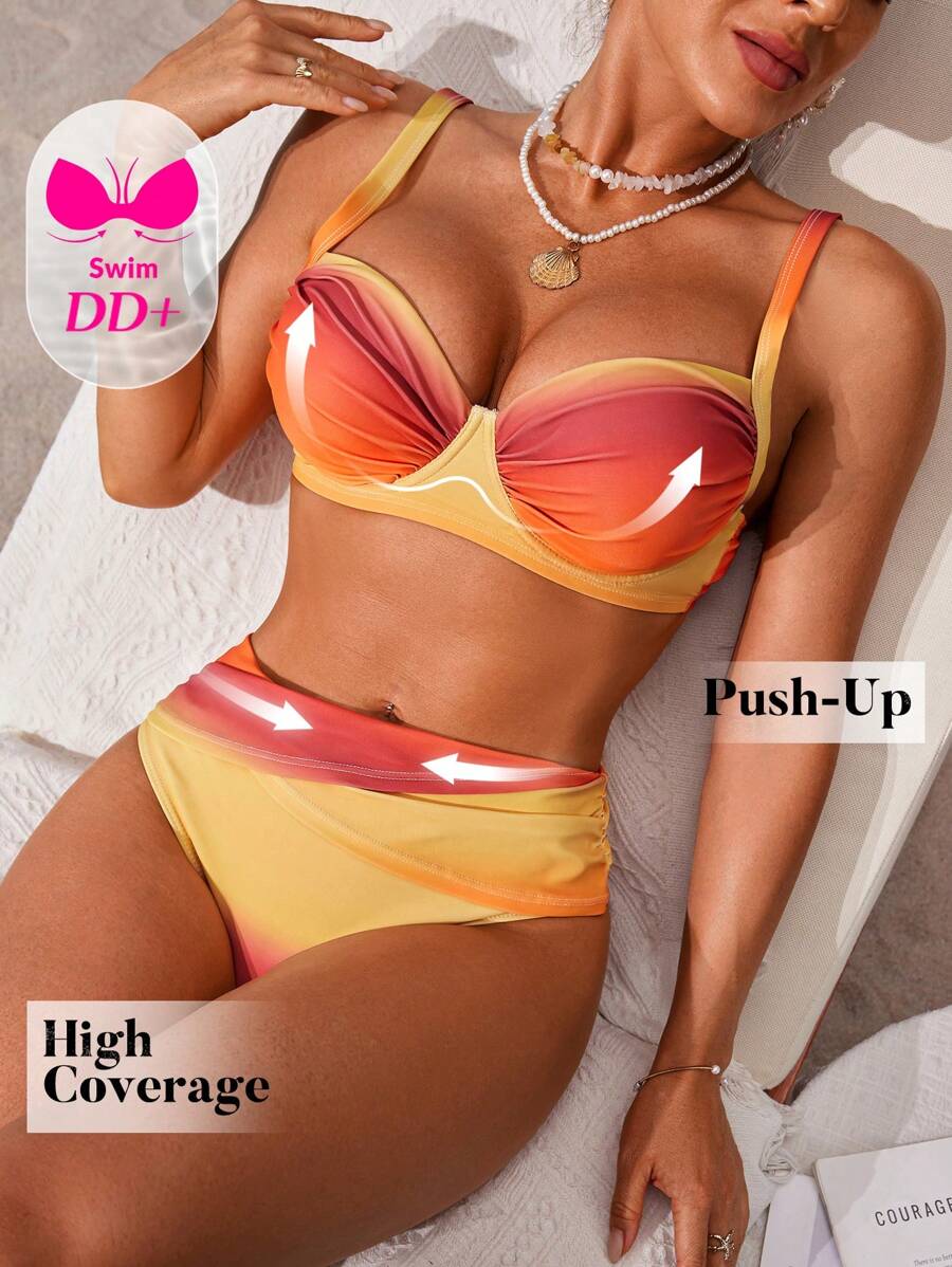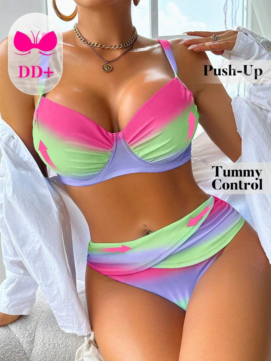 Dd+ conjunto de traje de bano tipo tankini con brasier con aros y plisados en degradado