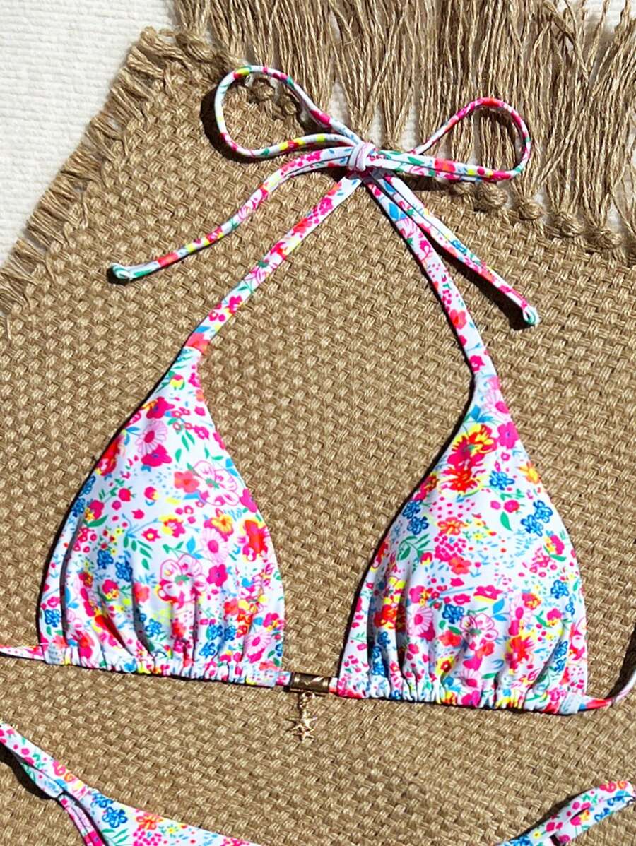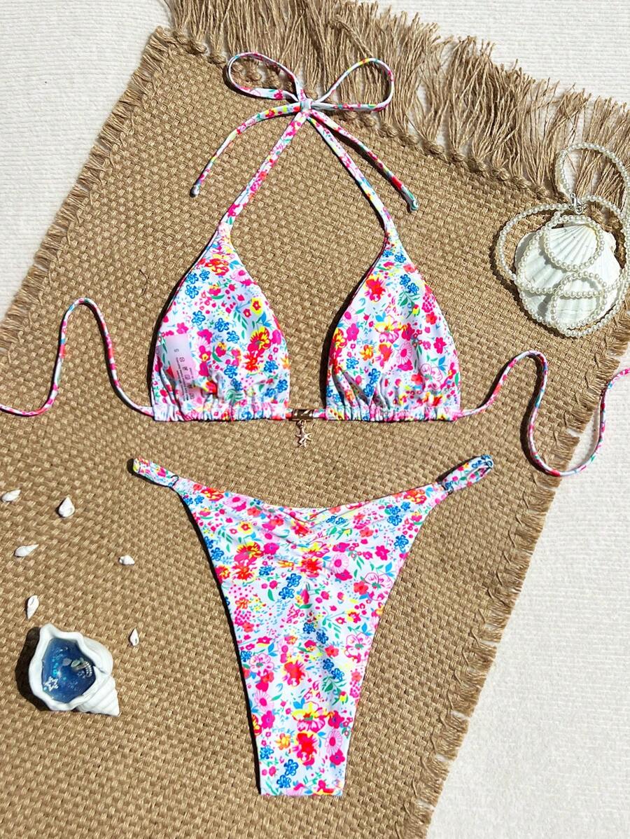 Conjunto de 2 piezas nuevo bikini de tajo alto con nudo lateral y estampado floral ditsy, traje de bano para vacaciones en la playa para mujeres