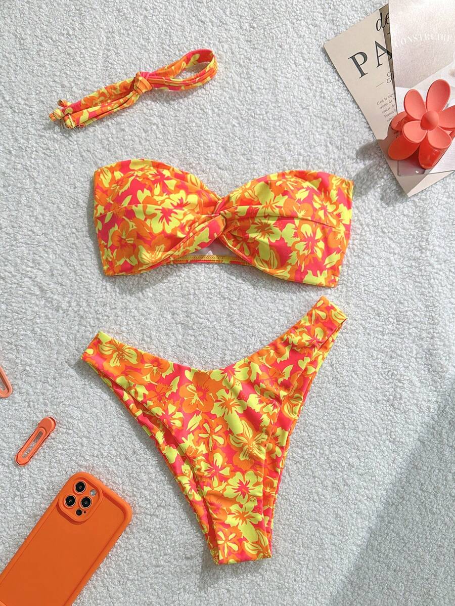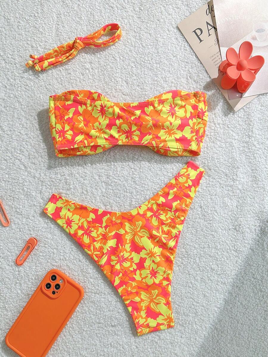 Conjunto de bikini de vacaciones de primavera/verano para mujer con parte superior brasier sin tirantes enrollada y bottom de corte alto con estampado aleatorio