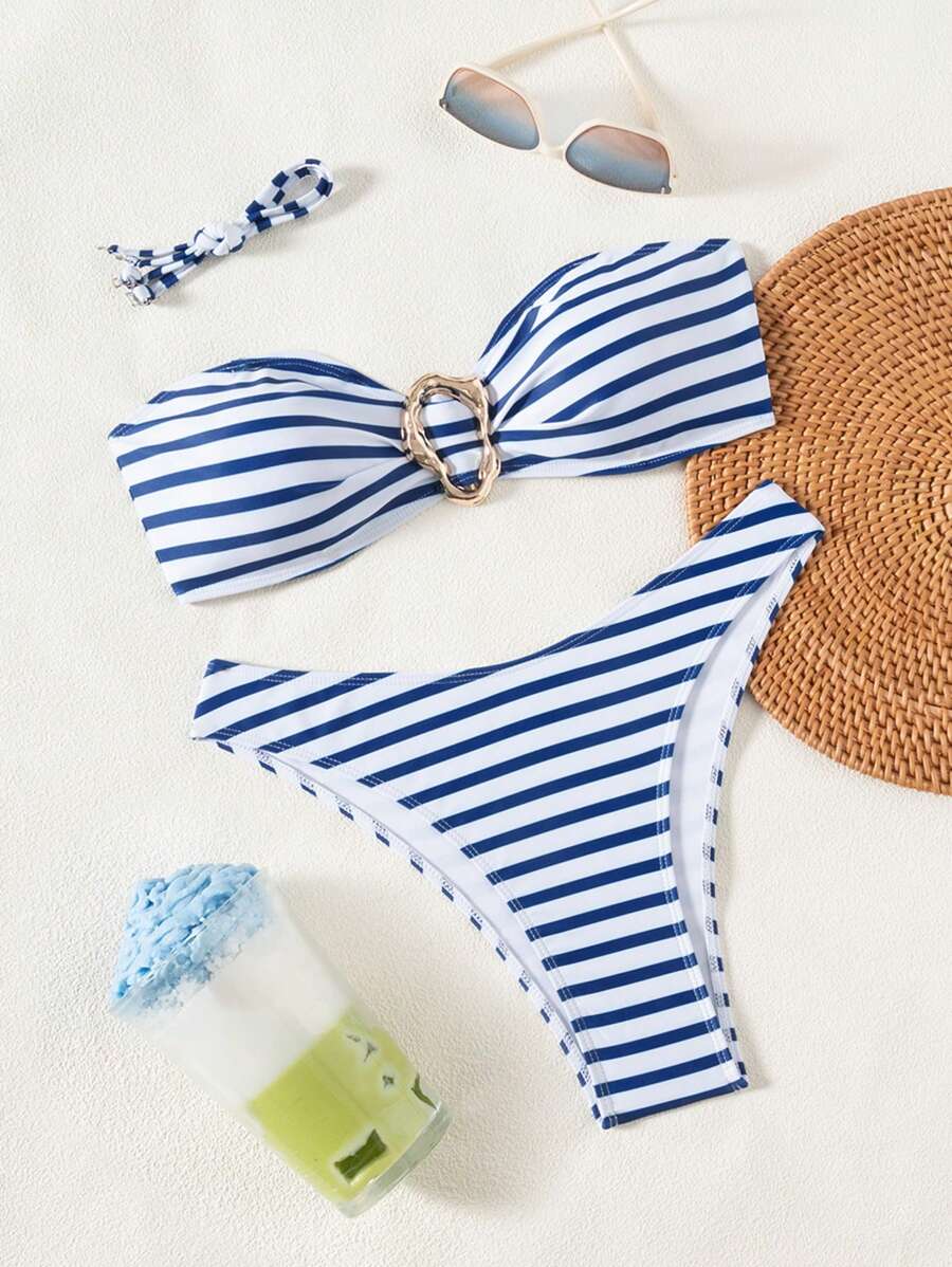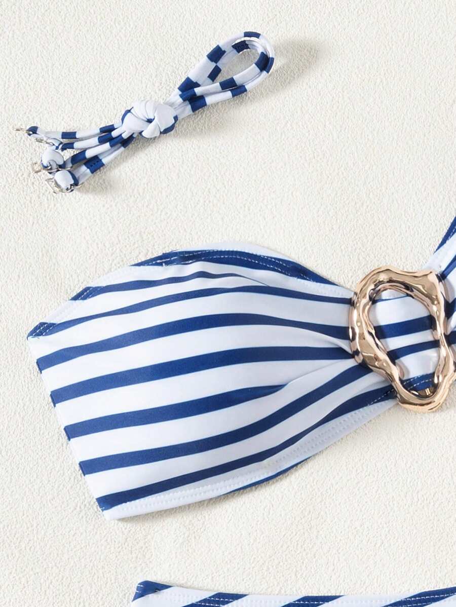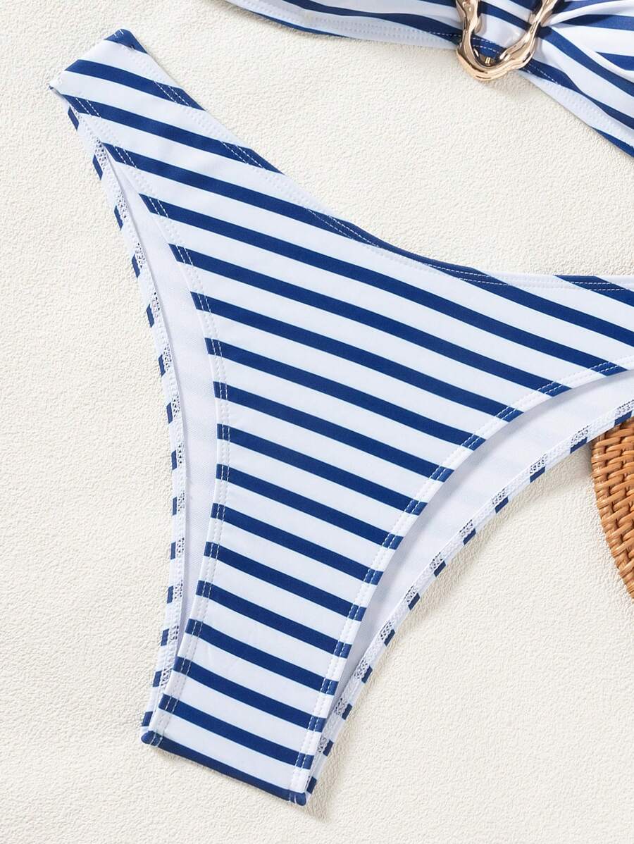 Nuevos conjuntos de playa europeos y americanos para mujeres: shorts de talle alto con estampado floral de rayas azules y blancas, bikini de 2 piezas con decoracion metalica sexy, bikini revelador, bikini sexy
