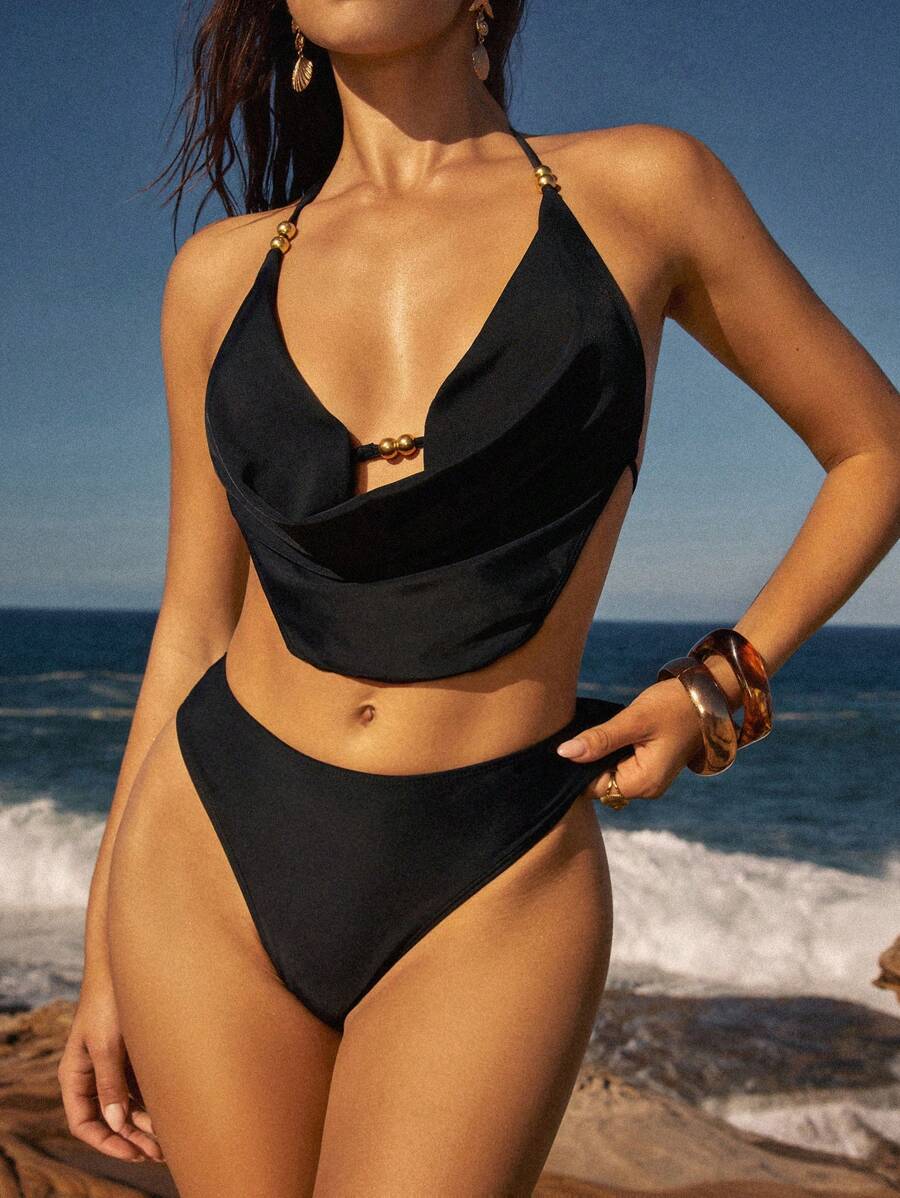 Conjunto de traje de bano con escote de cuchara y decoracion metalica, elegante