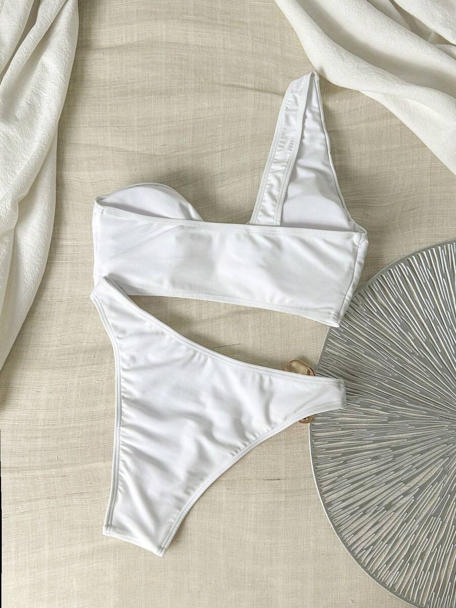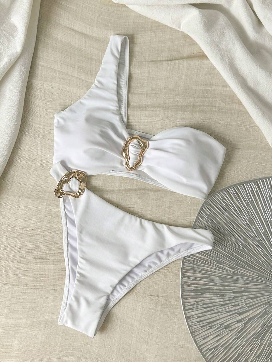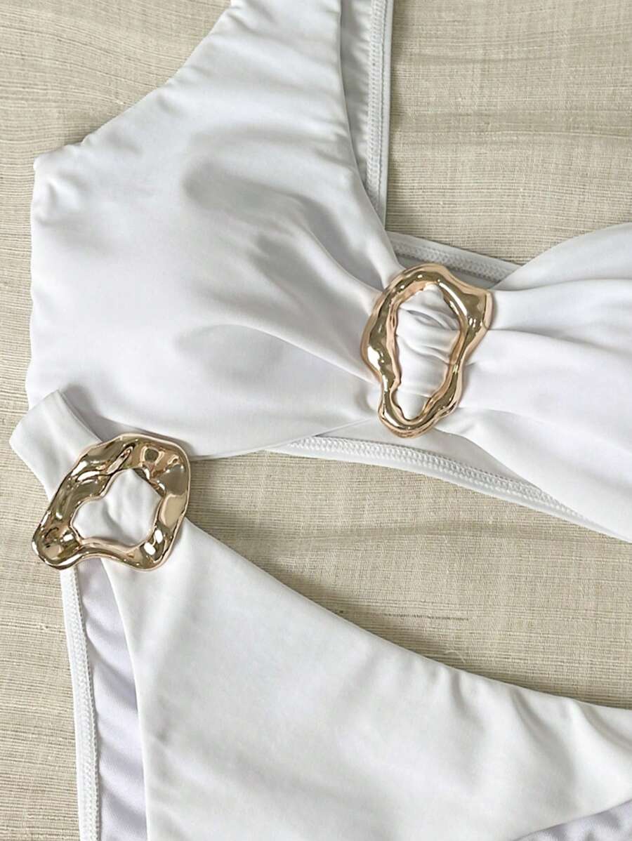 Bikini de 2 piezas de color blanco solido con acentos metalicos, sexy – Muy Bonita