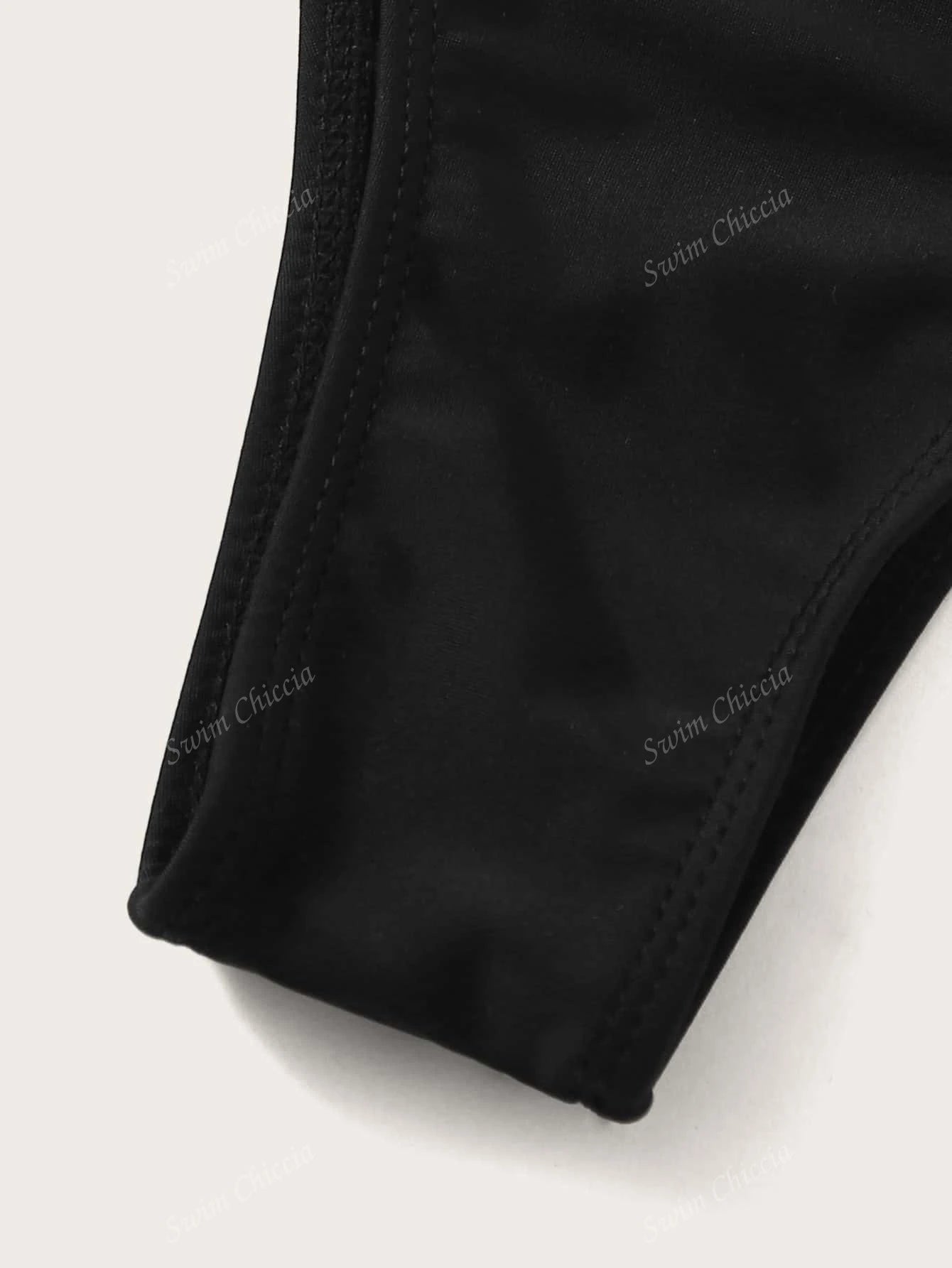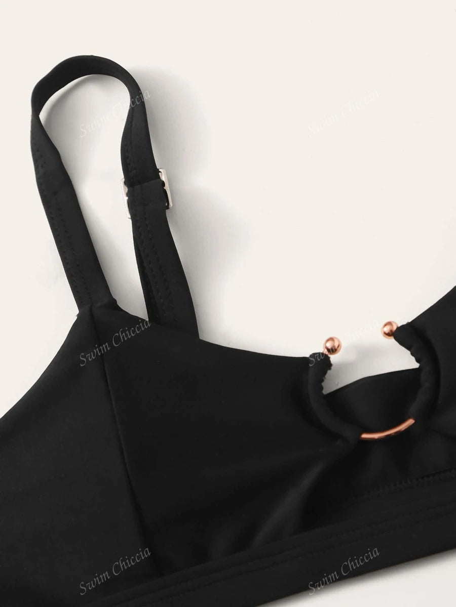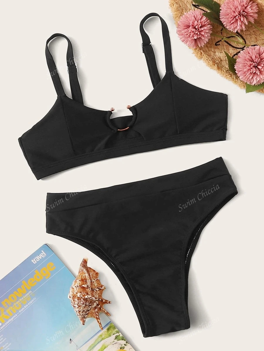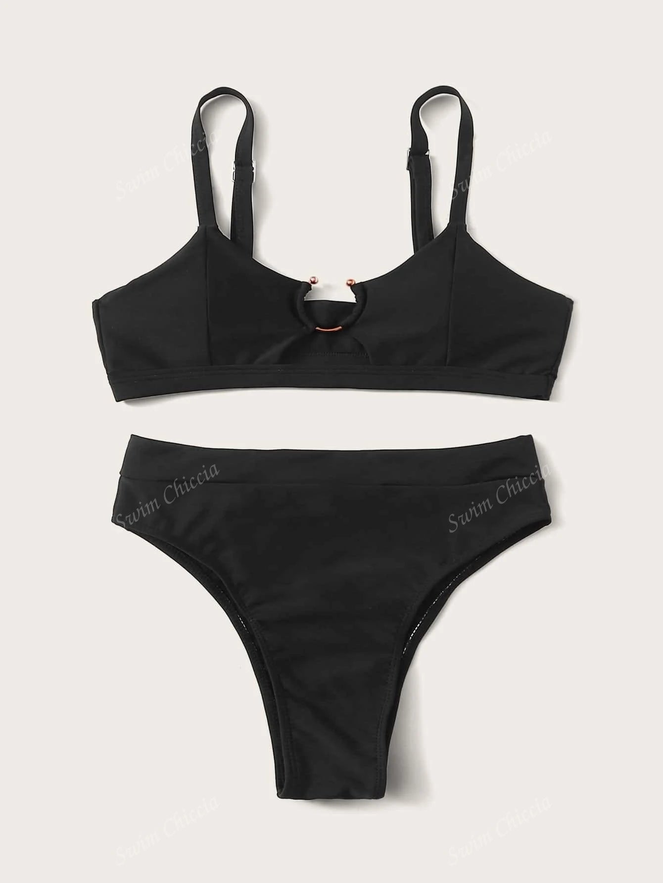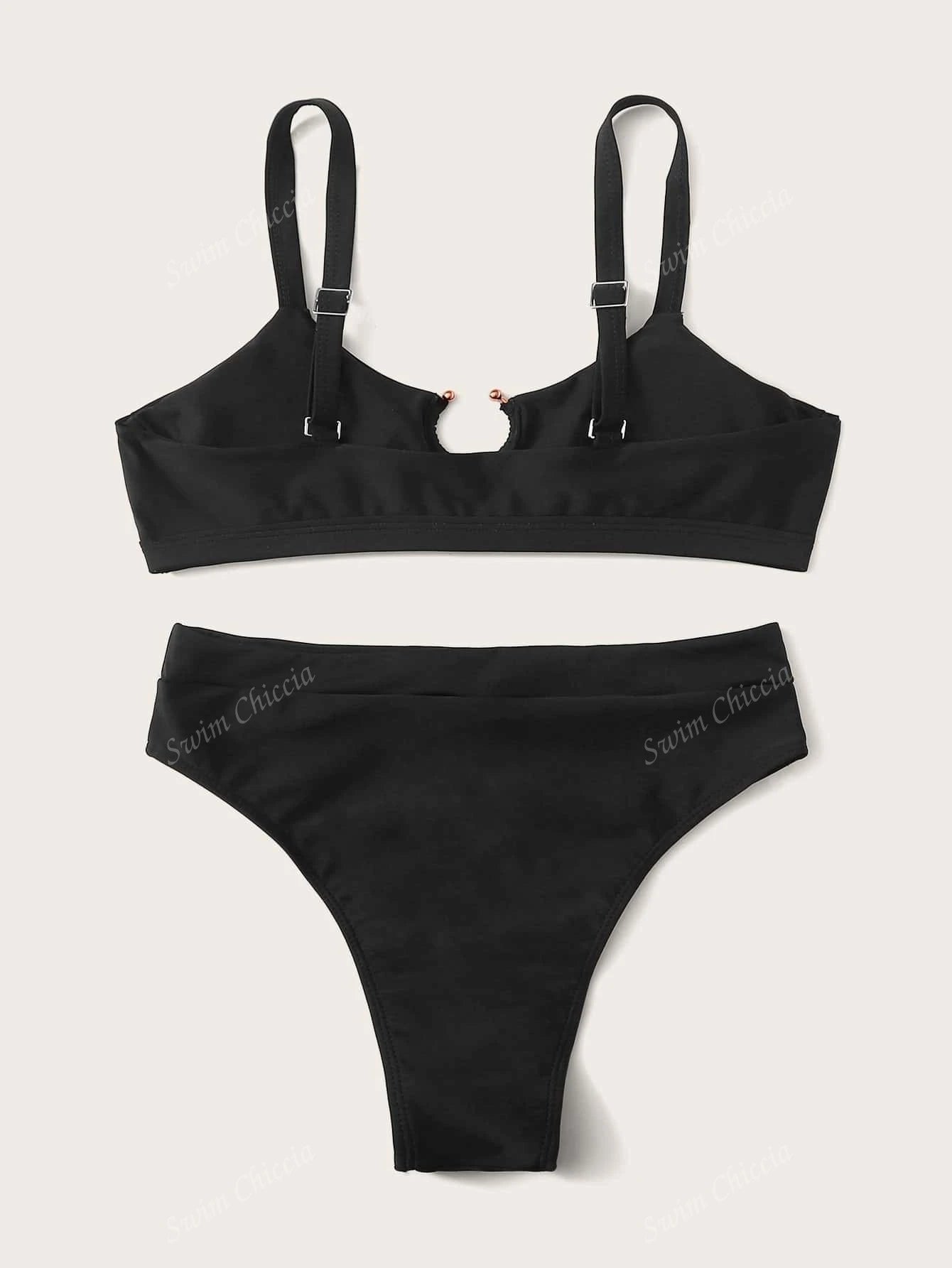 Conjunto de bikini de una sola pieza para playa de verano con brasier tipo cami con anillo de ajuste y tiras ajustables, y bottom de cintura alta de 2 piezas