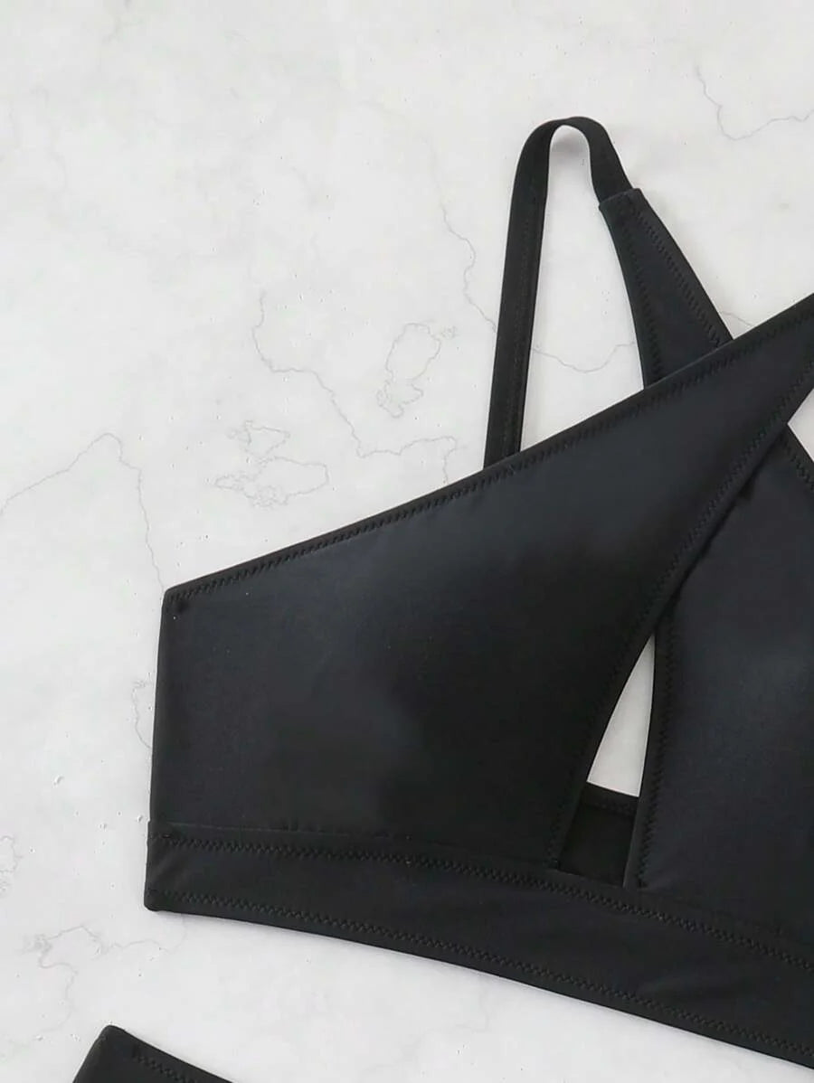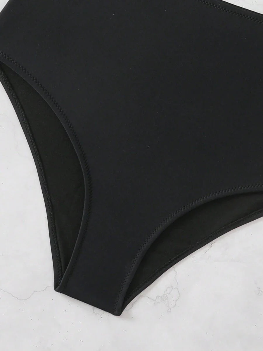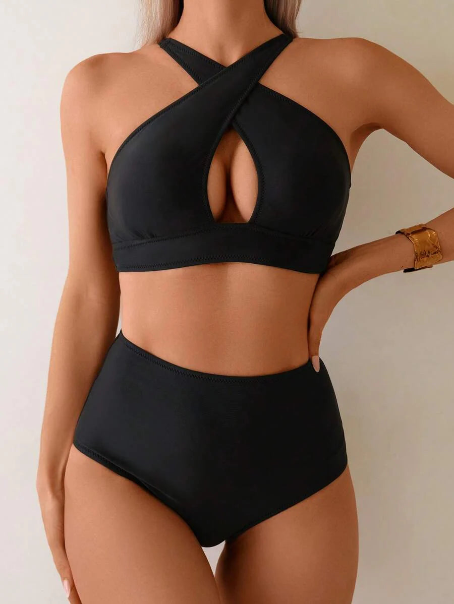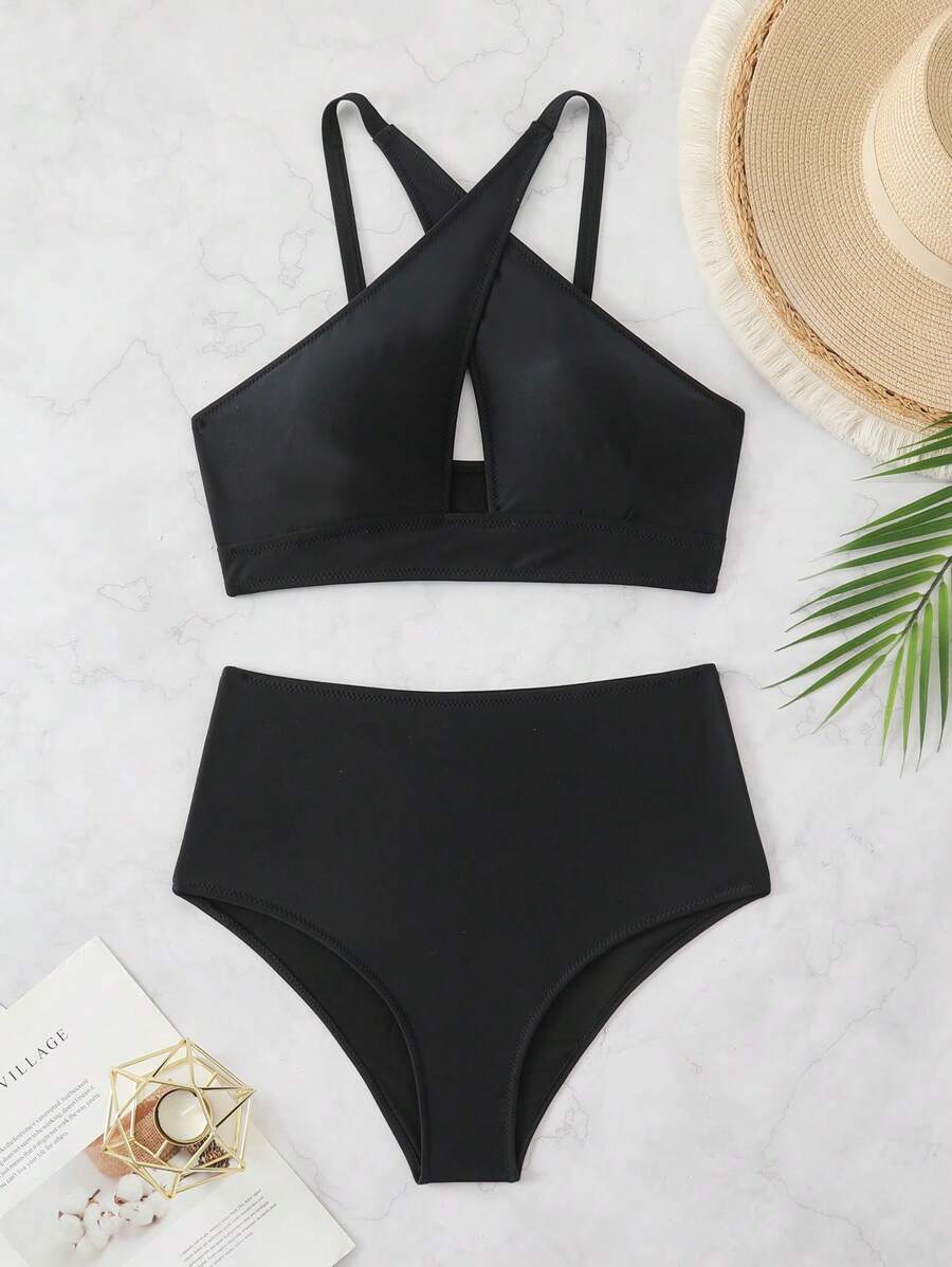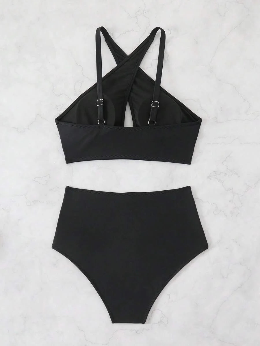Conjunto de bikini de 2 piezas con top cruzado con recortes en el frente y pantalones de cintura alta, en color negro, para verano y vacaciones en la playa