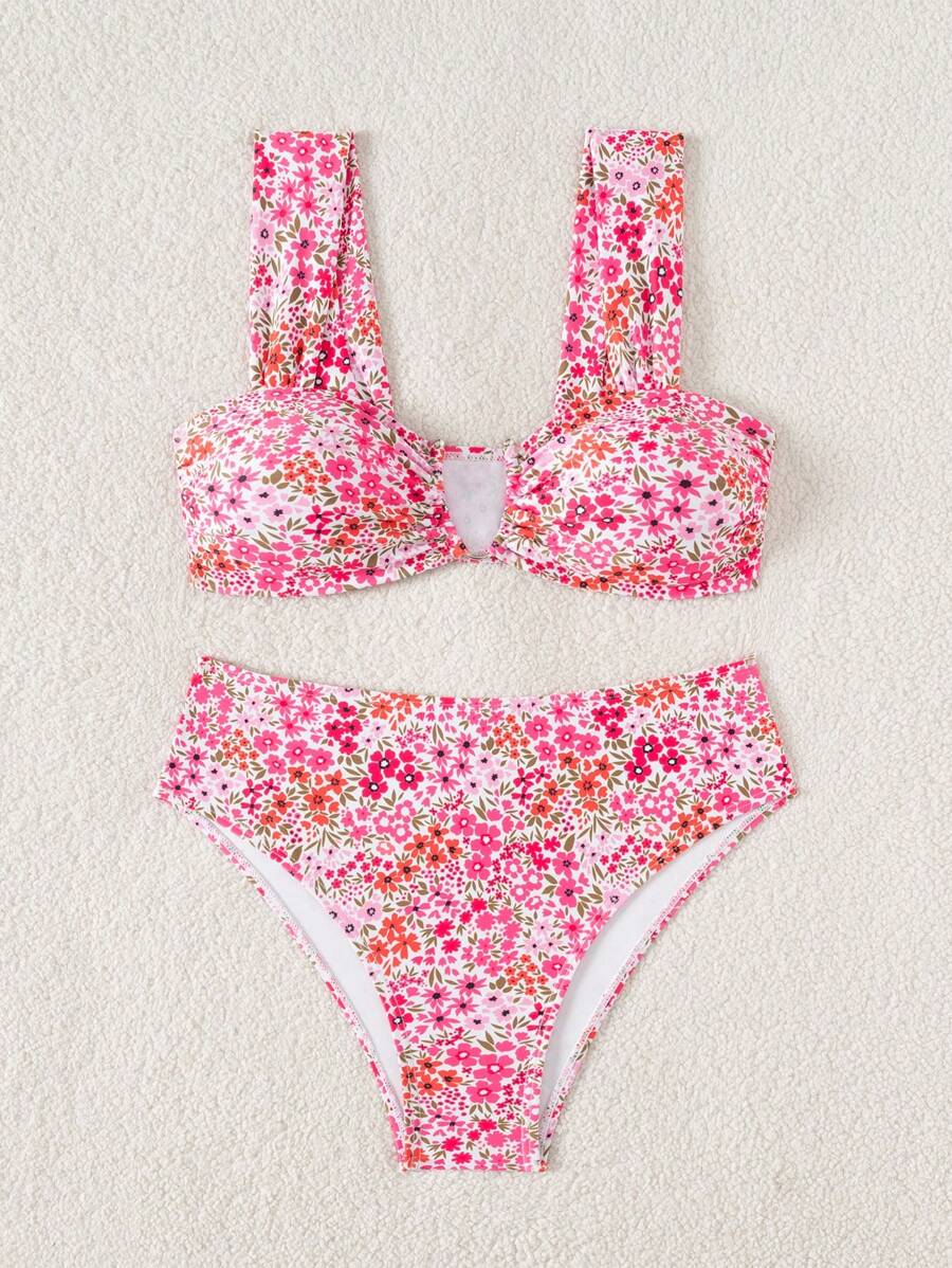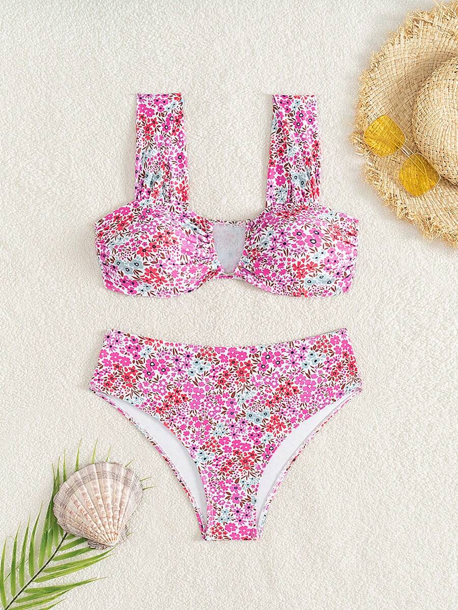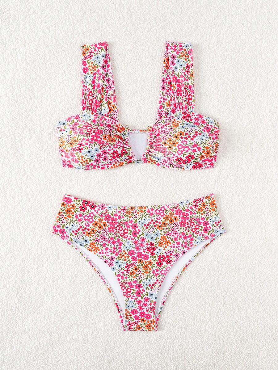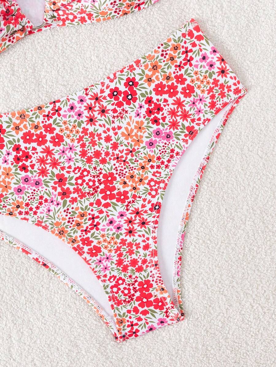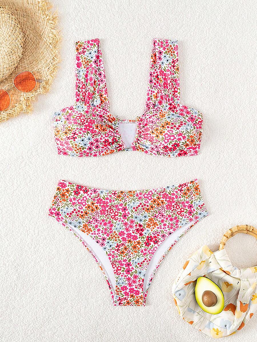 Conjunto de bikini de mujer con cuello de halter de escote en v y estampado floral pequeno, traje de bano para vacaciones