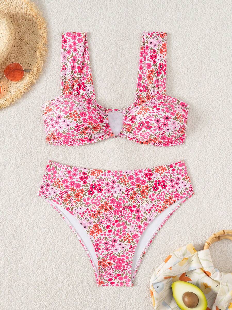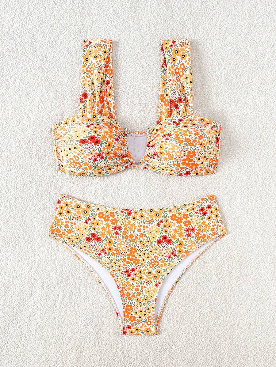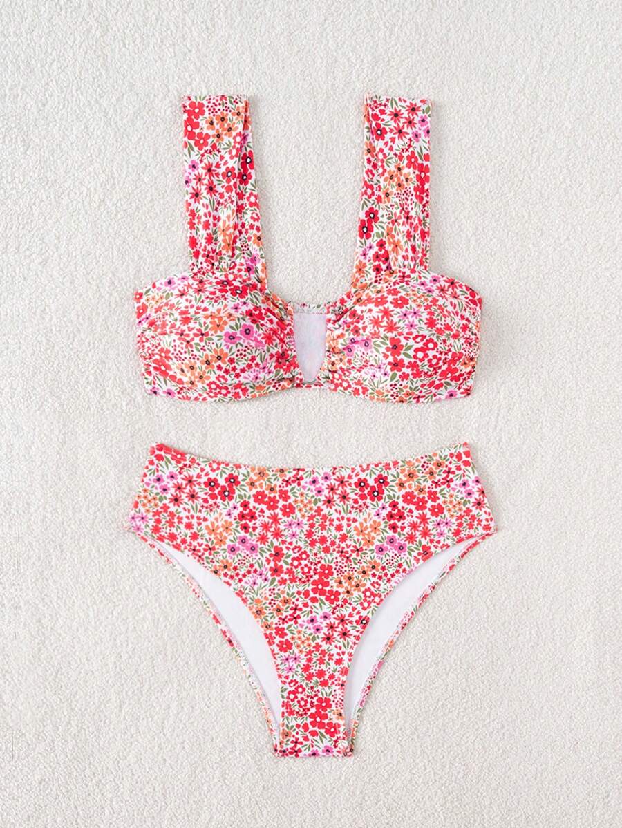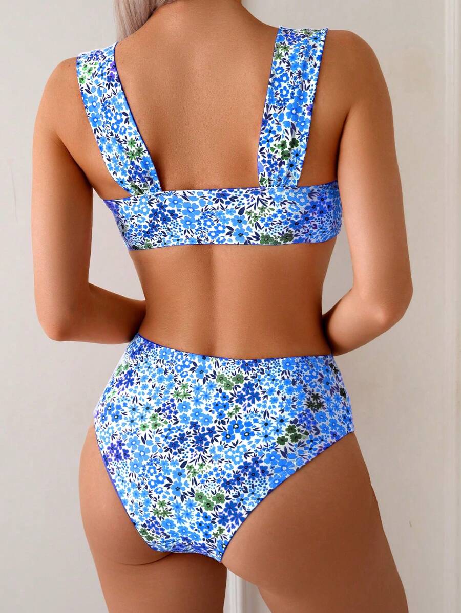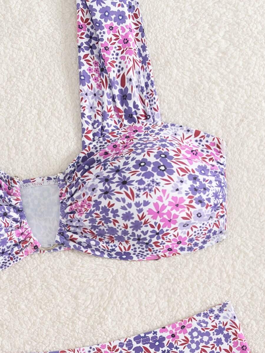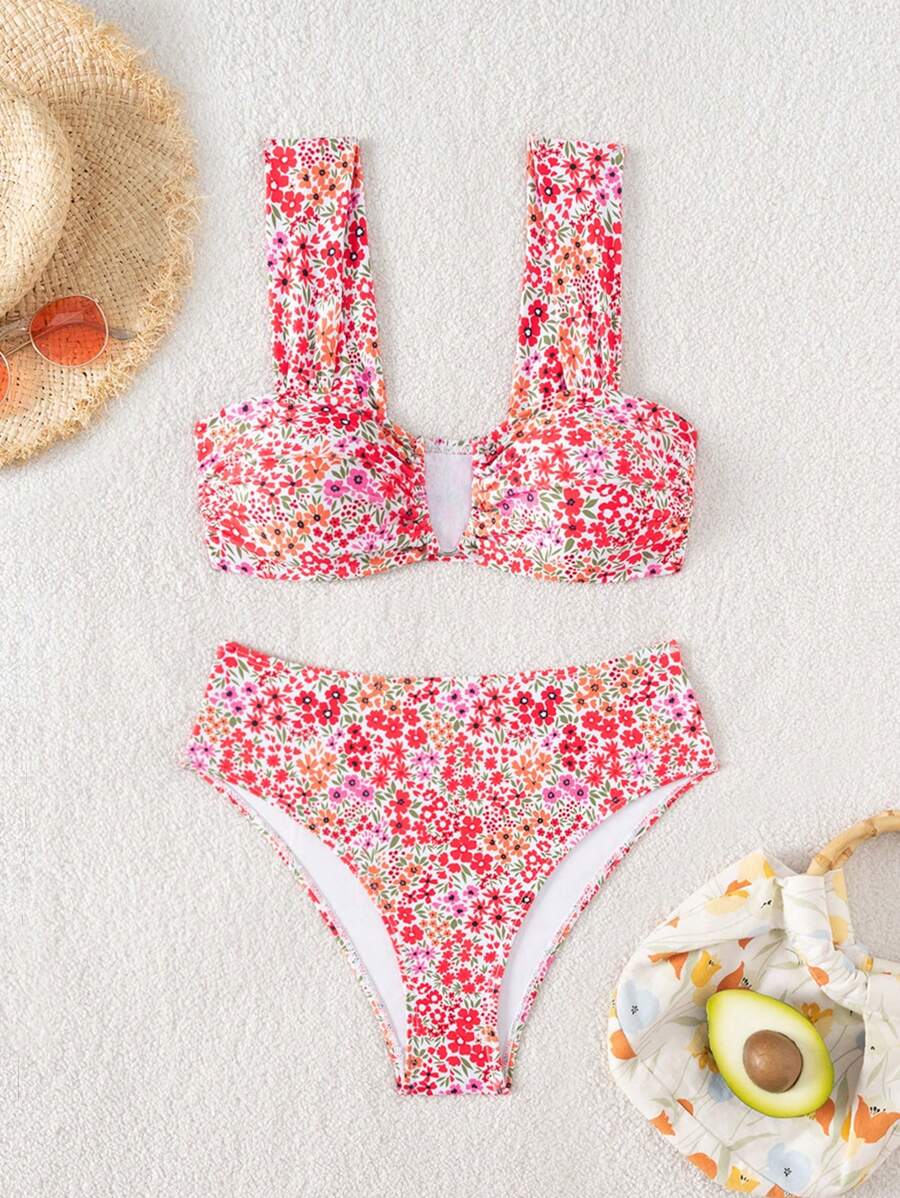 Conjunto de bikini de mujer con cuello de halter de escote en v y estampado floral pequeno, traje de bano para vacaciones