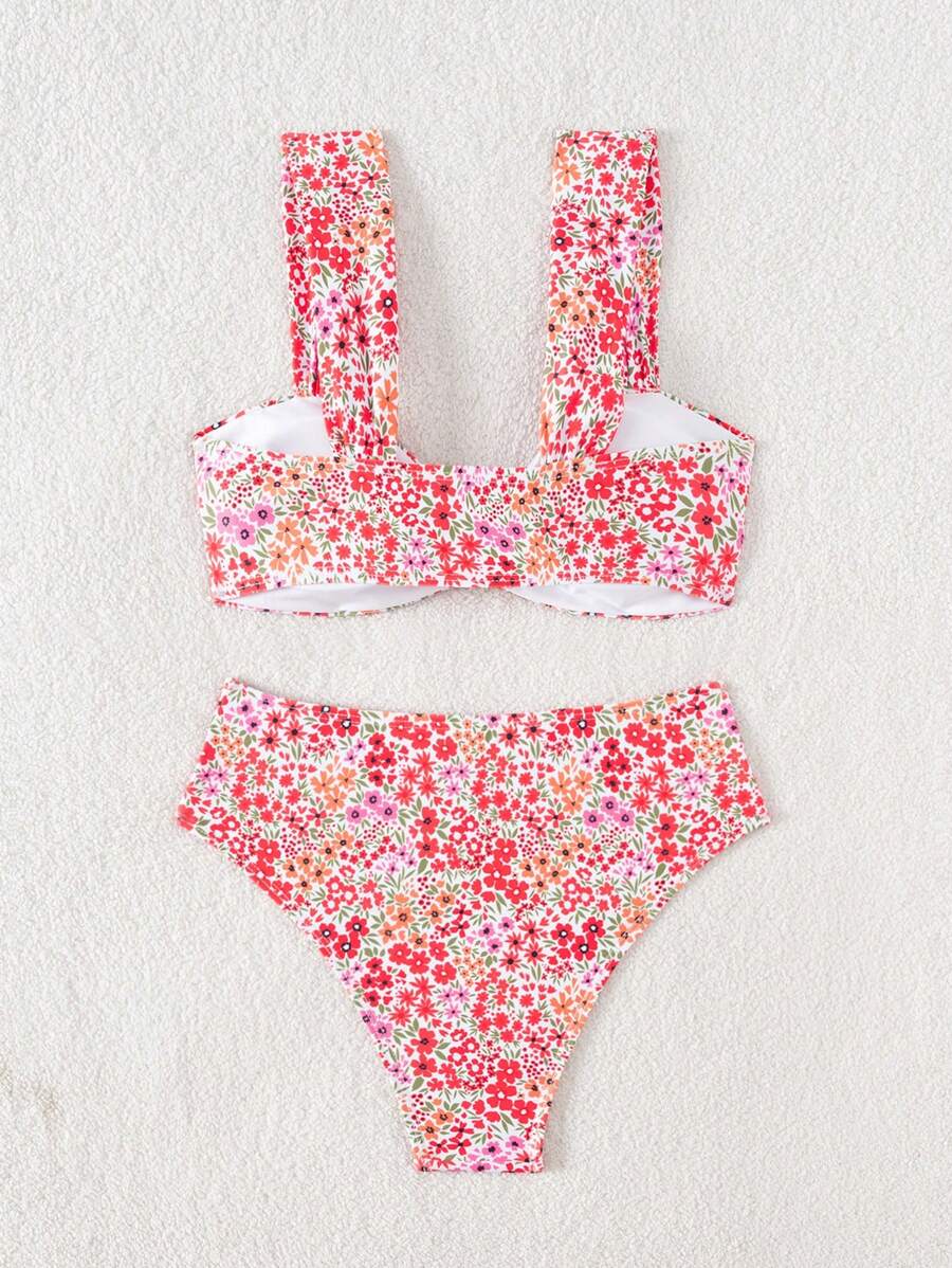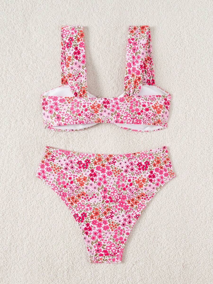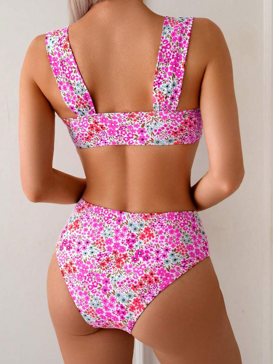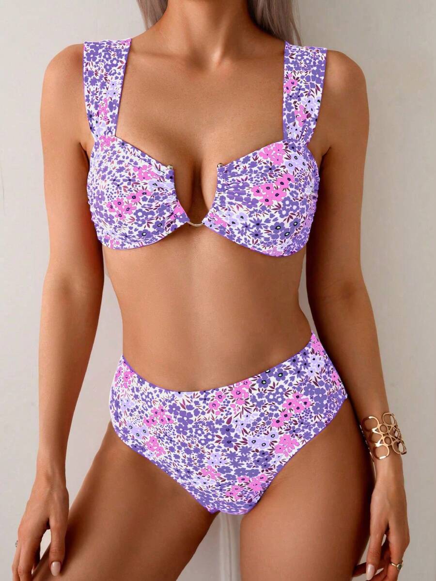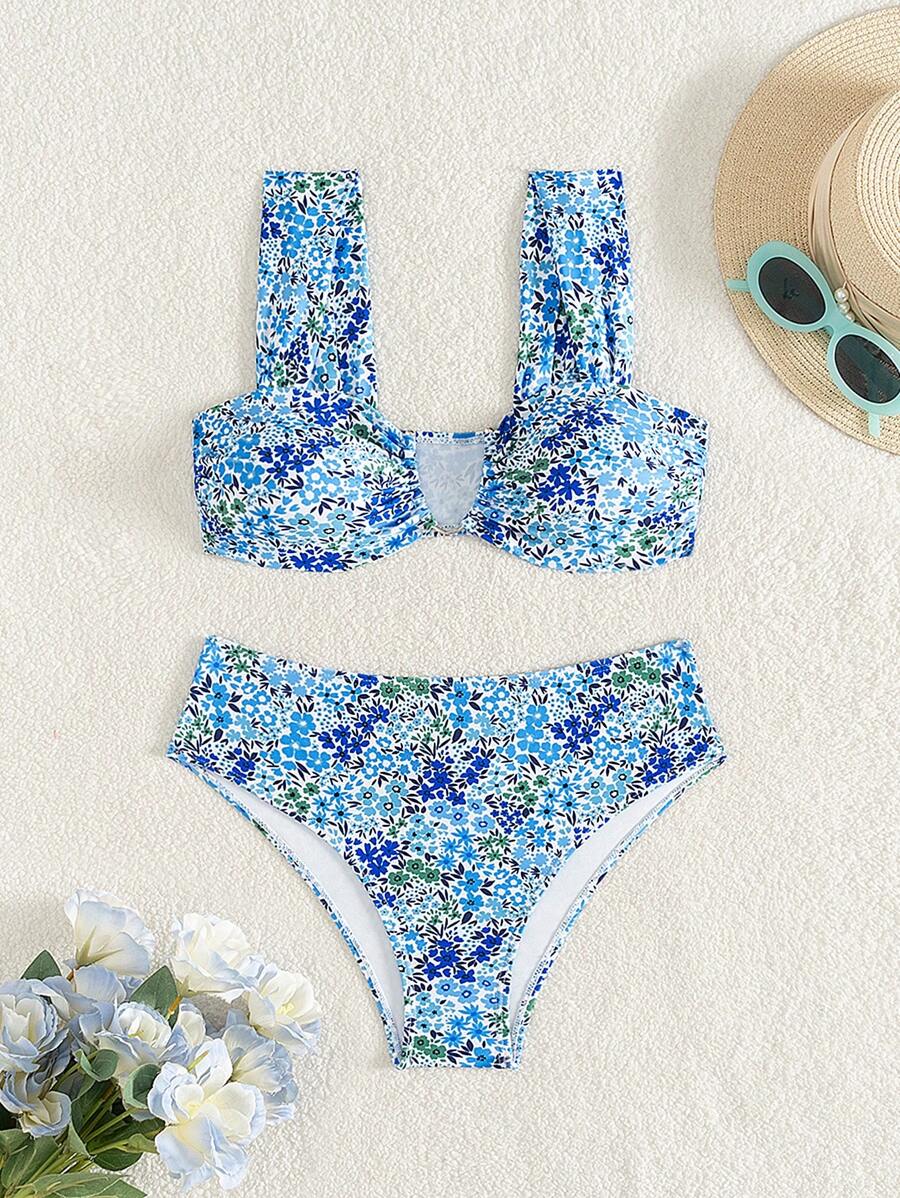 Conjunto de bikini de mujer con cuello de halter de escote en v y estampado floral pequeno, traje de bano para vacaciones