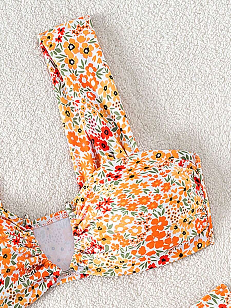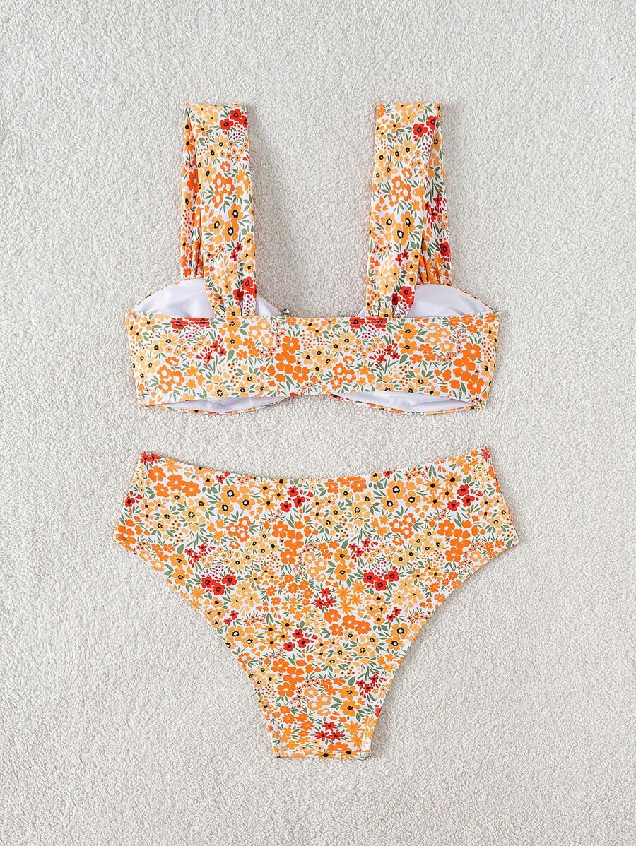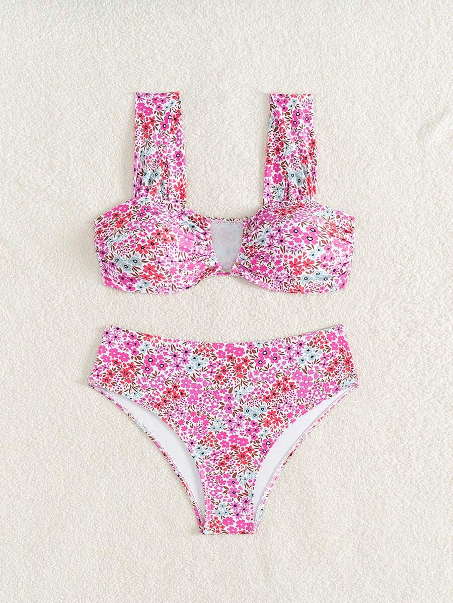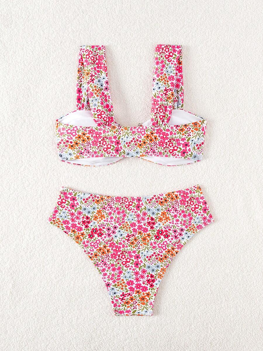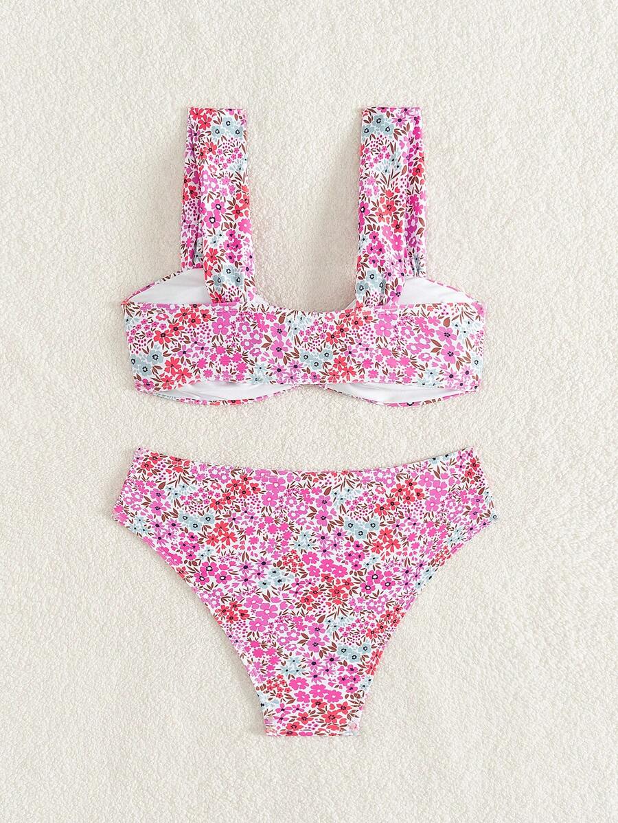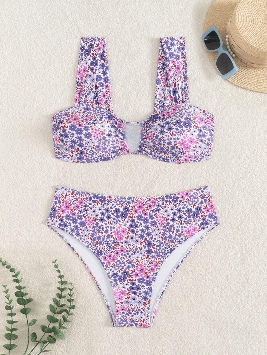 Conjunto de bikini de mujer con cuello de halter de escote en v y estampado floral pequeno, traje de bano para vacaciones