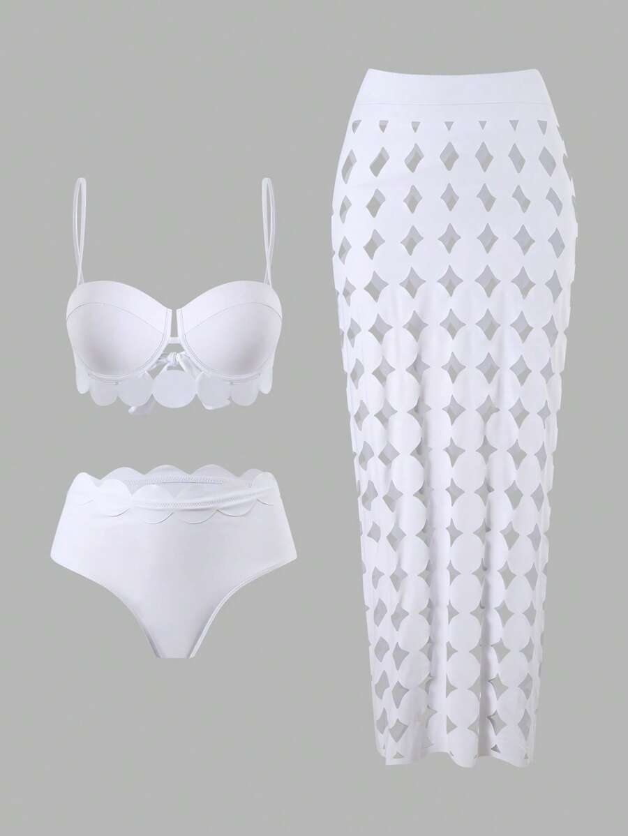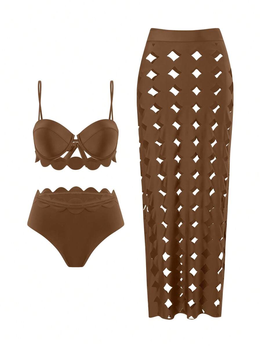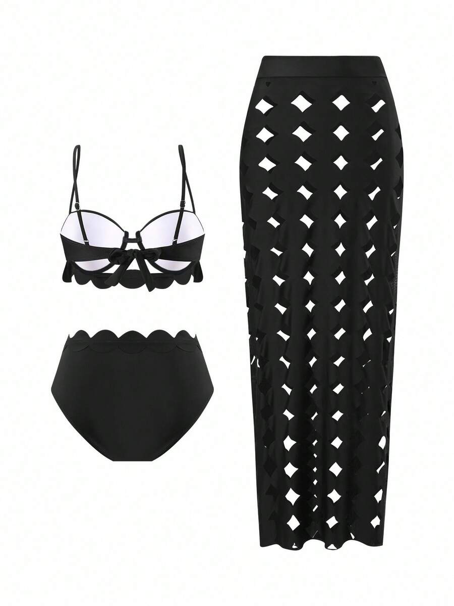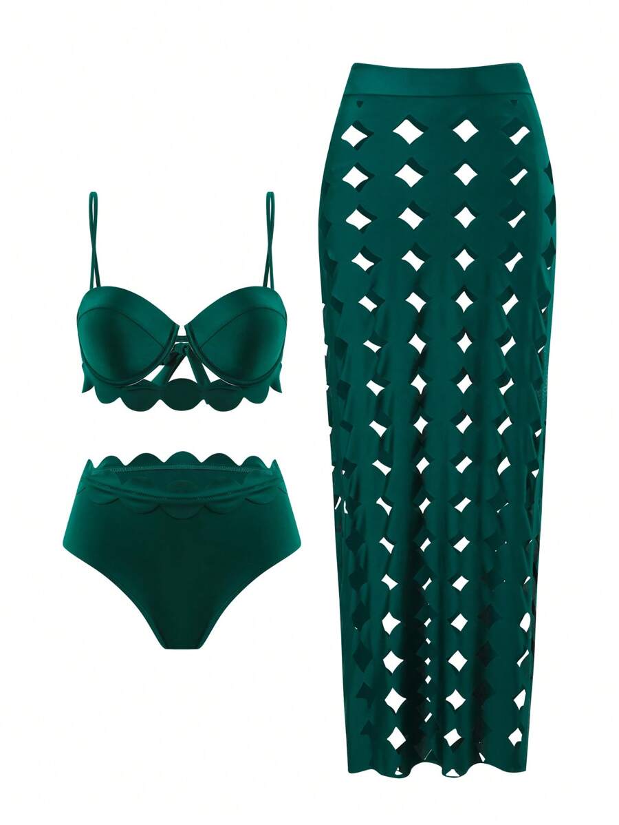 Bonvoyette conjunto de 3 prendas de verano para la playa para mujer, nuevo diseno de traje de bano con parte superior con relleno push up, bottom de cintura alta, y vestido largo calado para la playa, conjunto de bikini elegante de ropa de resort