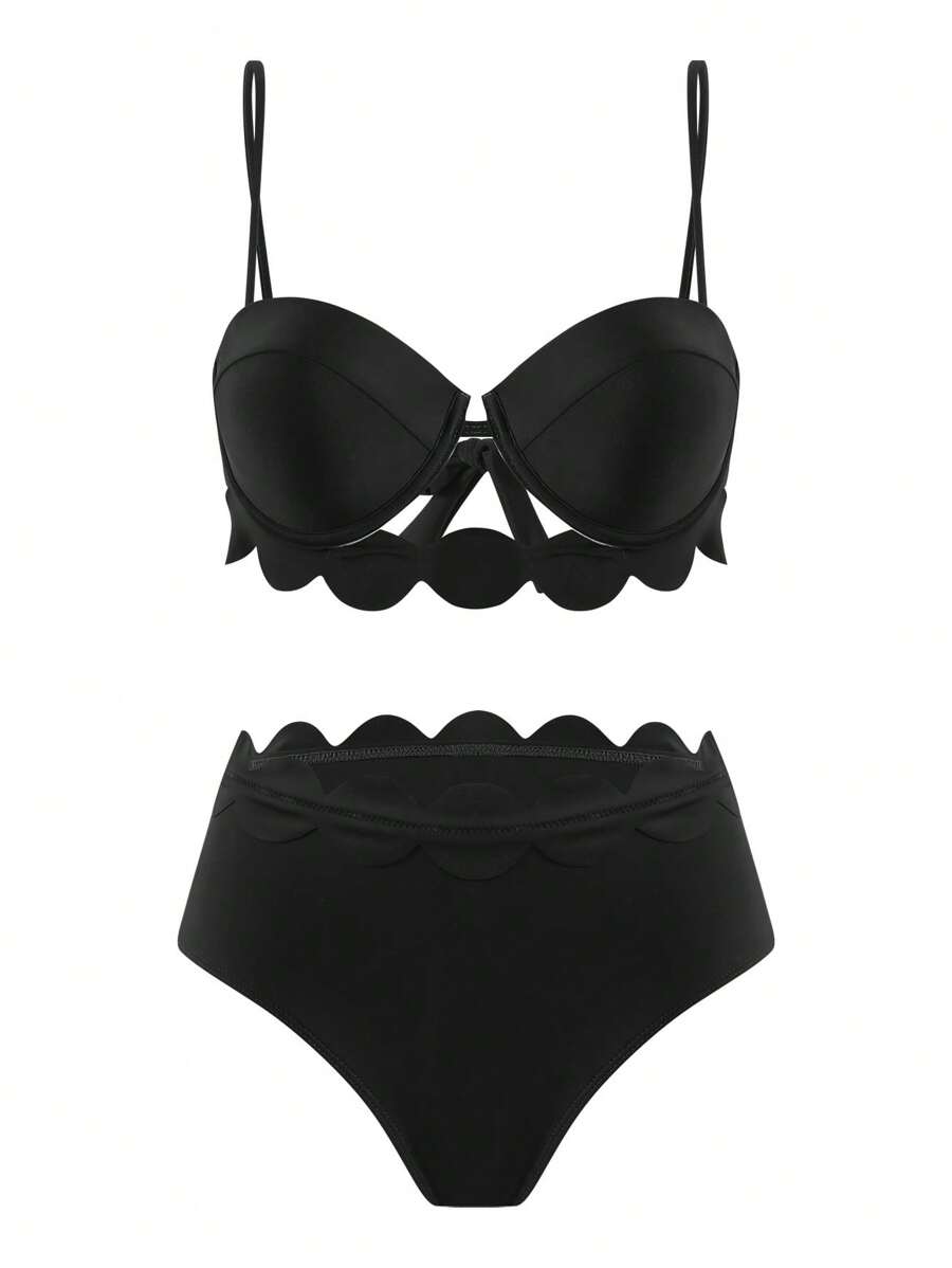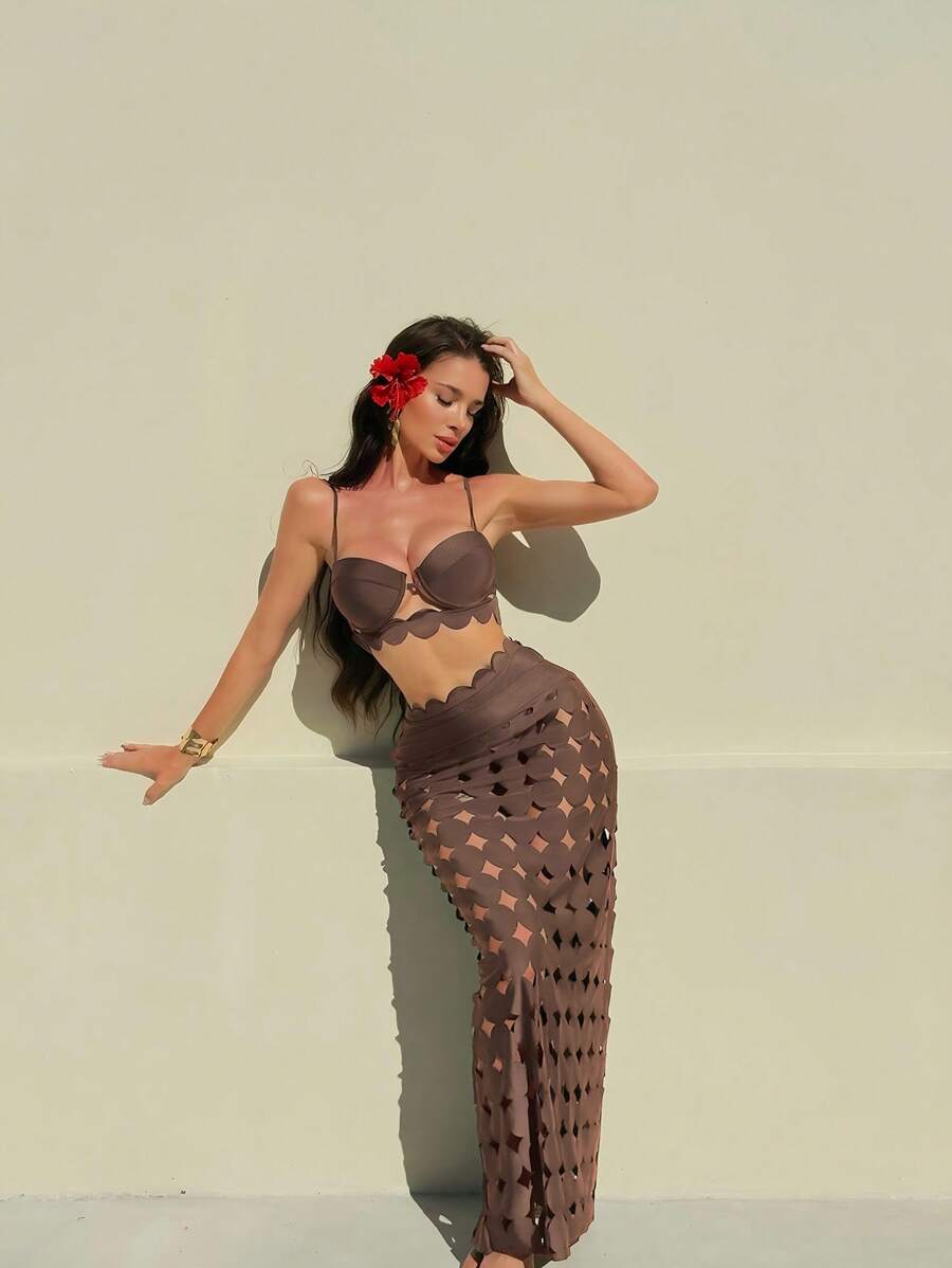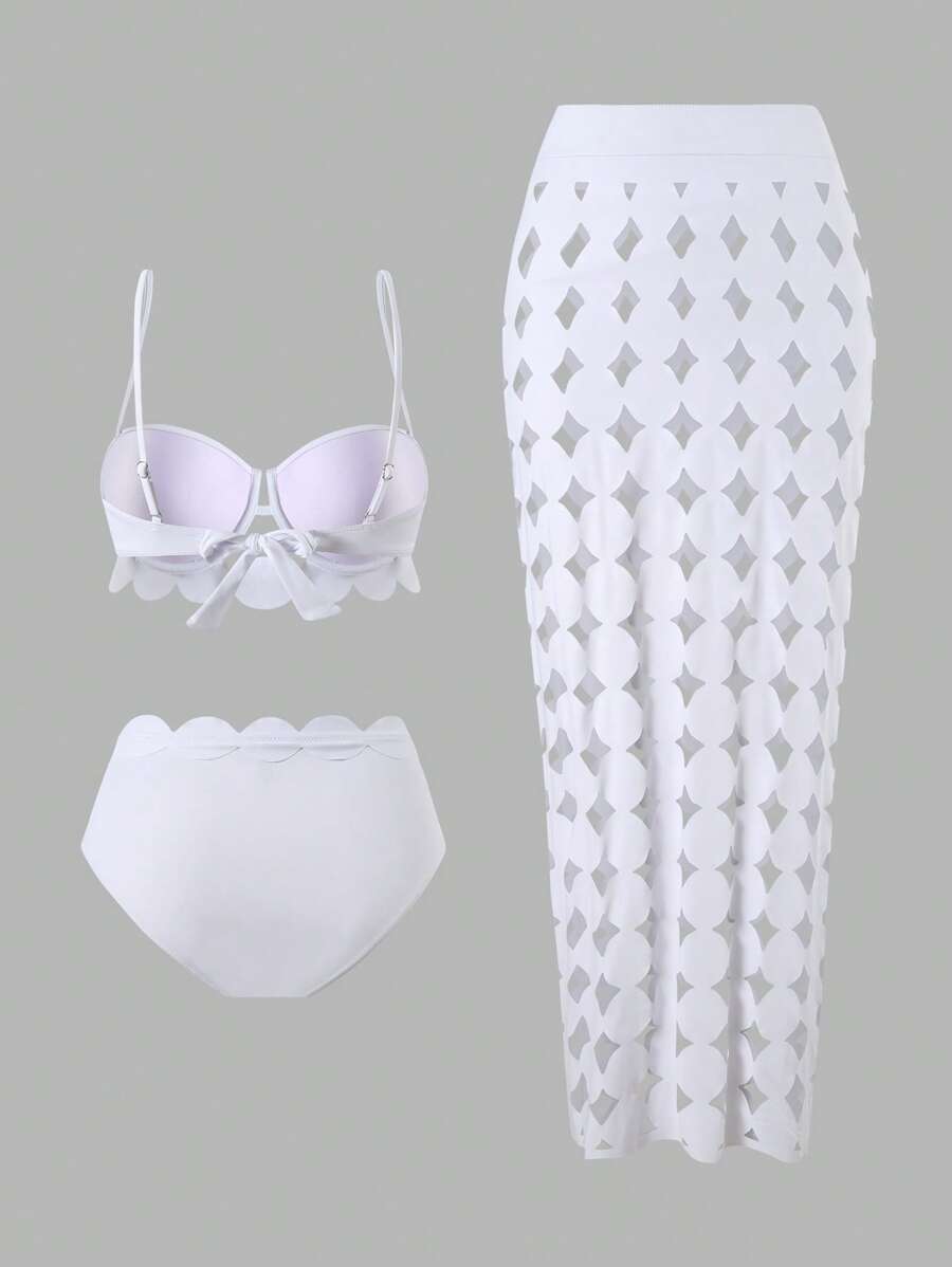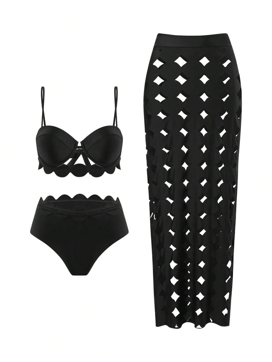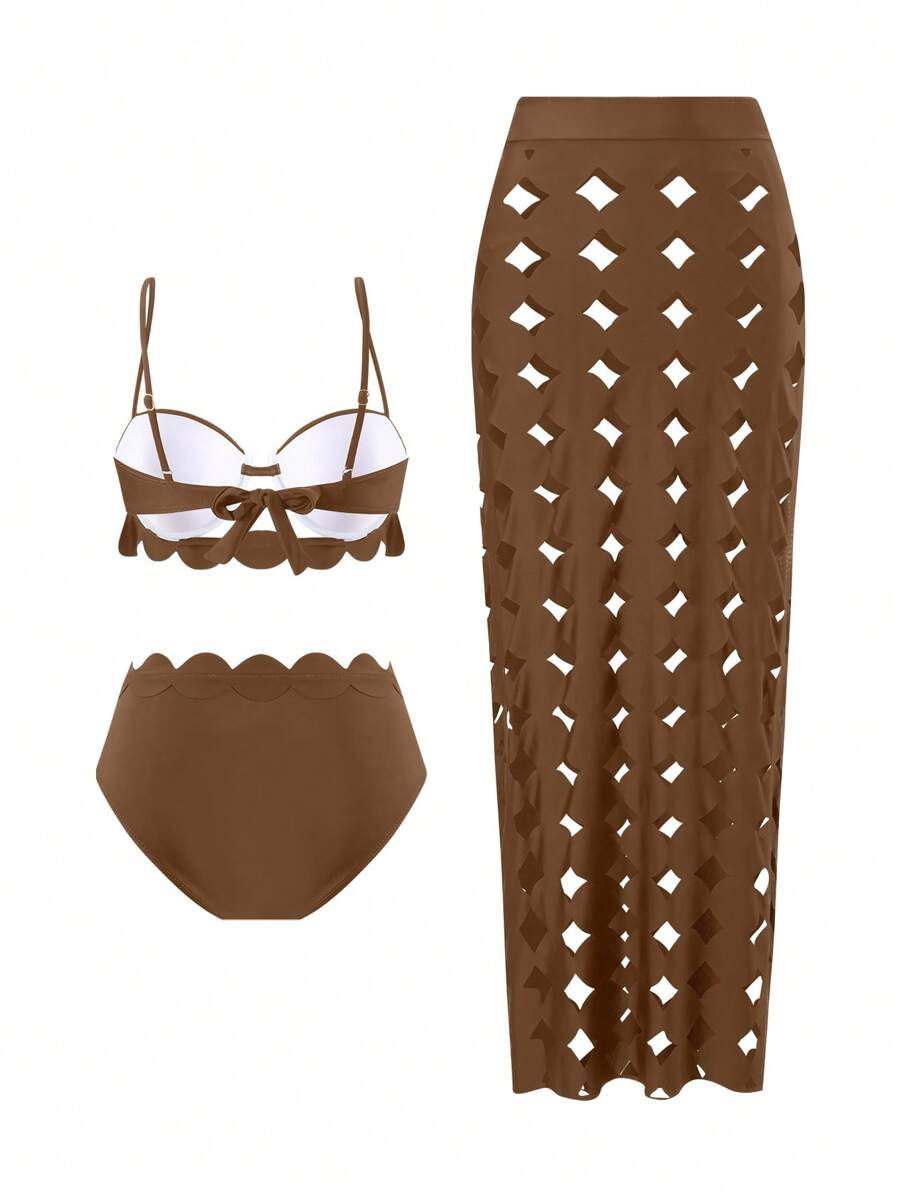 Bonvoyette conjunto de 3 prendas de verano para la playa para mujer, nuevo diseno de traje de bano con parte superior con relleno push up, bottom de cintura alta, y vestido largo calado para la playa, conjunto de bikini elegante de ropa de resort