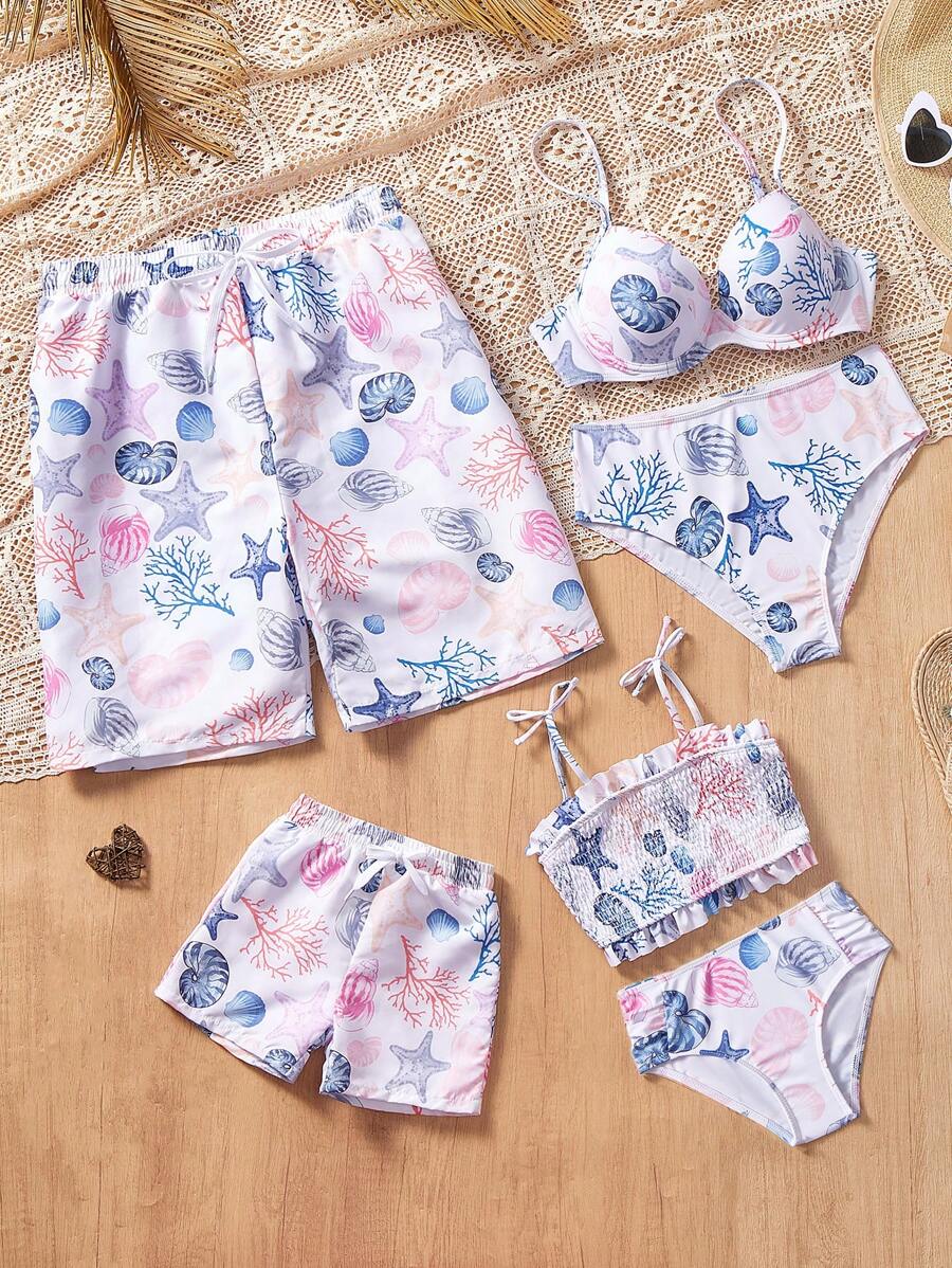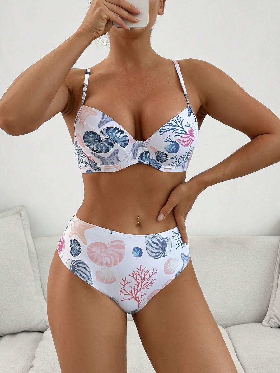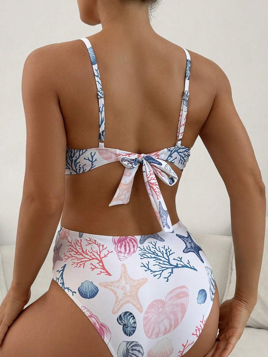 Traje de bano de mujer tipo bikini de tiro alto con brasier con aros, lazo y estampado de conchas marinas, coral y estrellas de mar
