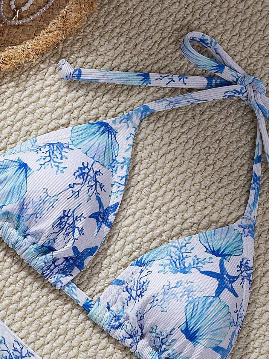 Conjunto de 3 piezas de bikini sexy con diseno de criaturas oceanicas impreso en tejido texturizado para vacaciones en la playa para mujeres