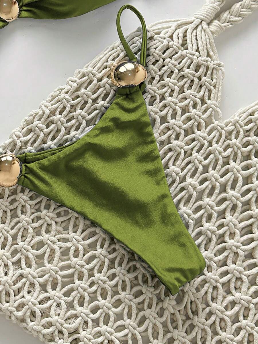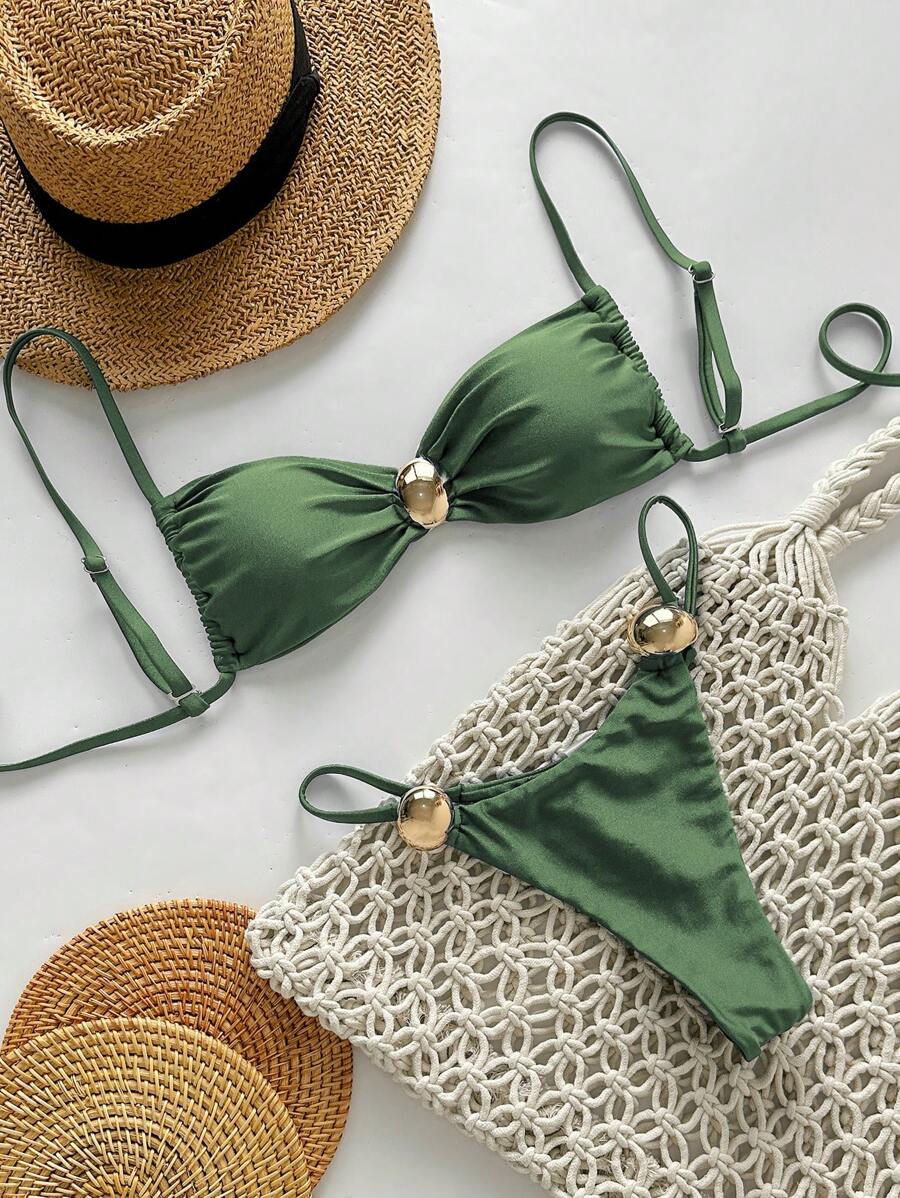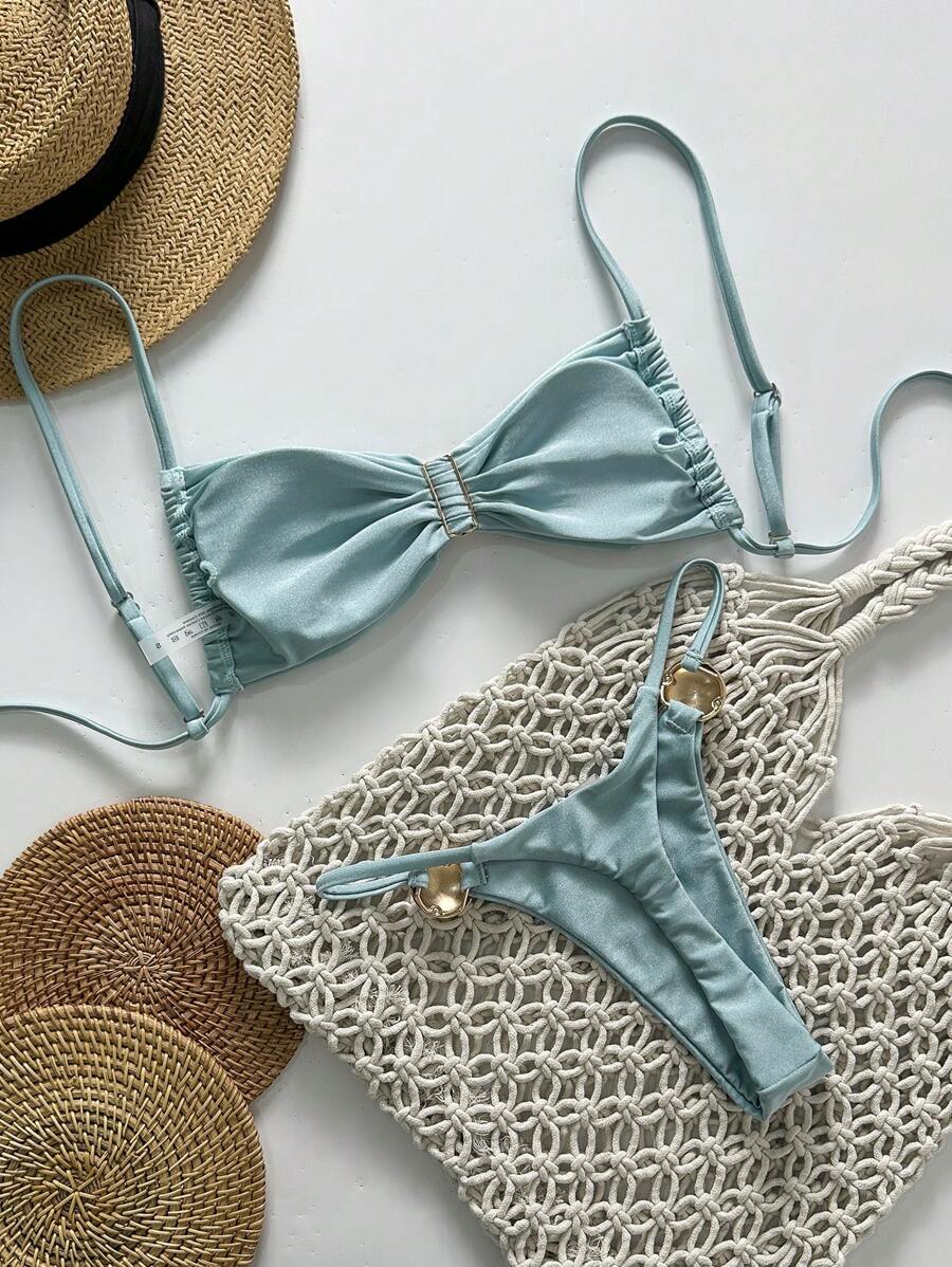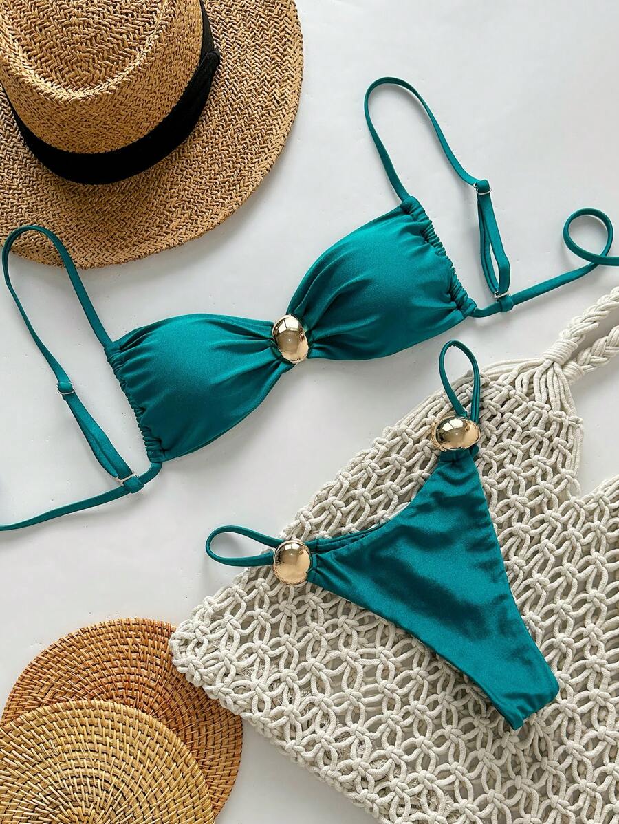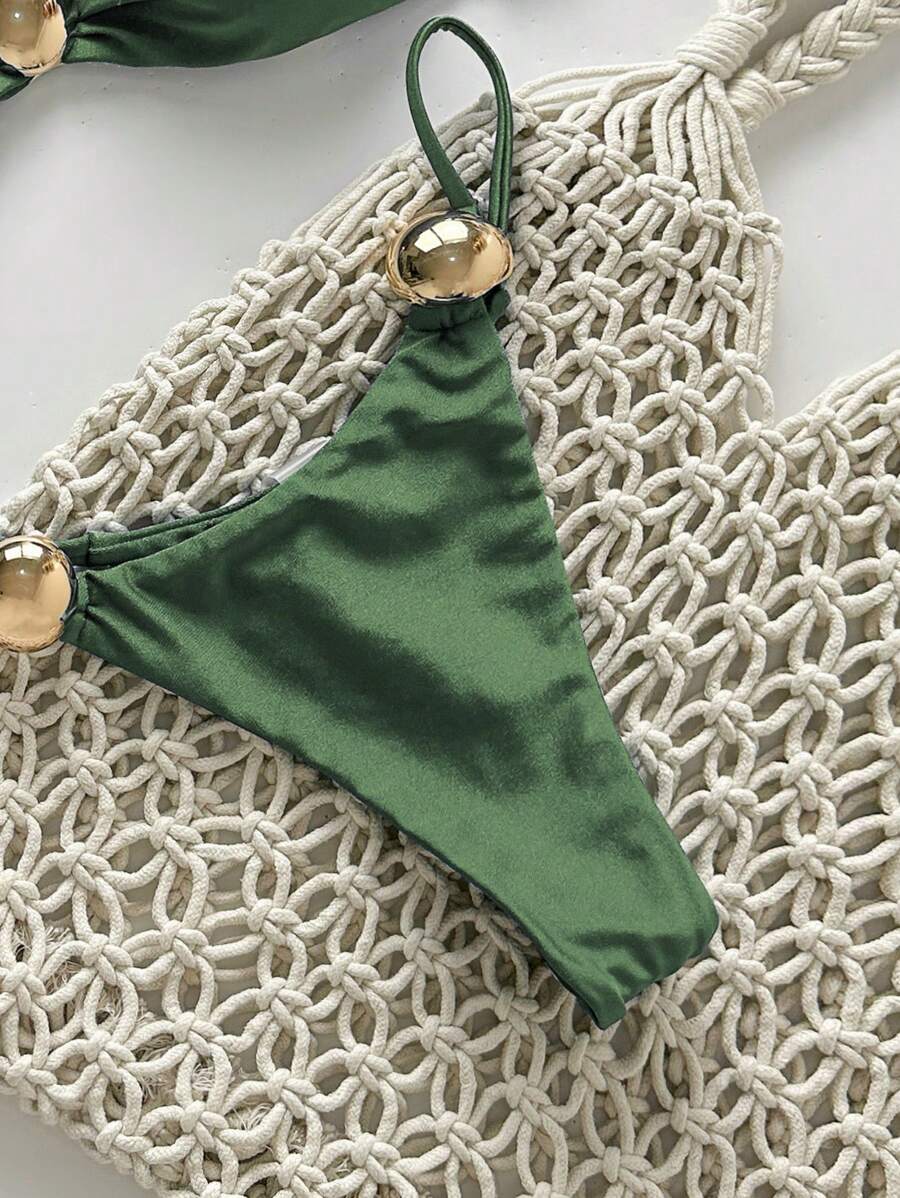 2 piezas conjunto de traje de bano de verano para vacaciones en la playa con top de tirantes finos de unicolor metalico y tanga tipo bikini para mujer