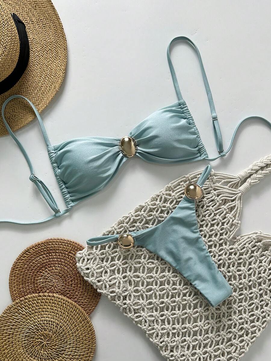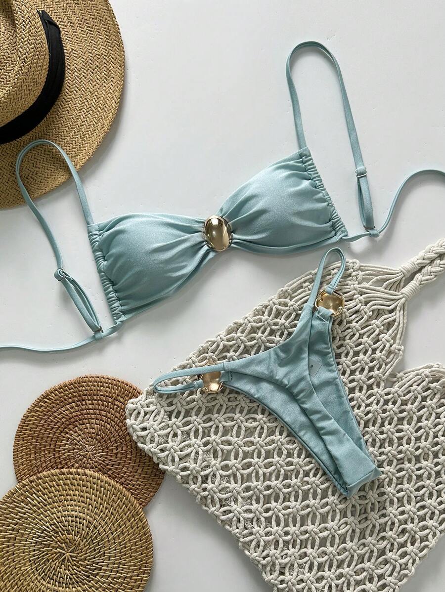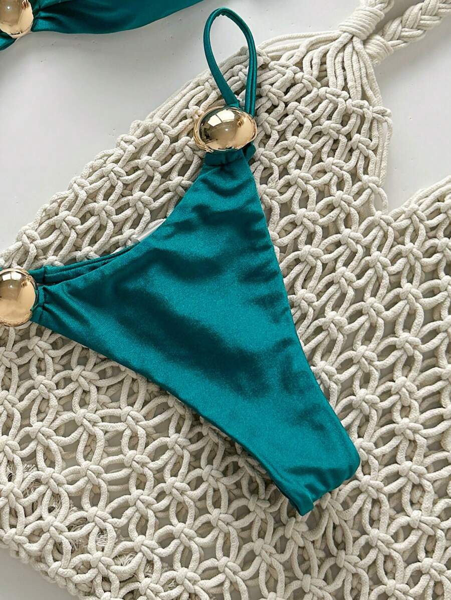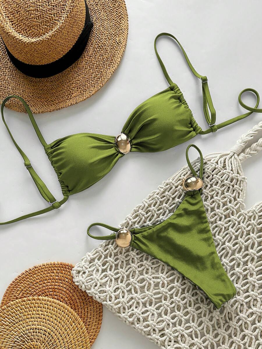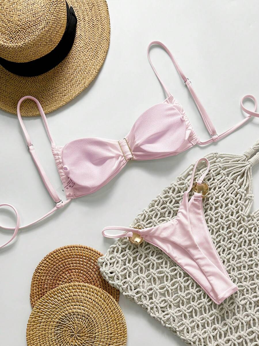 2 piezas conjunto de traje de bano de verano para vacaciones en la playa con top de tirantes finos de unicolor metalico y tanga tipo bikini para mujer