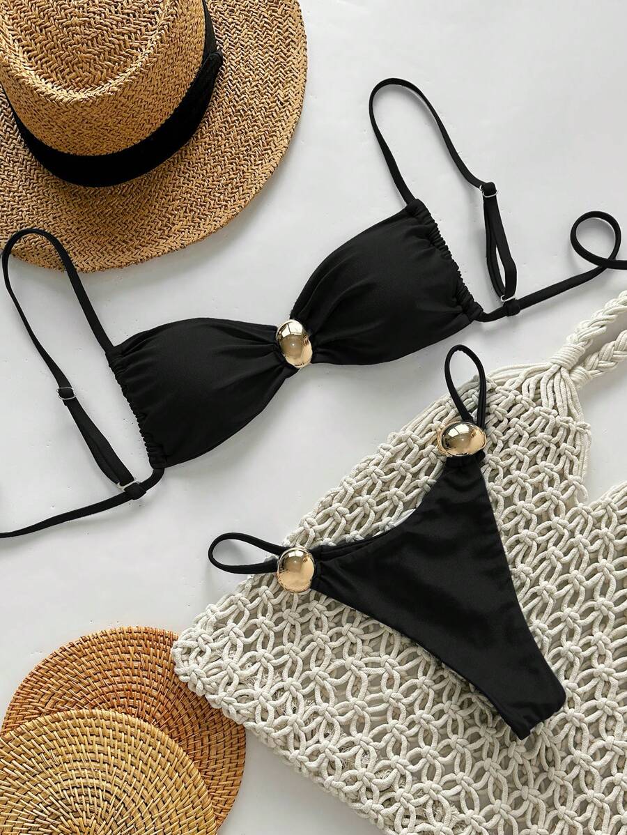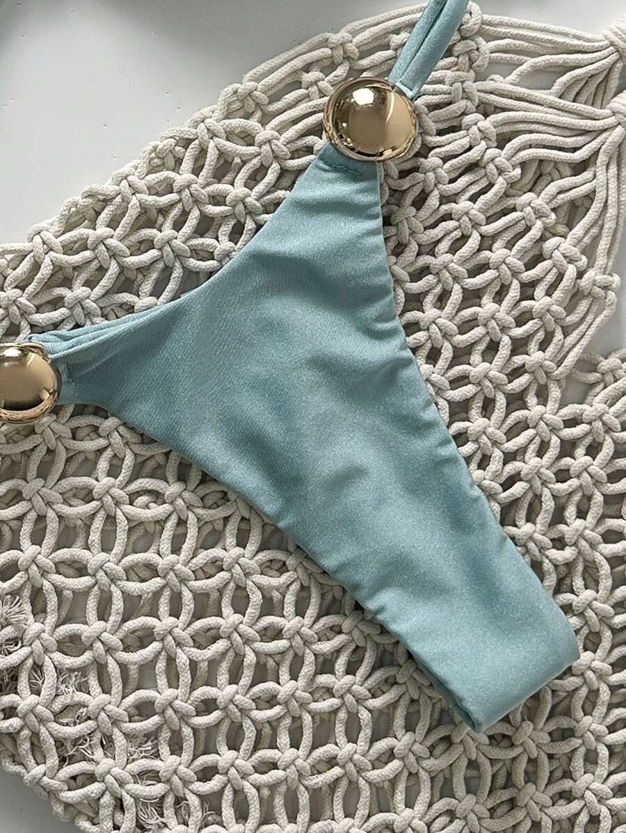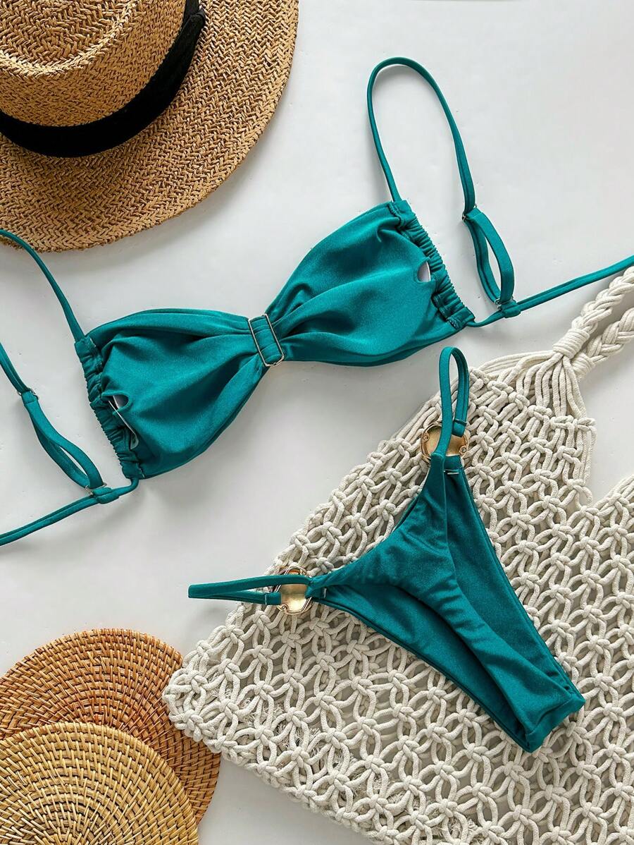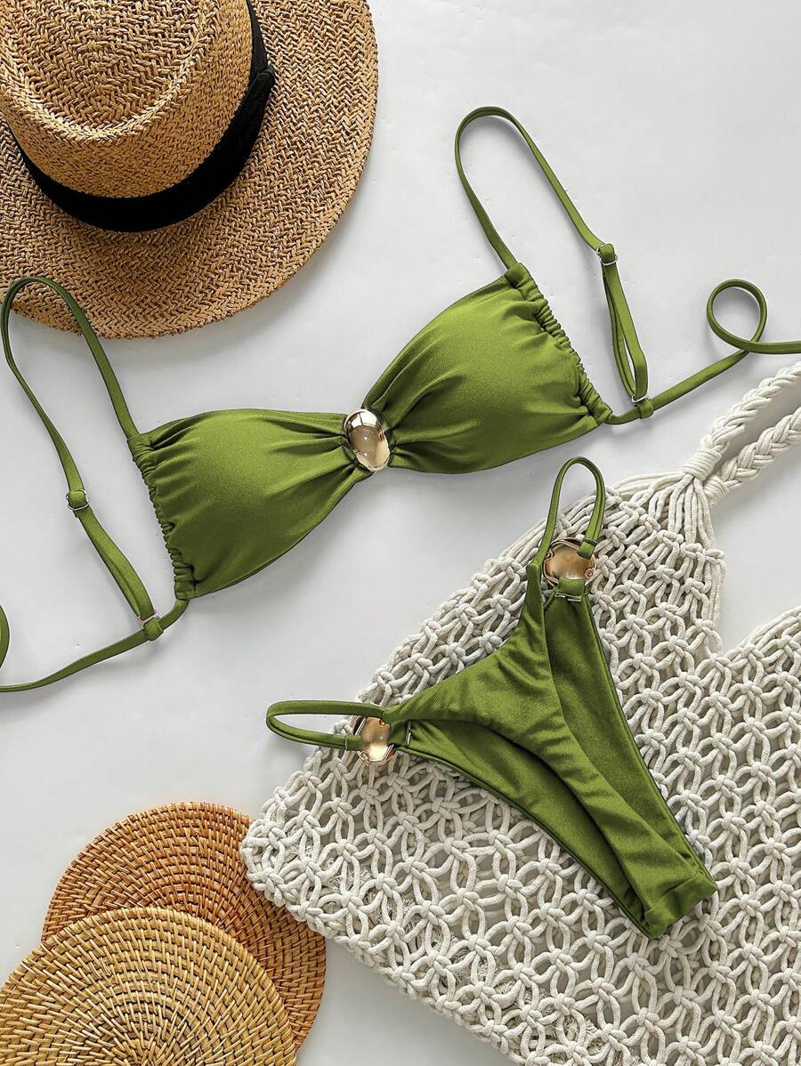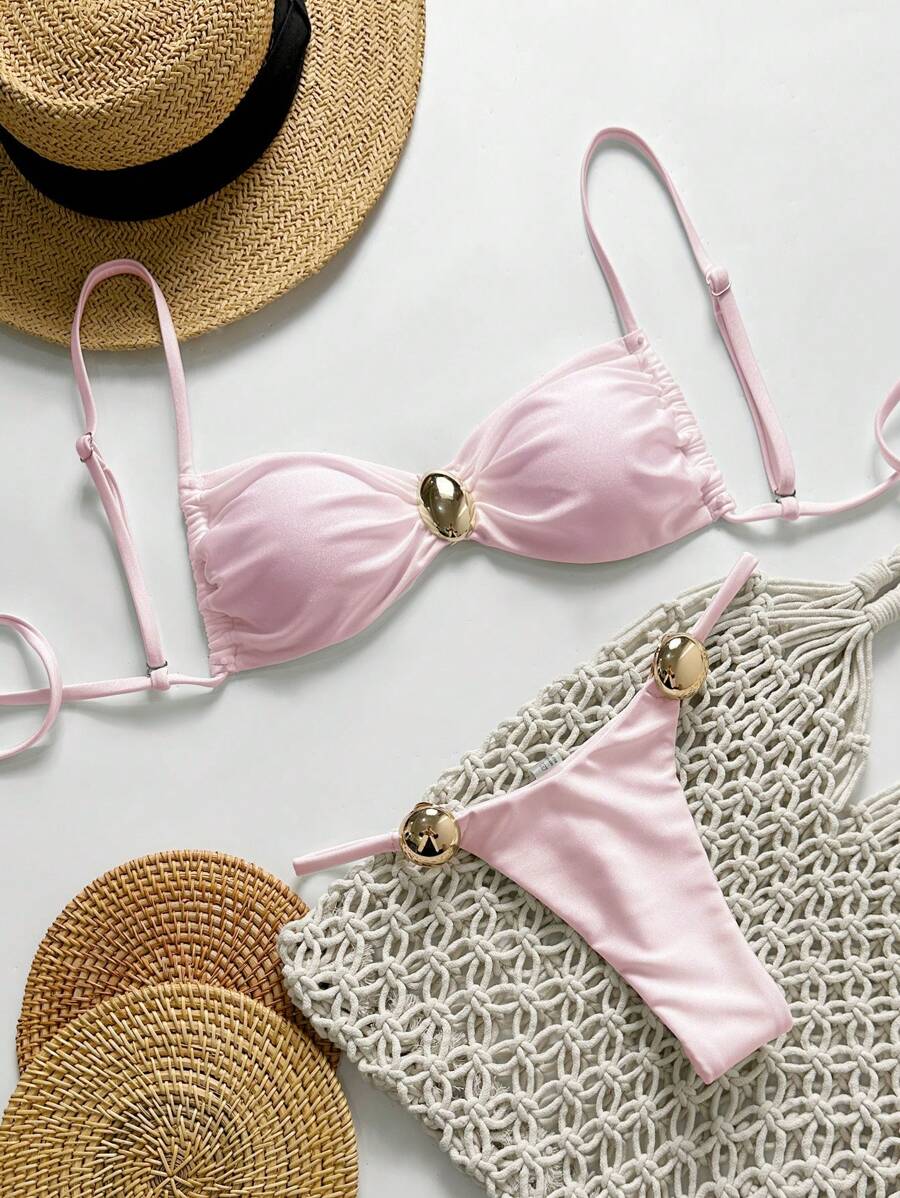 2 piezas conjunto de traje de bano de verano para vacaciones en la playa con top de tirantes finos de unicolor metalico y tanga tipo bikini para mujer