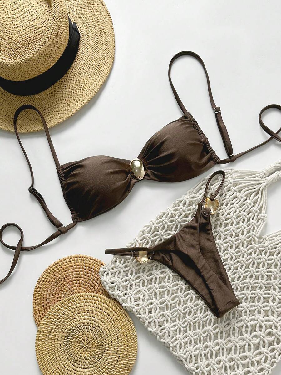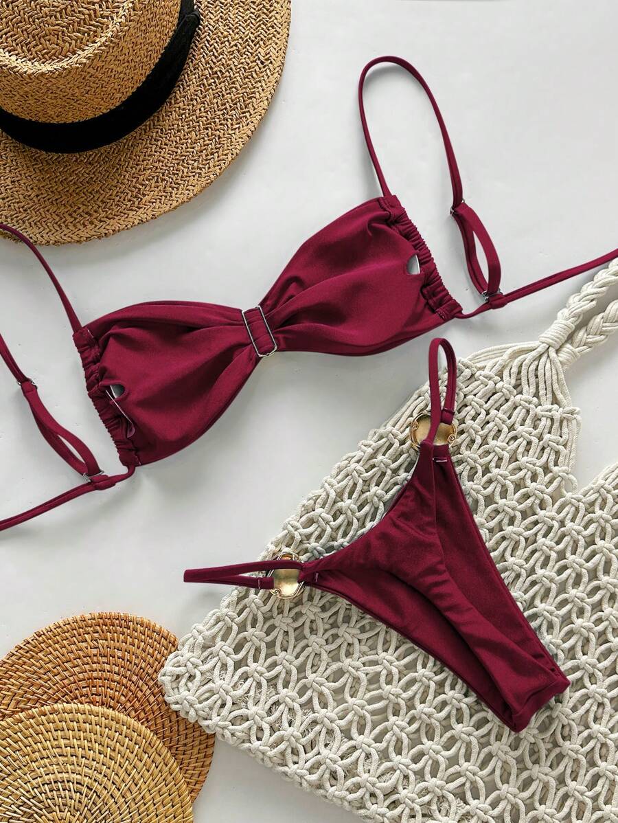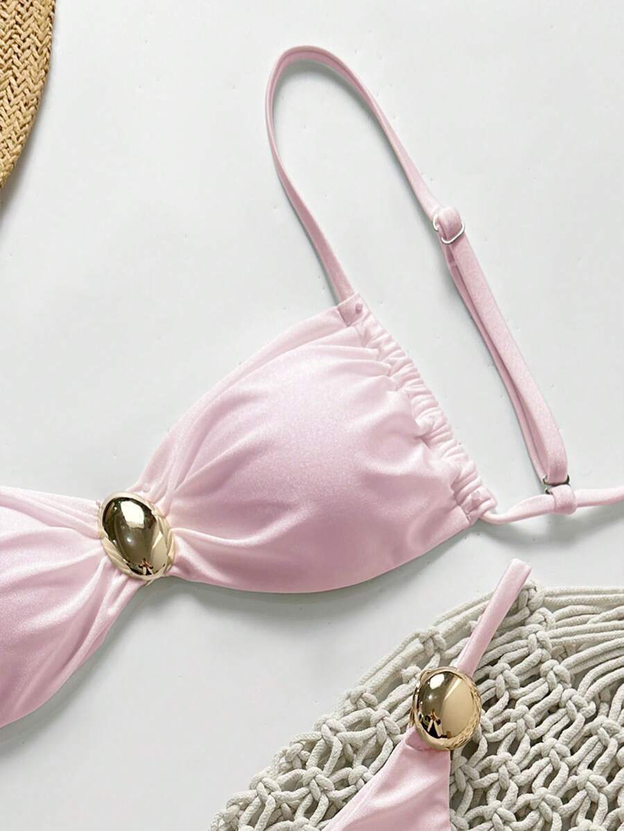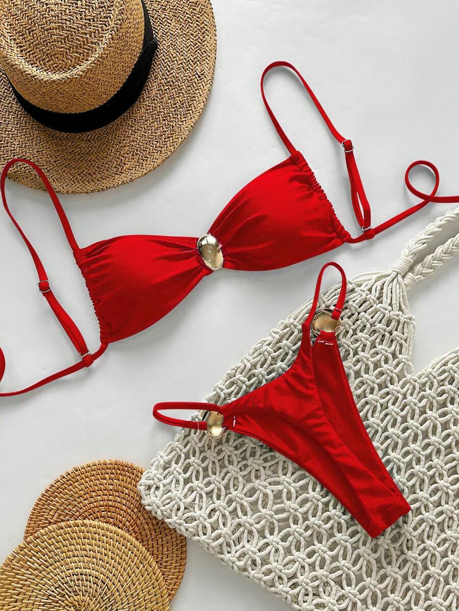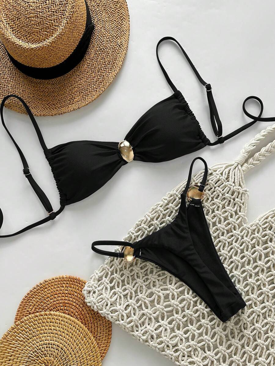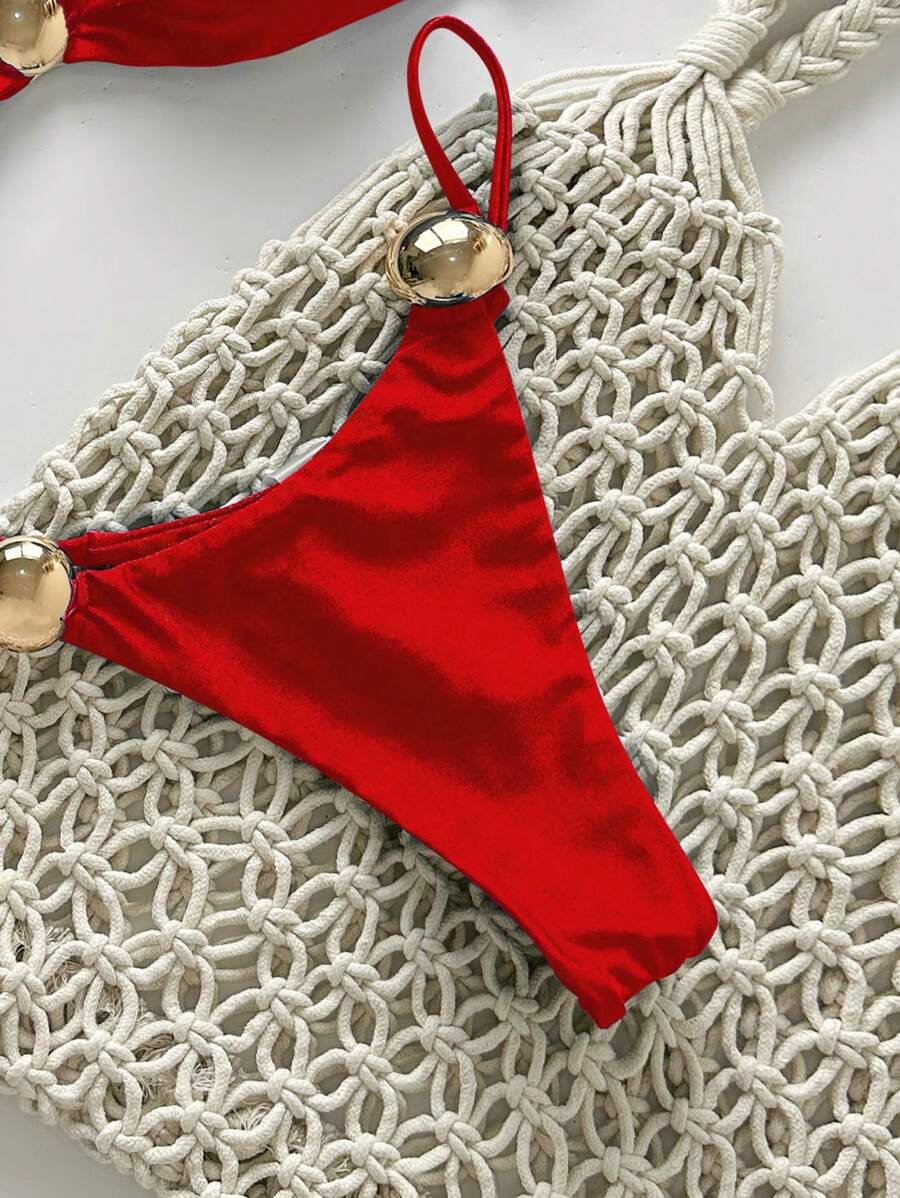 2 piezas conjunto de traje de bano de verano para vacaciones en la playa con top de tirantes finos de unicolor metalico y tanga tipo bikini para mujer