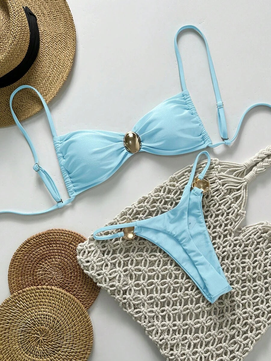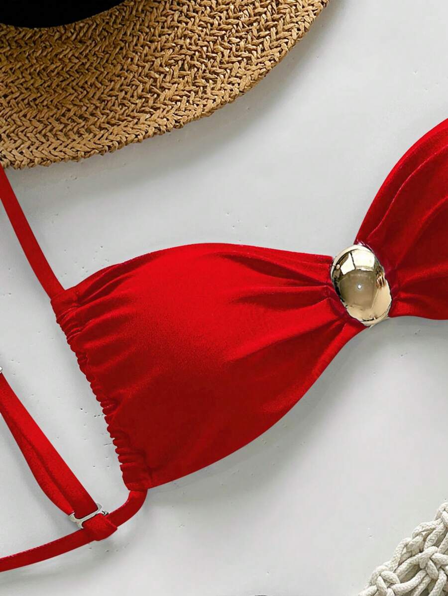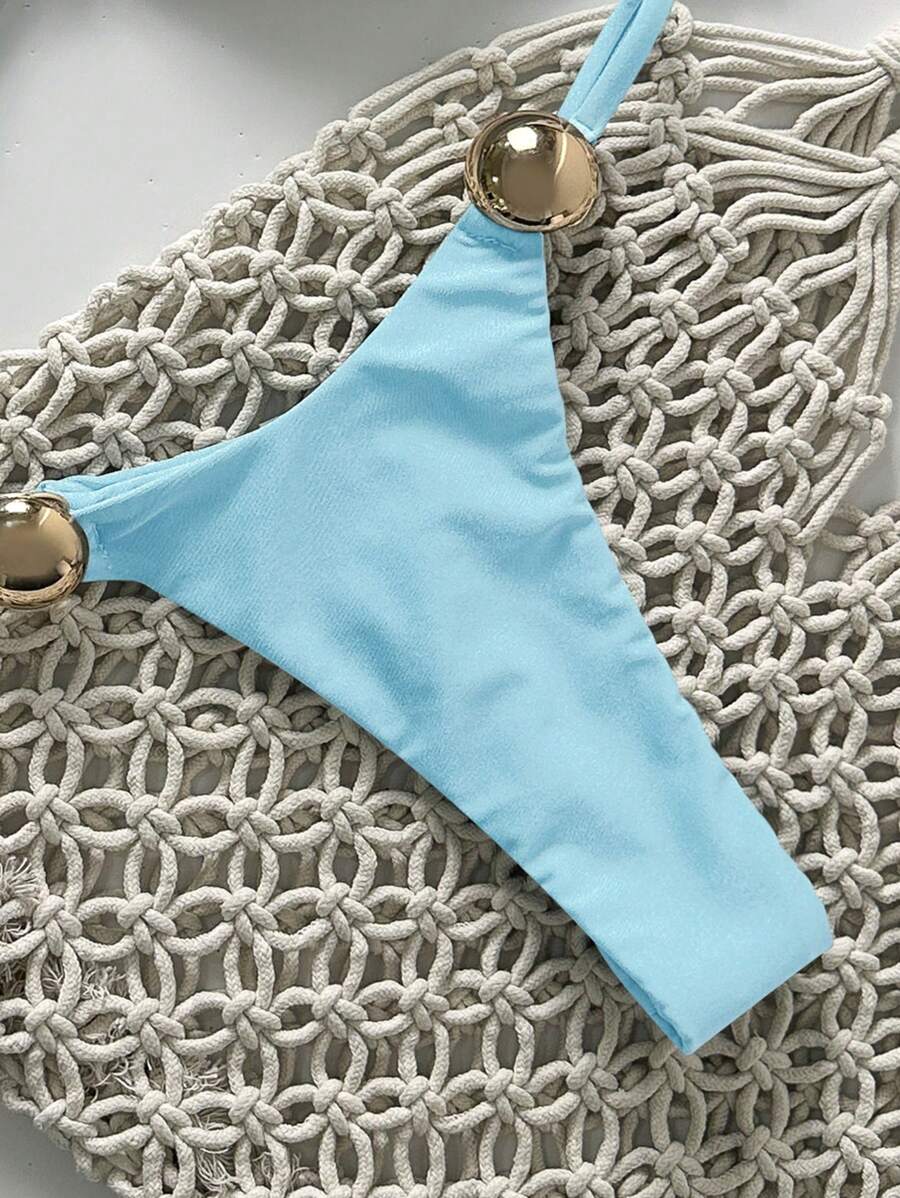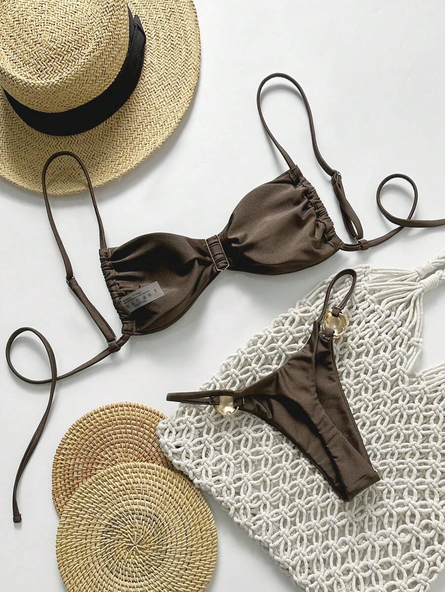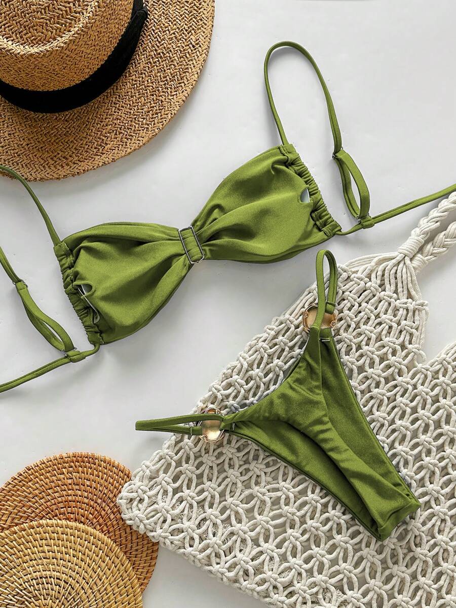 2 piezas conjunto de traje de bano de verano para vacaciones en la playa con top de tirantes finos de unicolor metalico y tanga tipo bikini para mujer