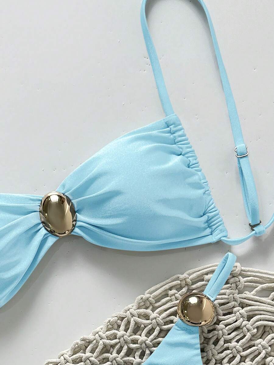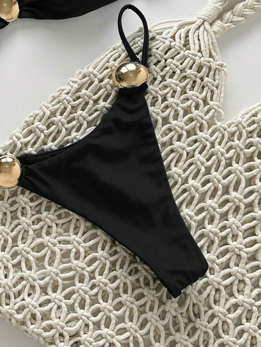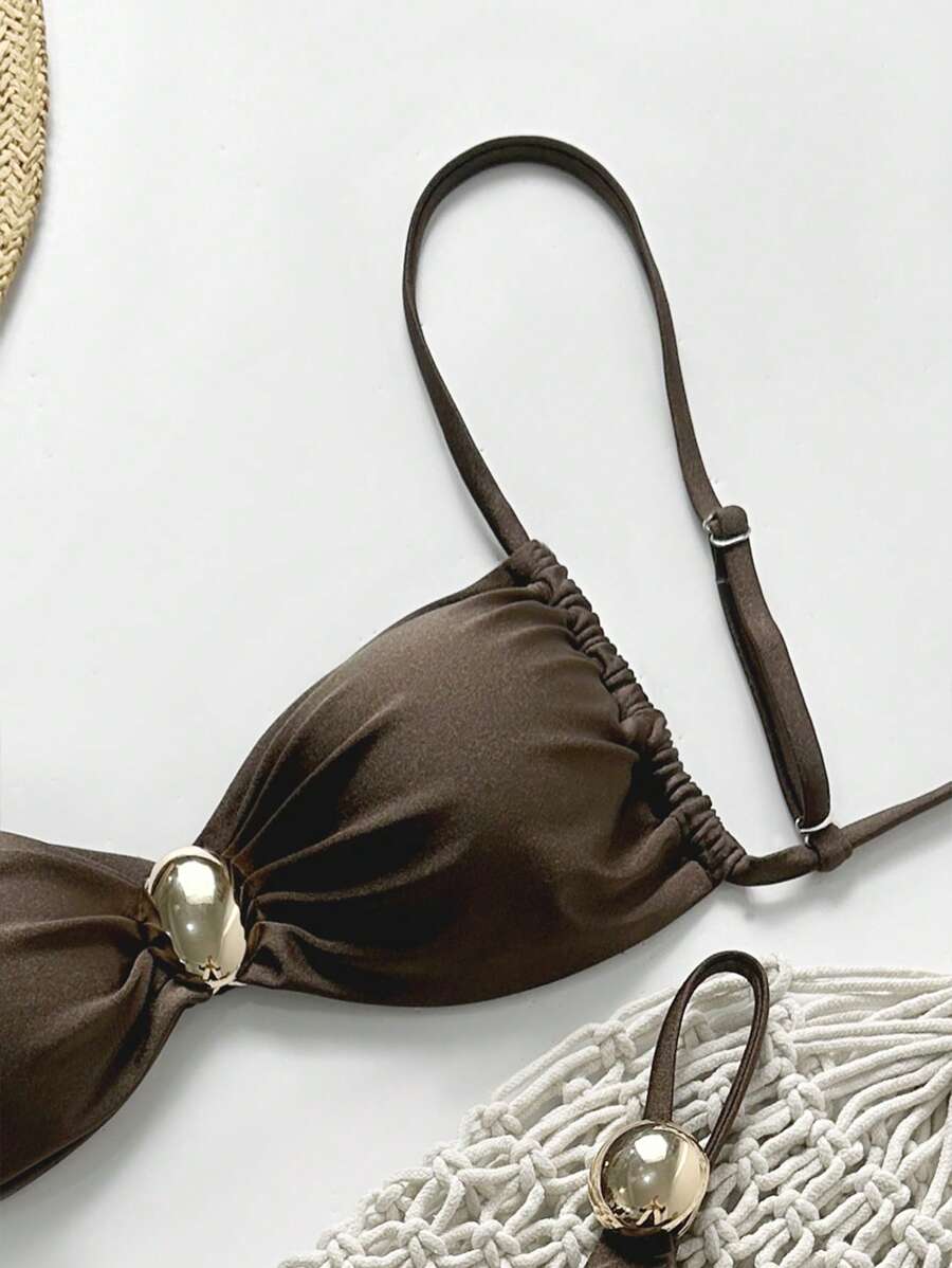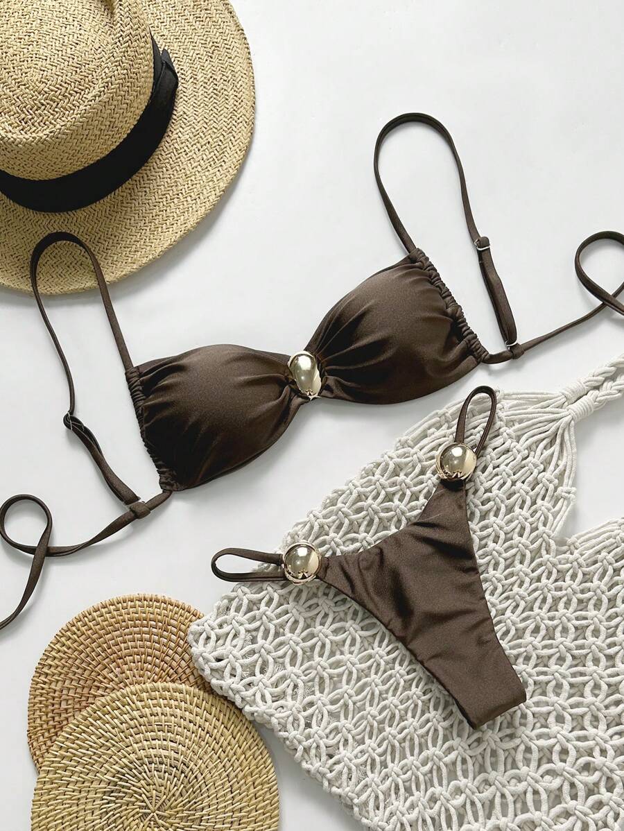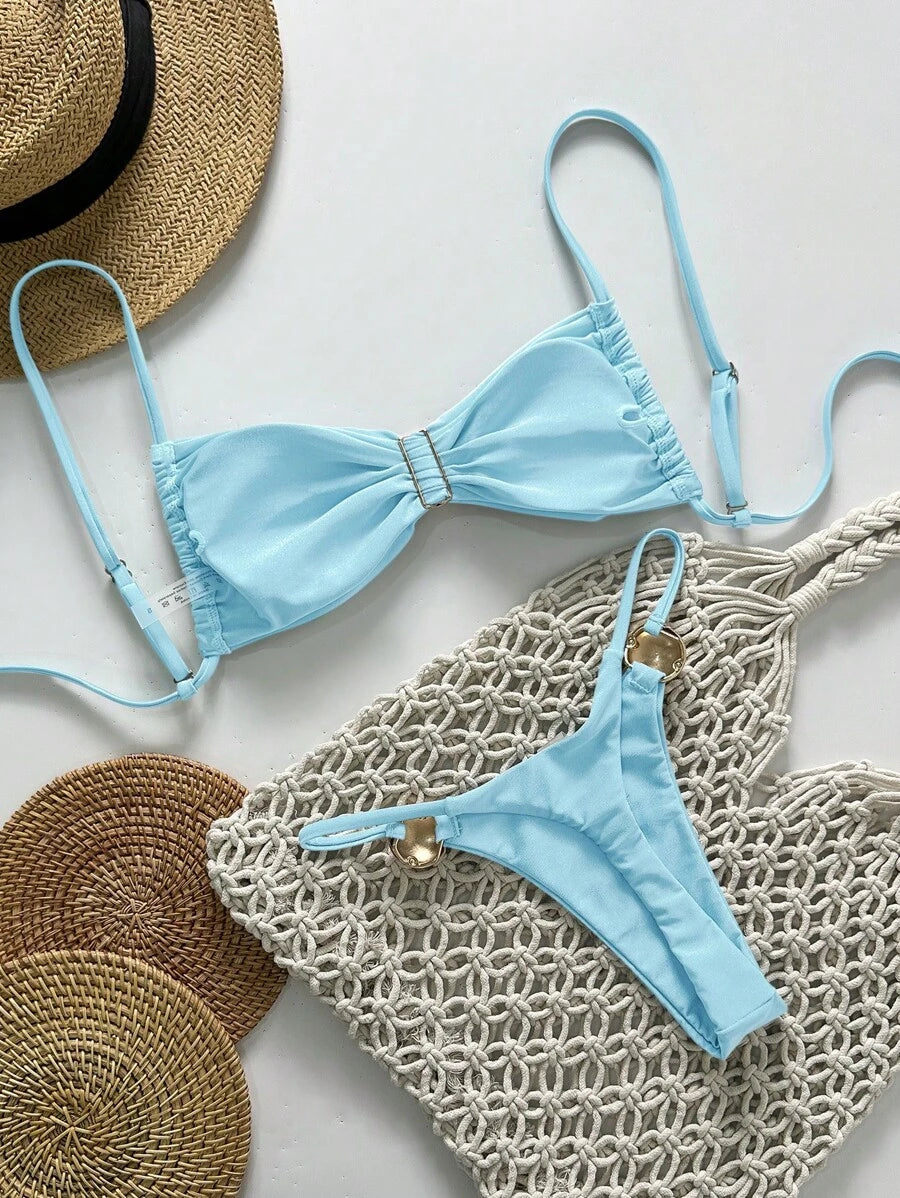 2 piezas conjunto de traje de bano de verano para vacaciones en la playa con top de tirantes finos de unicolor metalico y tanga tipo bikini para mujer