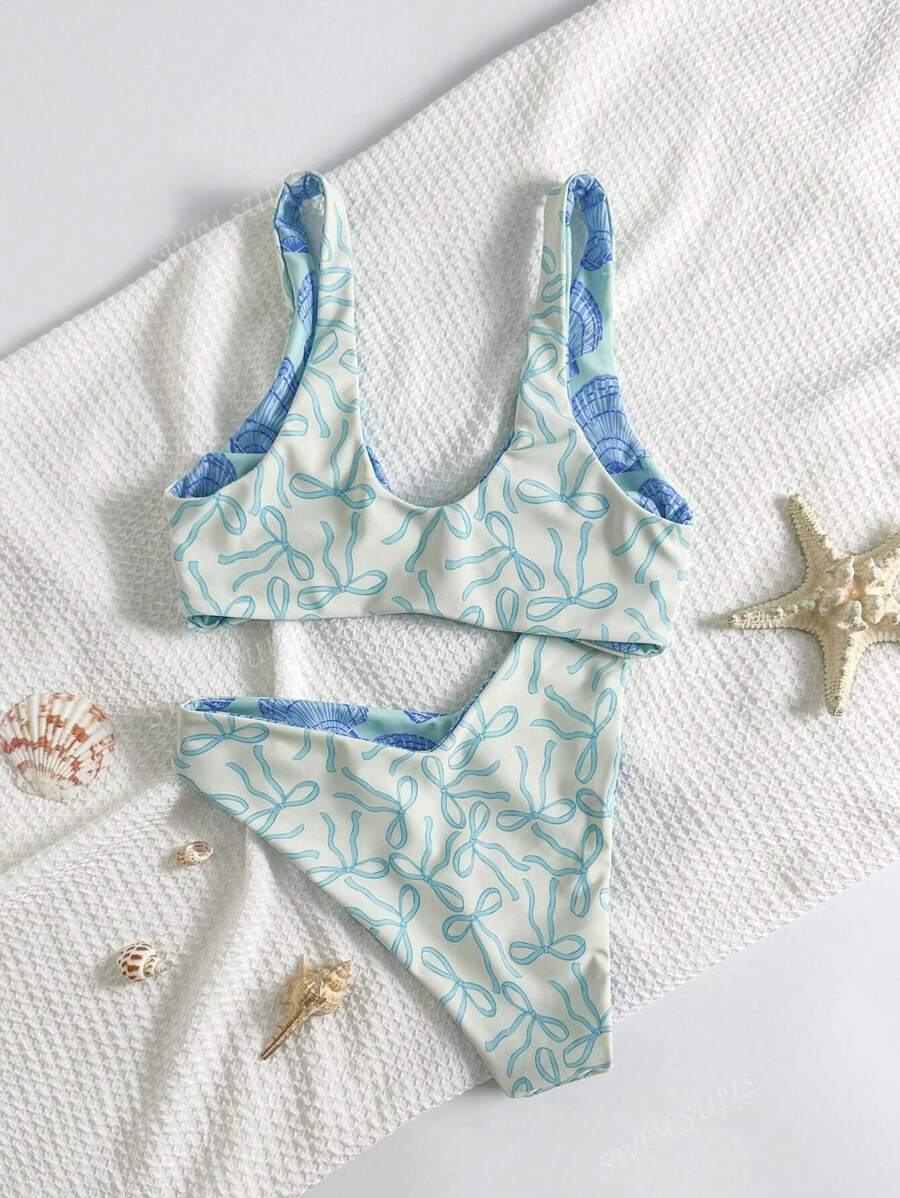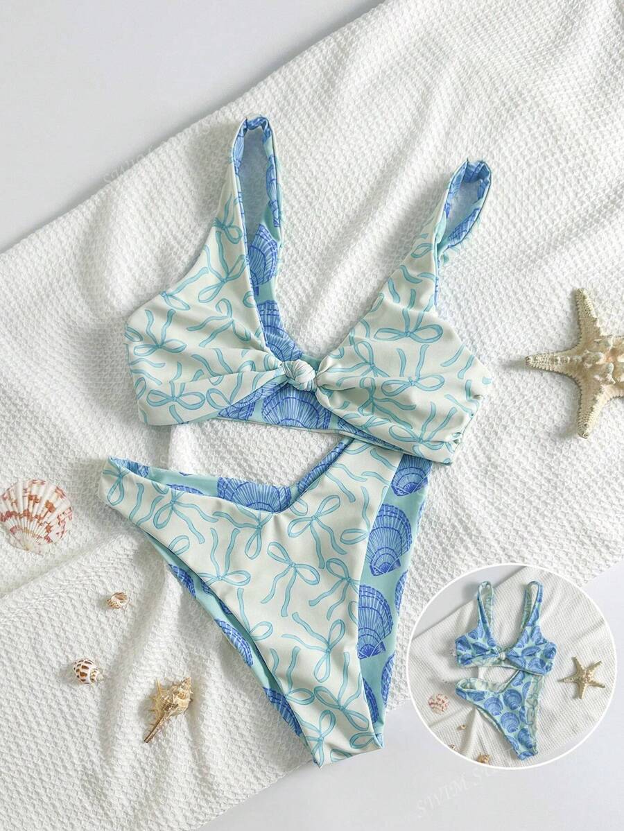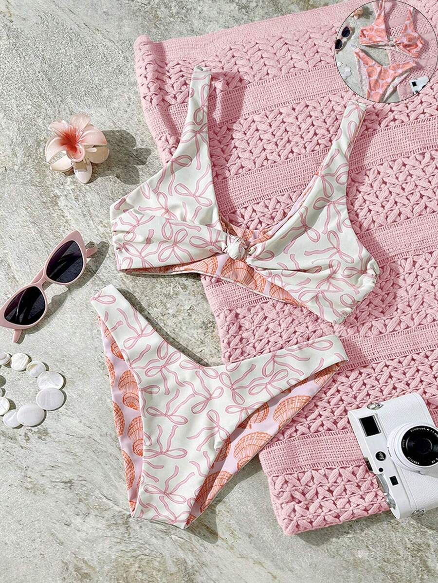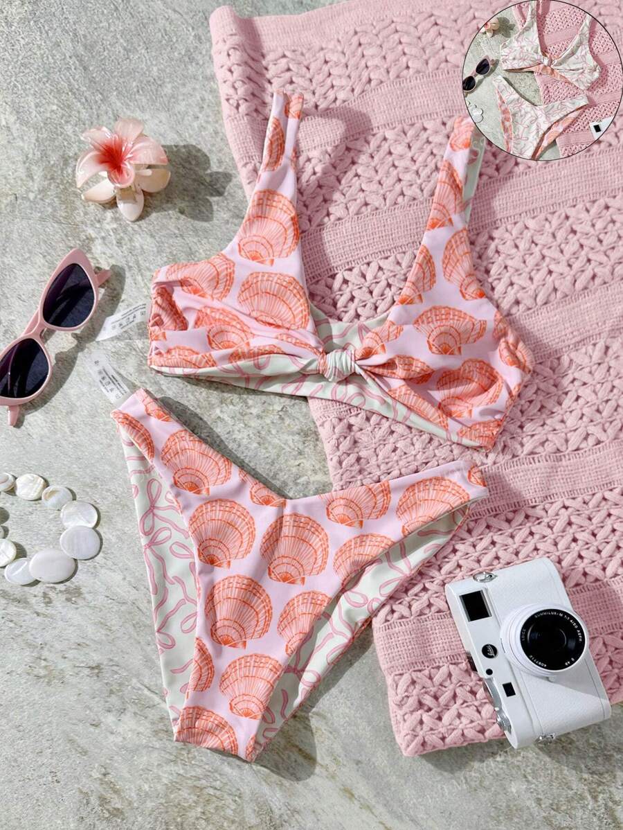 Conjunto de 2 piezas de bikini para mujer de verano, diseno impreso reversible con lazo y concha, con tirantes anchos ajustables y top con efecto retorcido y shorts de natacion a la cintura media, adecuado para fiestas de piscina y vacaciones en la
