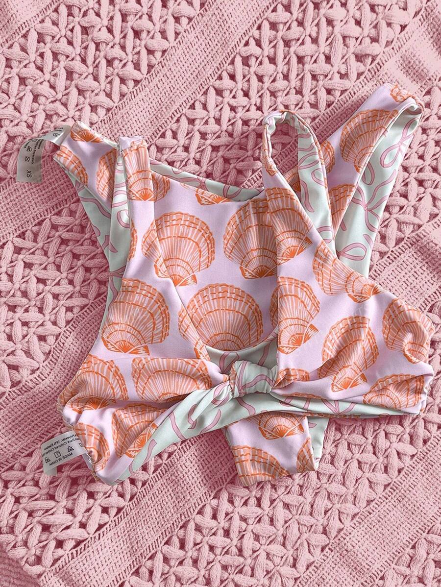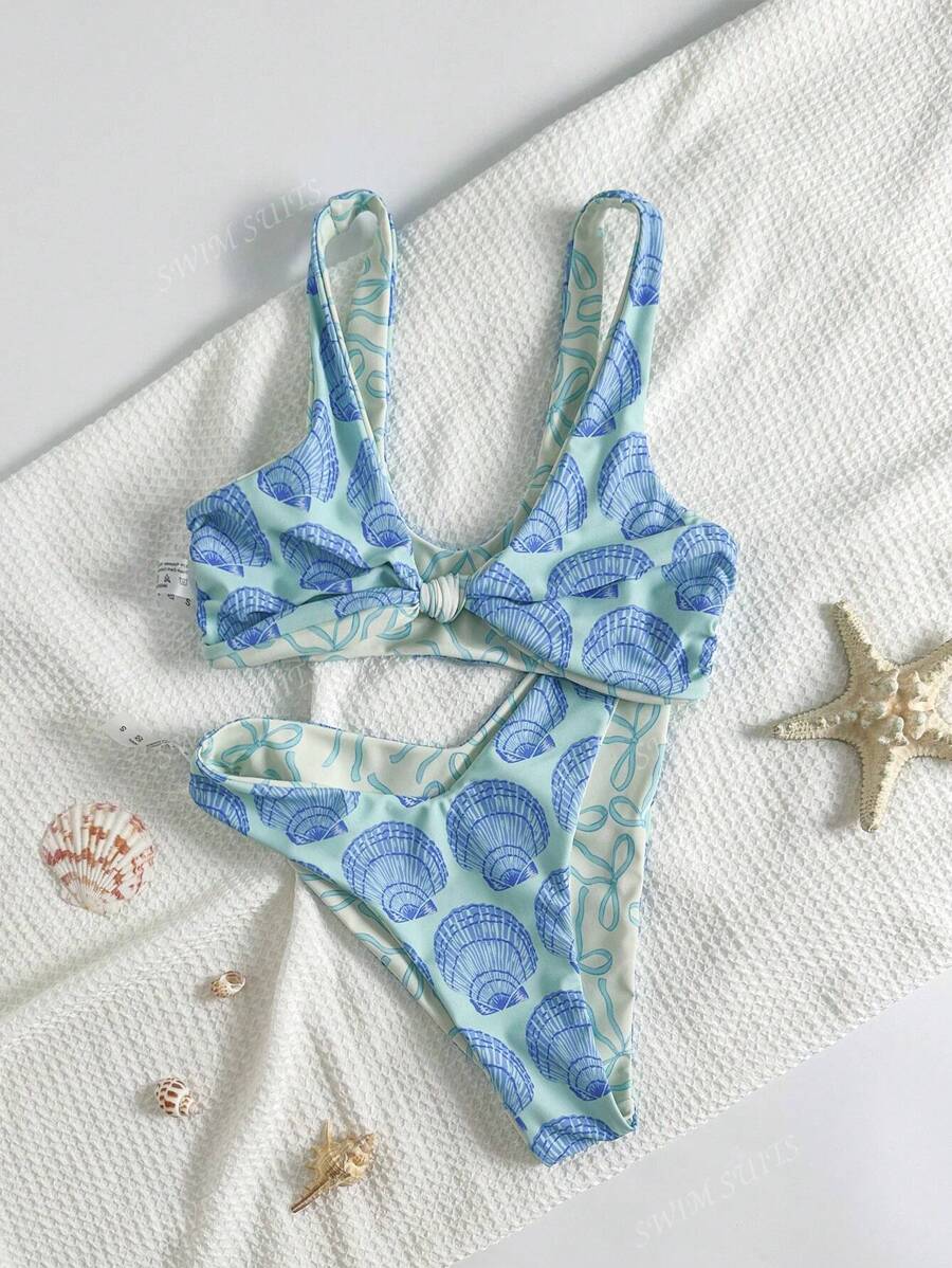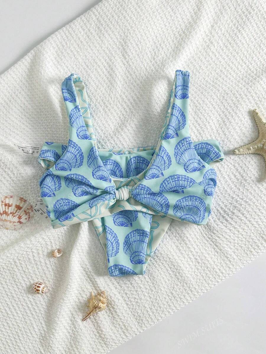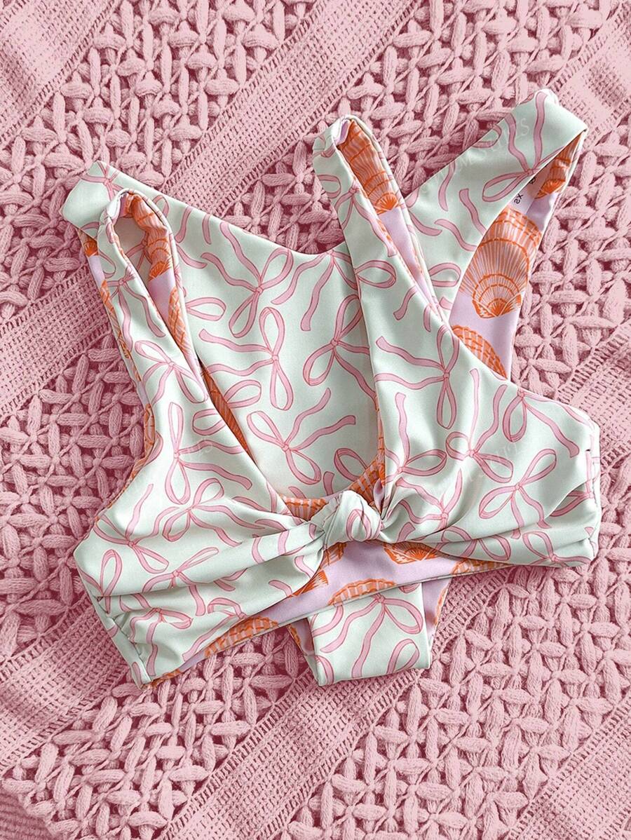 Conjunto de 2 piezas de bikini para mujer de verano, diseno impreso reversible con lazo y concha, con tirantes anchos ajustables y top con efecto retorcido y shorts de natacion a la cintura media, adecuado para fiestas de piscina y vacaciones en la