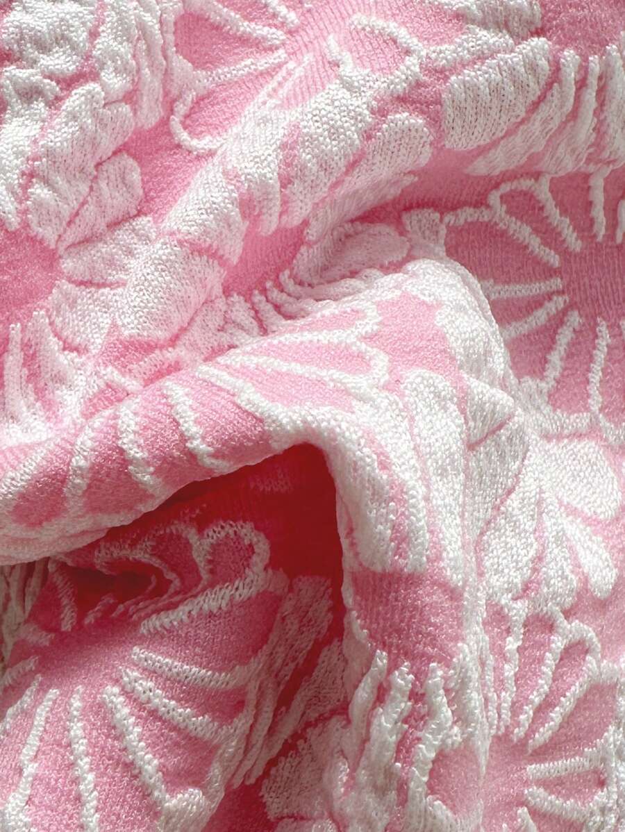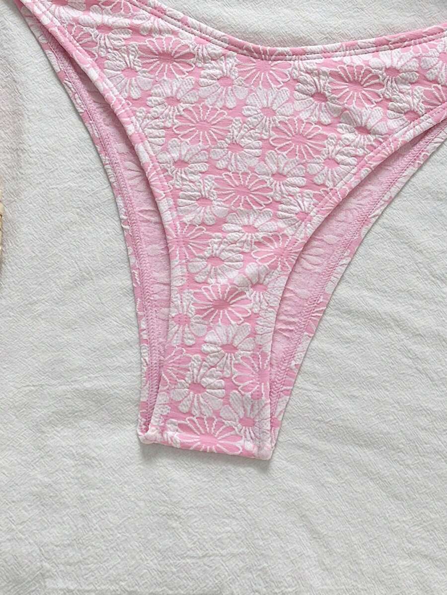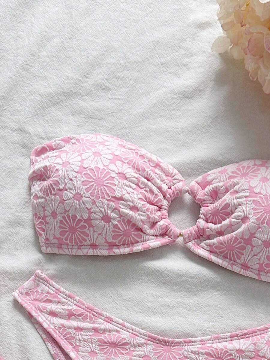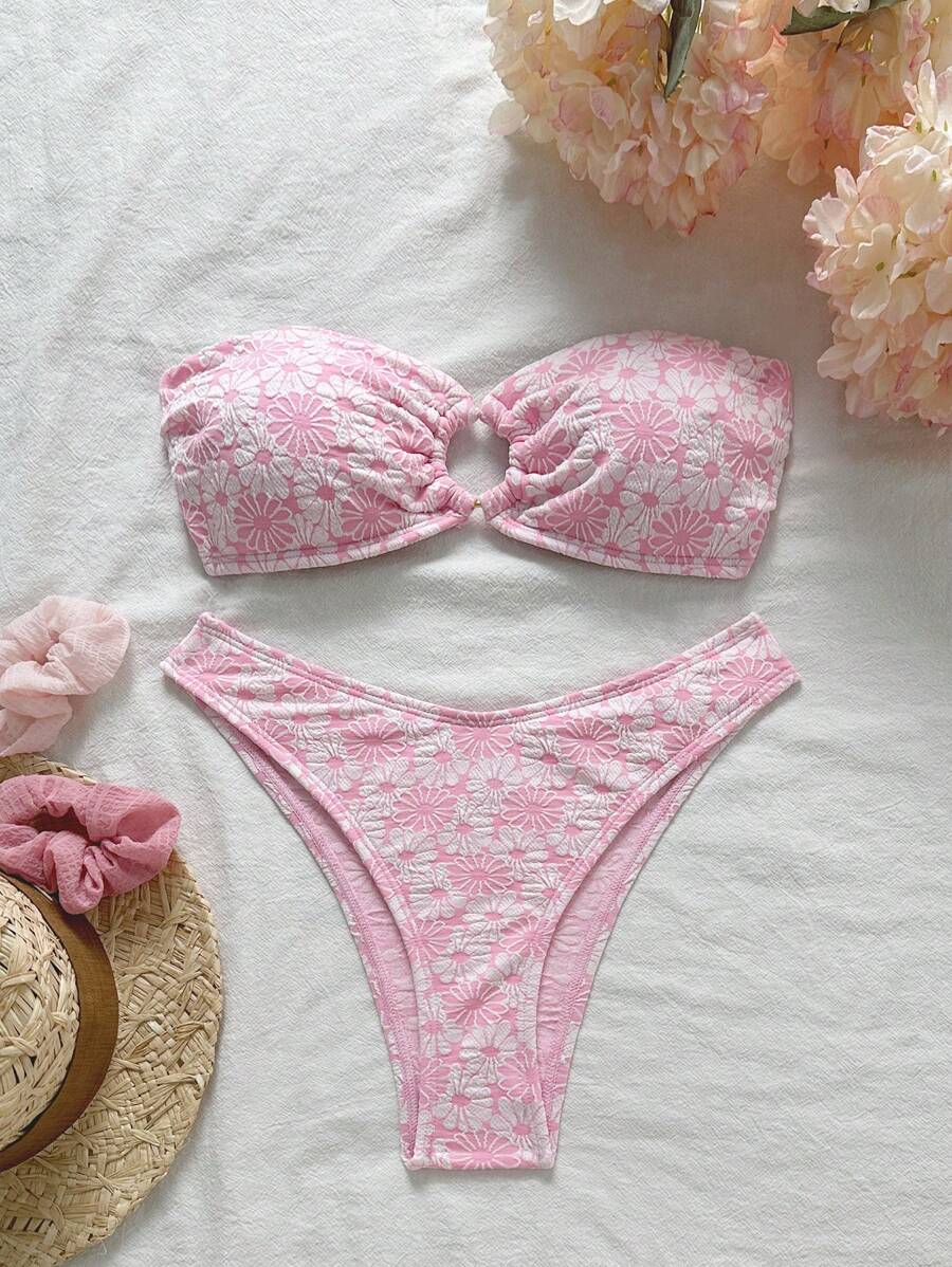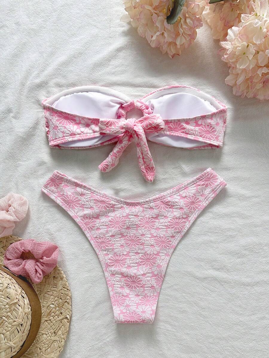 Conjunto de bikini de 2 piezas de mujer con top bandeaux con tirantes extraibles y bottom de cintura alta, con estampado floral jacquard, ropa de playa sexy