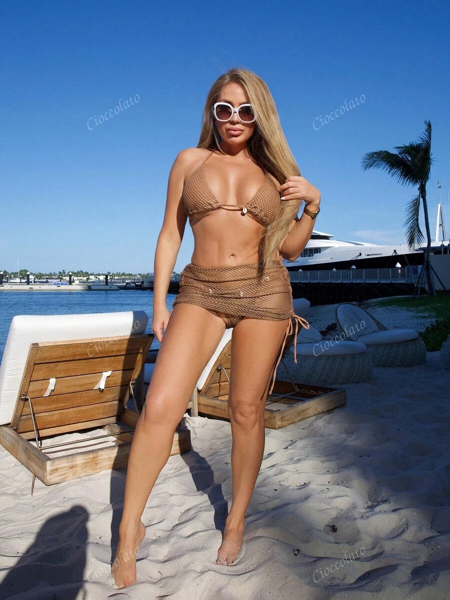 Cioccolato conjunto de bikini para mujer con tapa tipo halter, sujetador, bottom y falda de cobertura con decoracion de concha, traje de bano de verano para playa