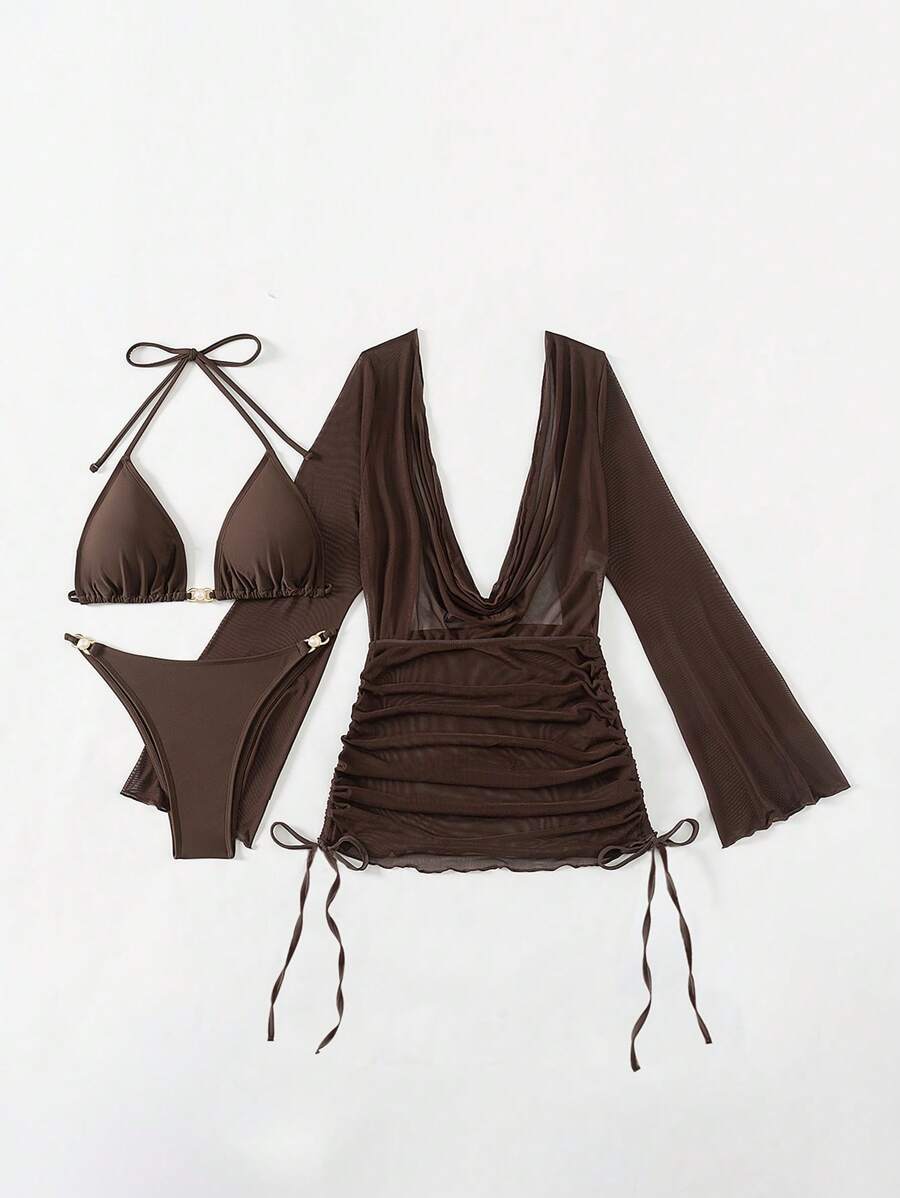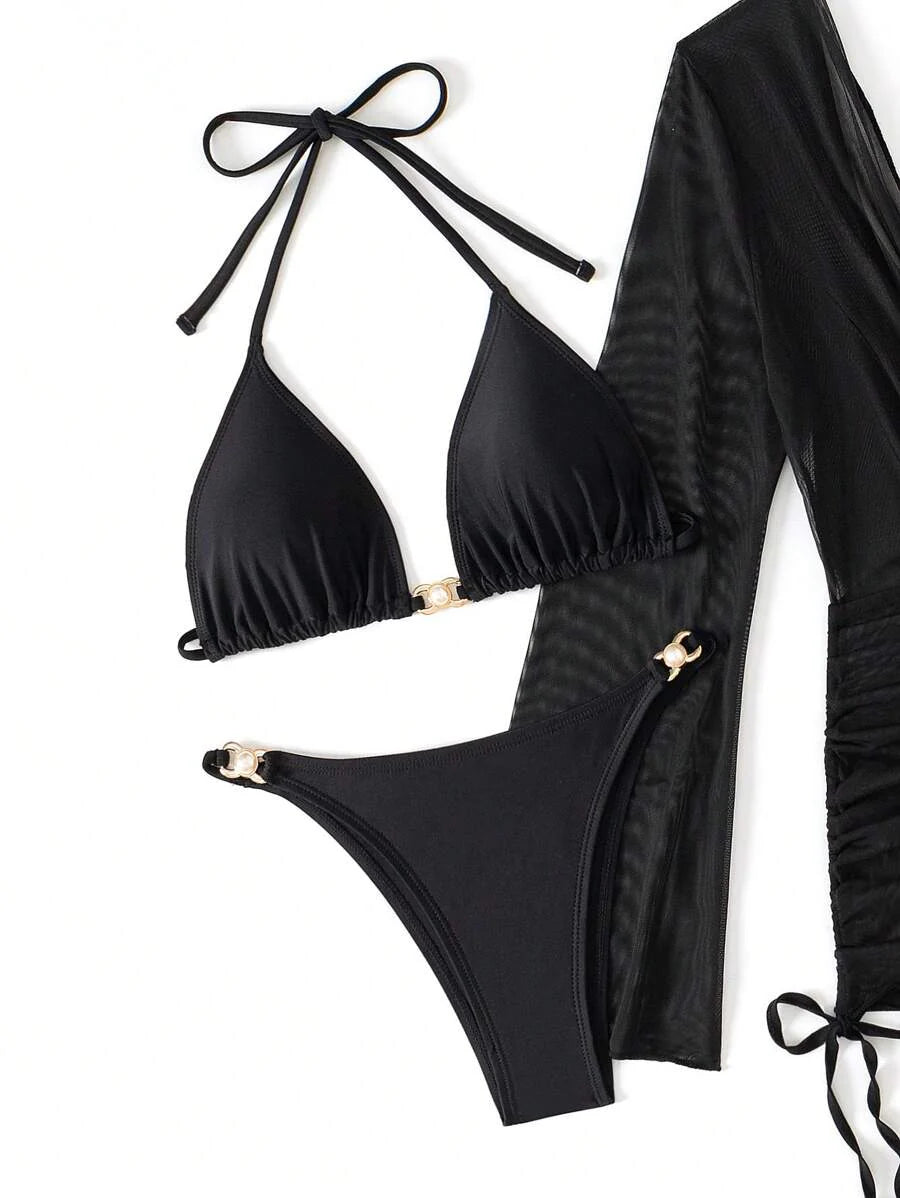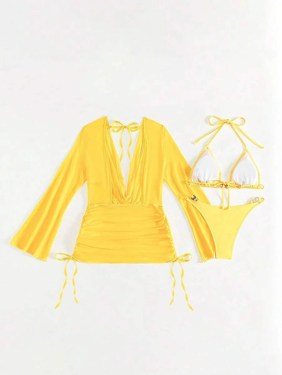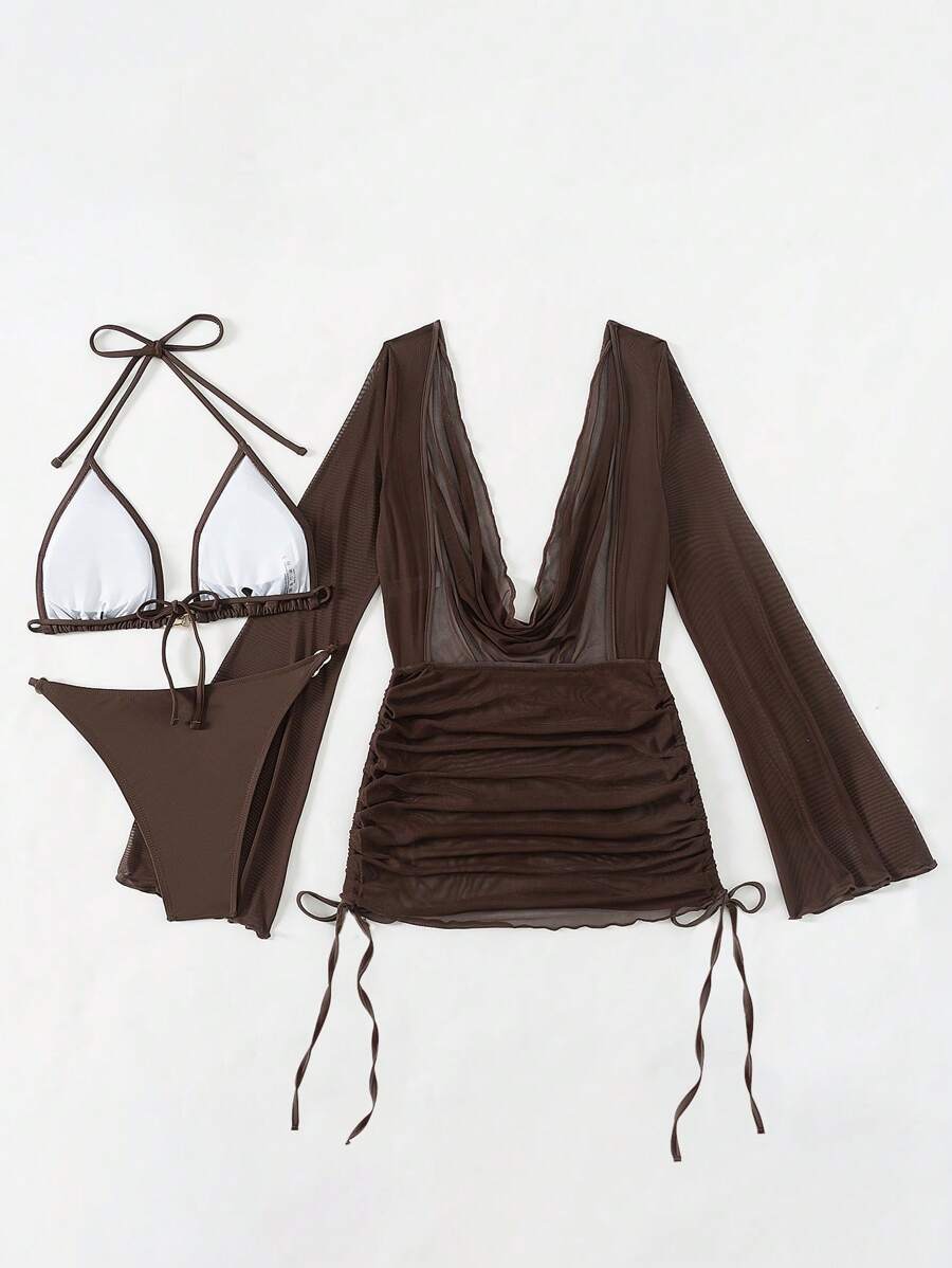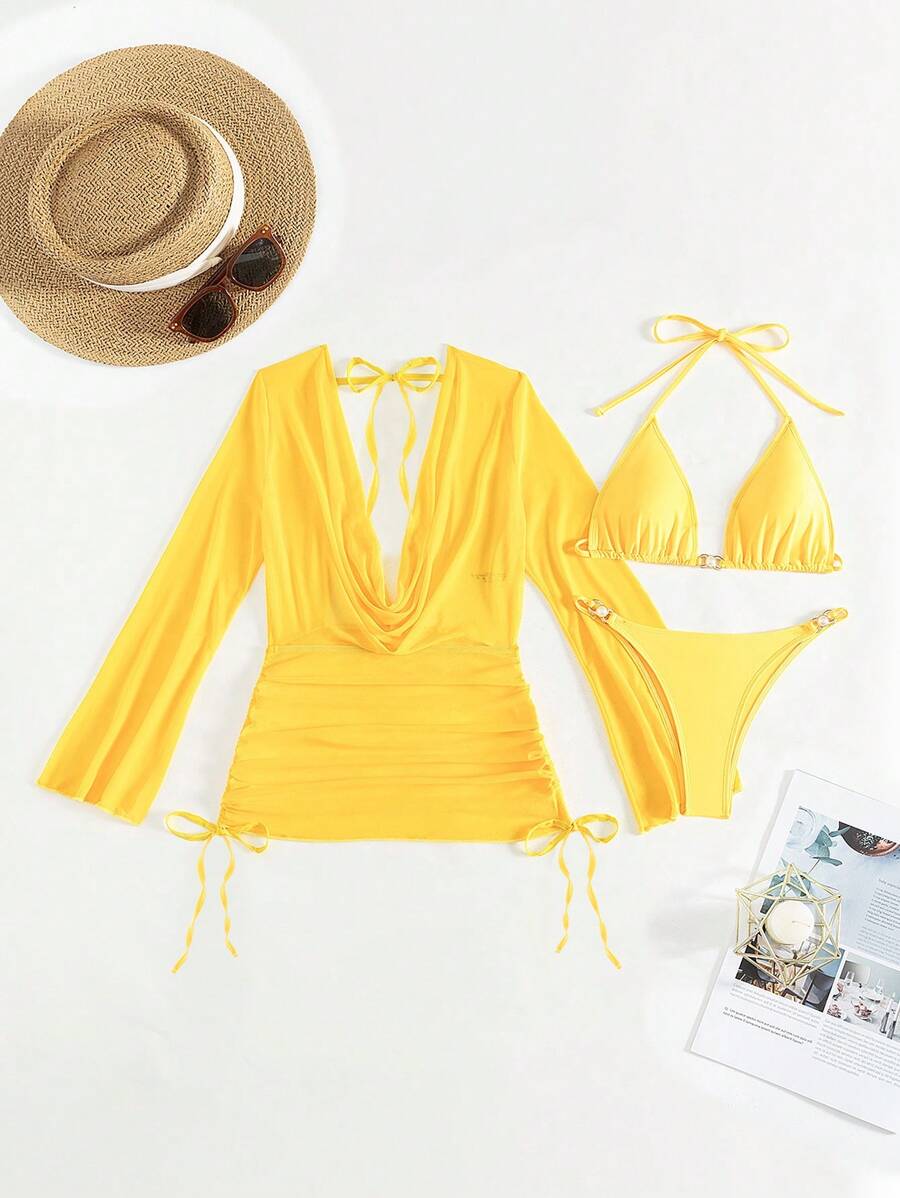 Conjunto de bikini sexy para mujeres con cuello halter y traje de bano separado de unicolor, combinado con un vestido para cubrir para vacaciones en la playa