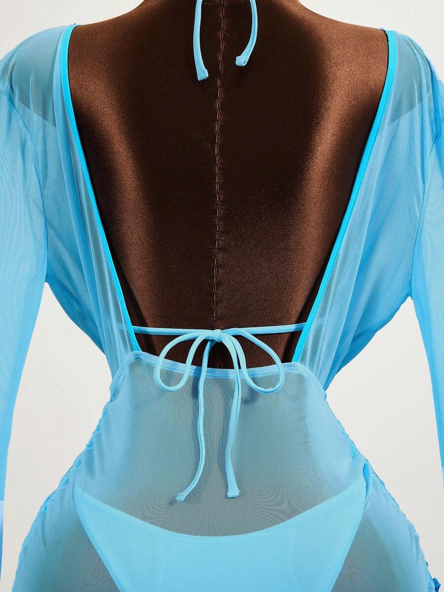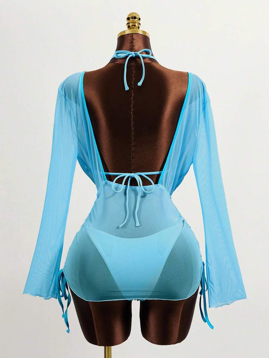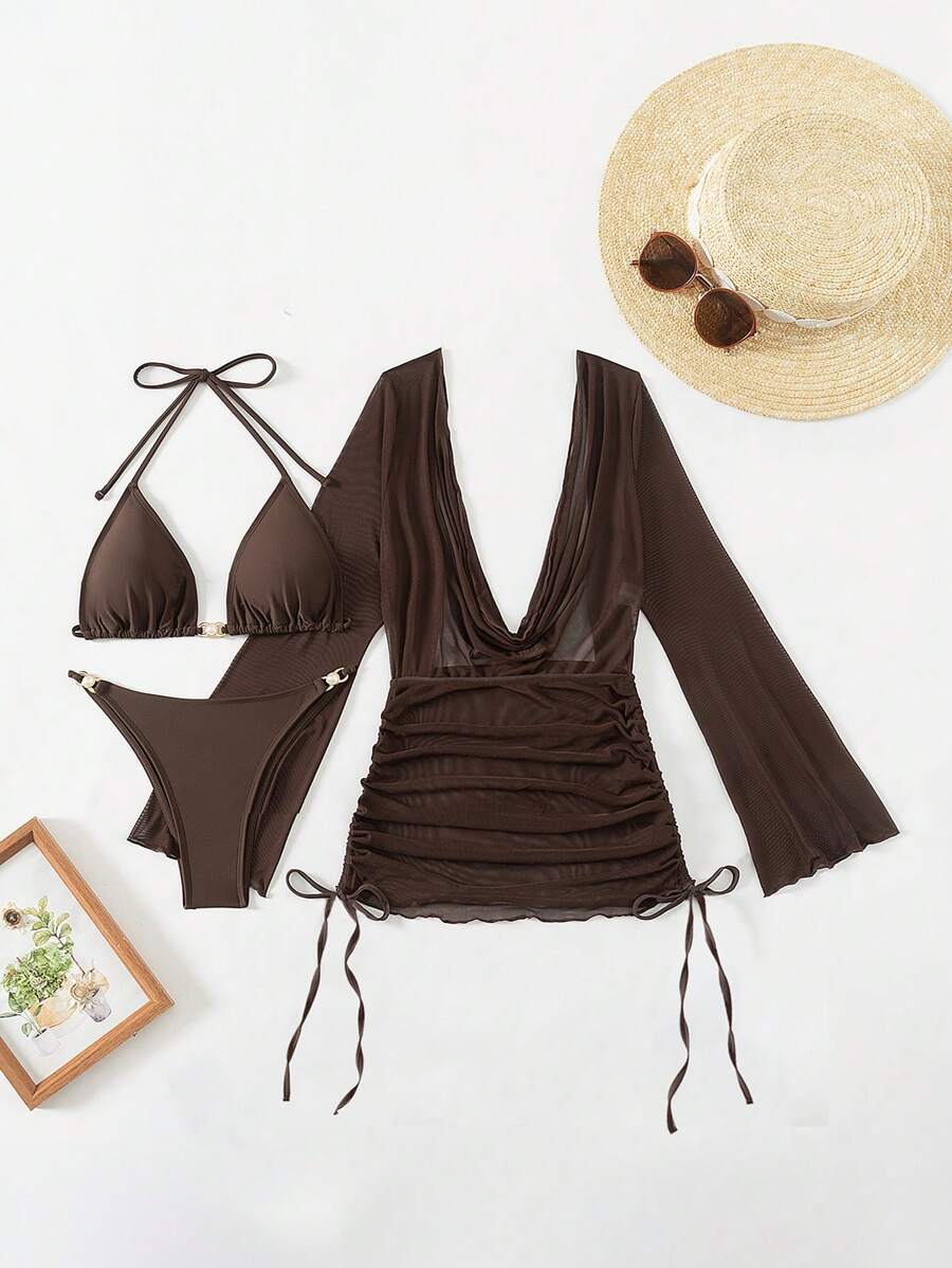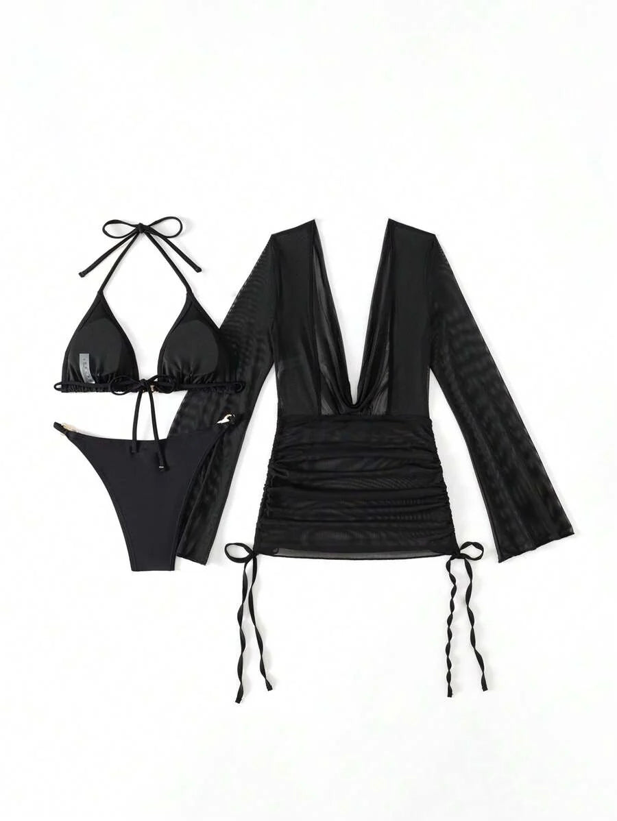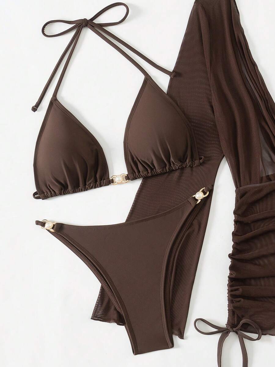 Conjunto de bikini sexy para mujeres con cuello halter y traje de bano separado de unicolor, combinado con un vestido para cubrir para vacaciones en la playa
