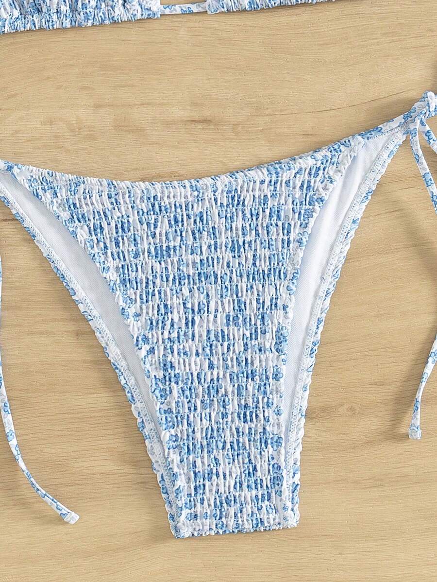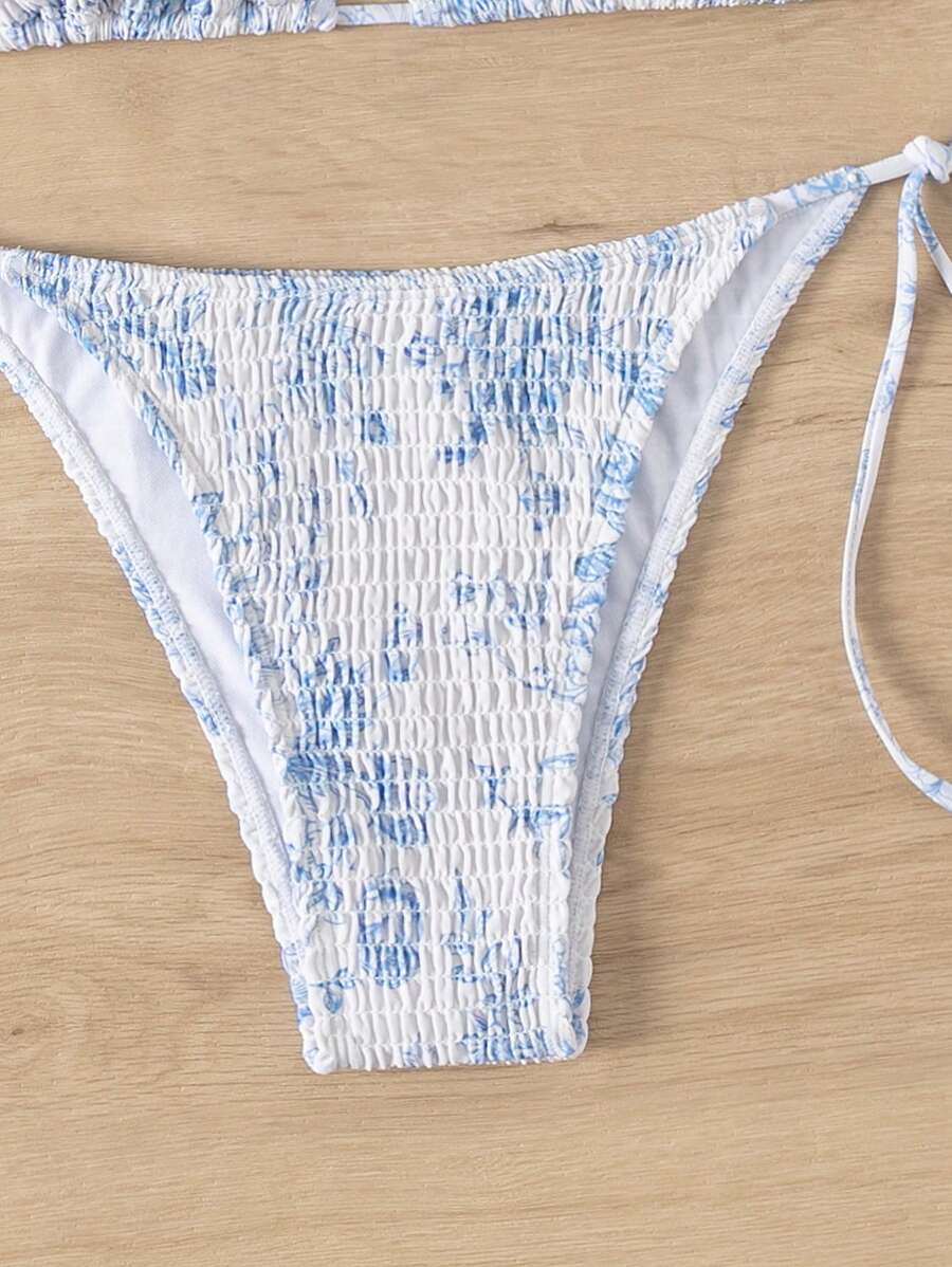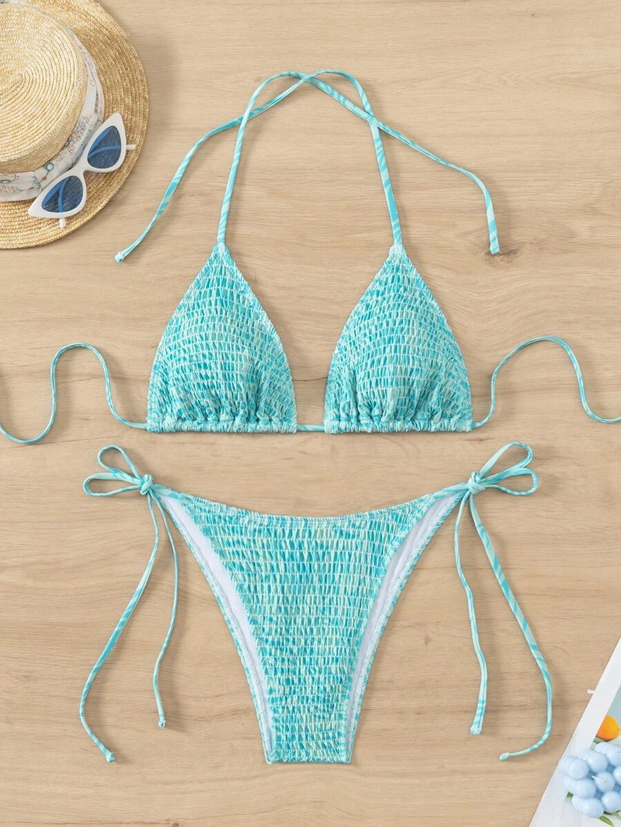 Conjunto de bikini de dos piezas para mujer con diseno tie-dye y cuello halter con fruncido para vacaciones