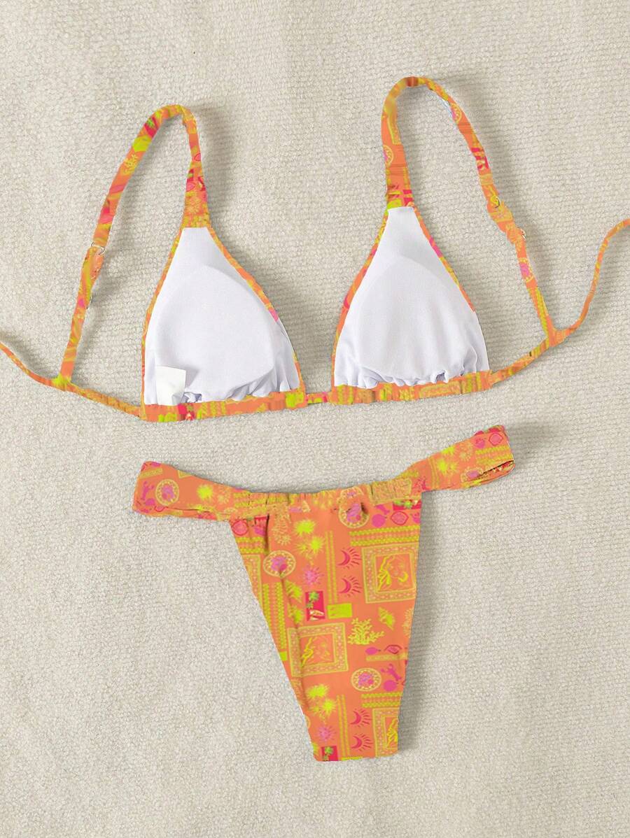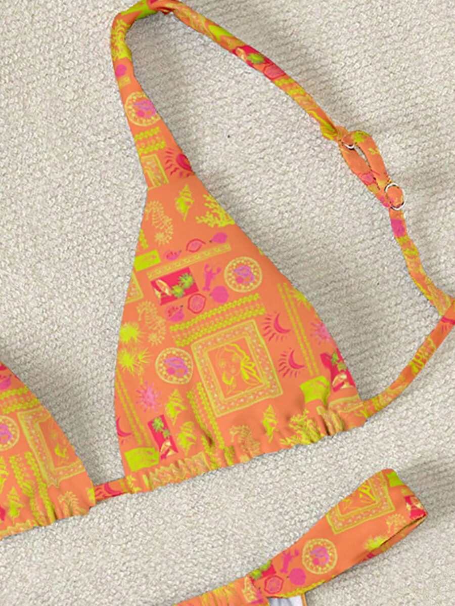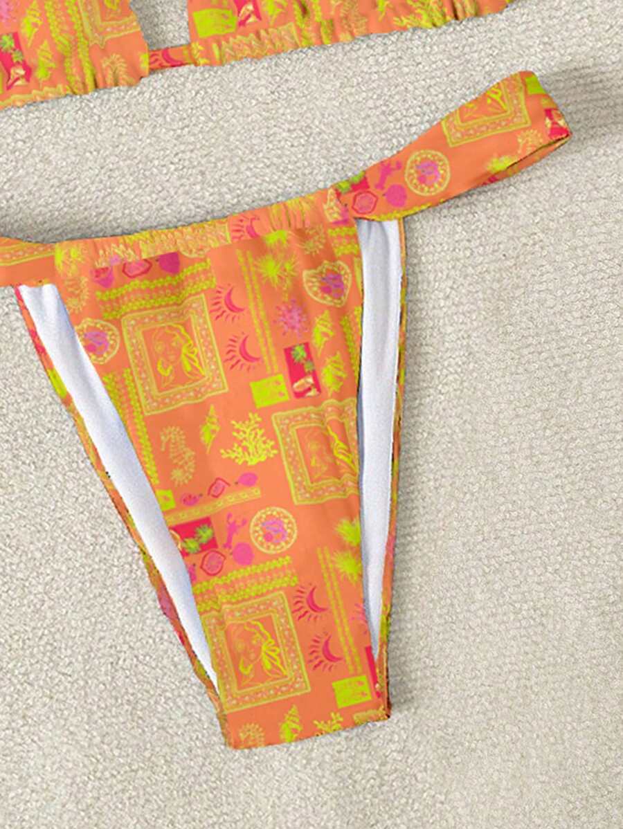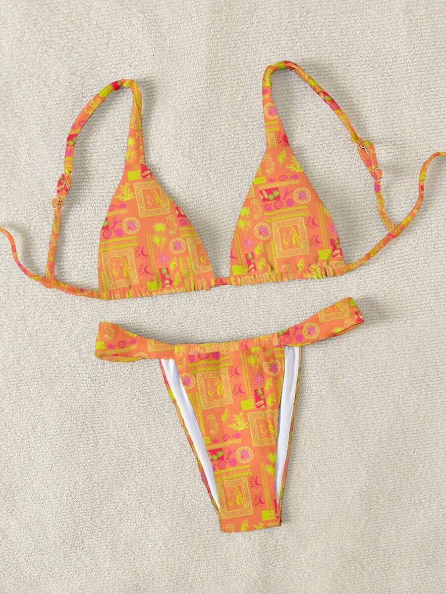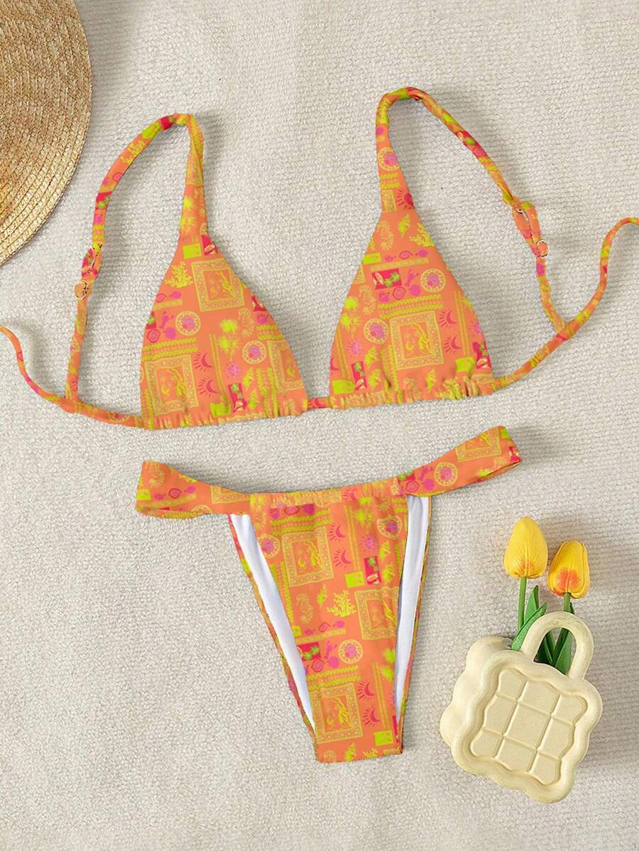 Conjunto de bikini naranja sexy con estampado de plantas para playa de – Muy Bonita
