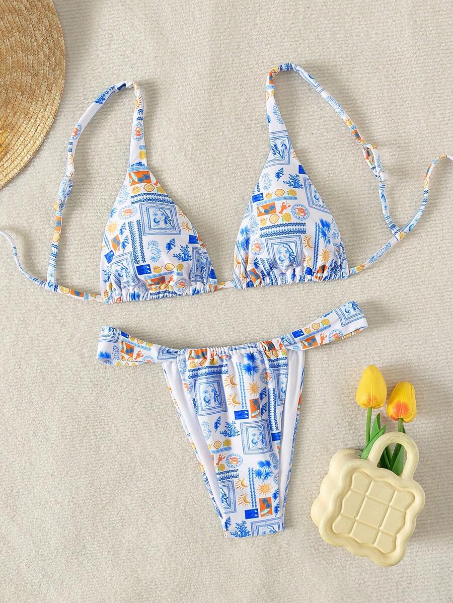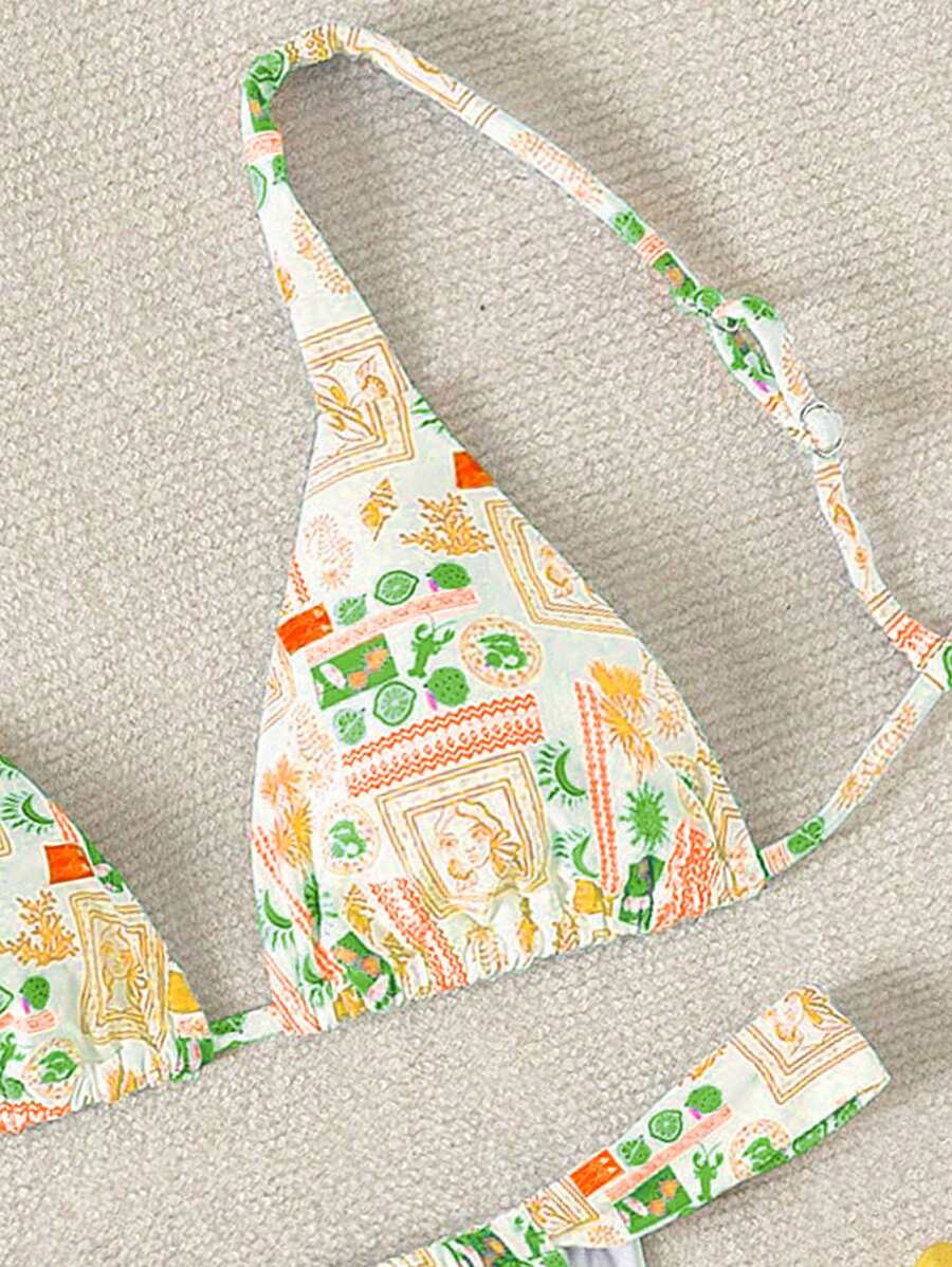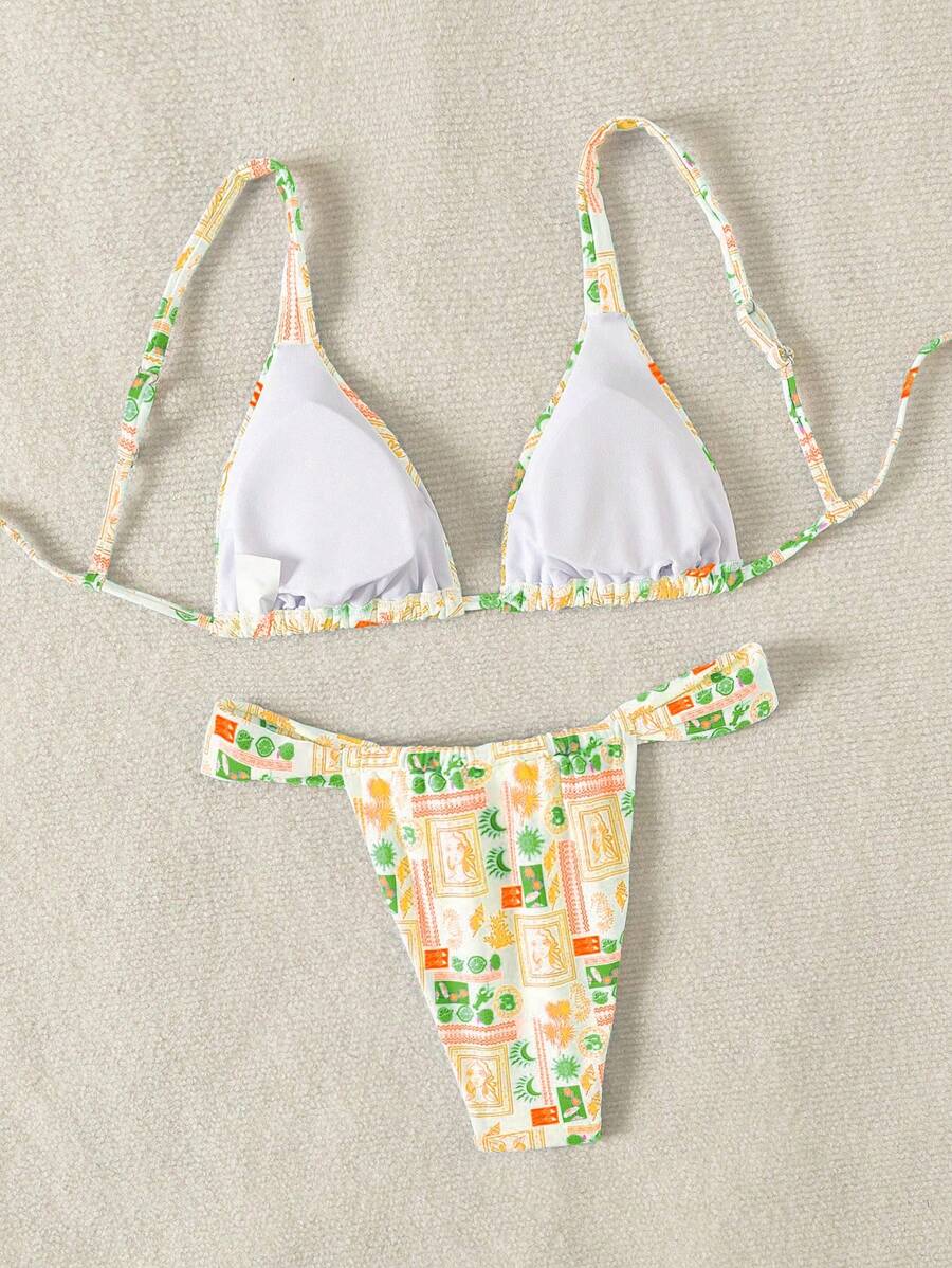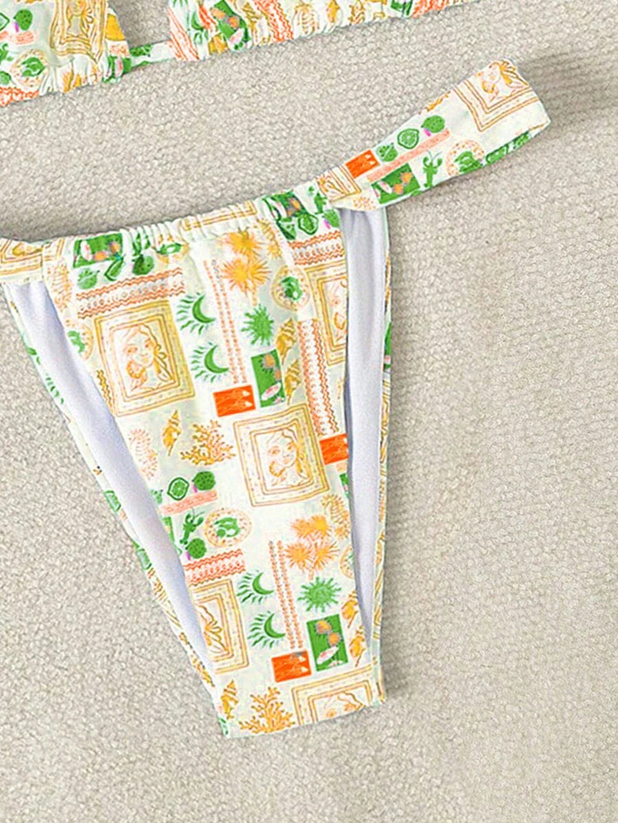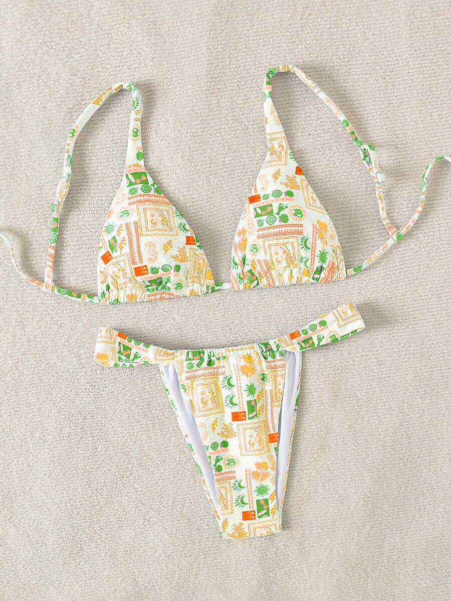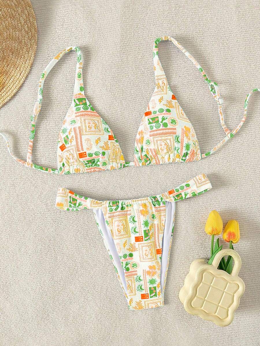 Conjunto de bikini naranja sexy con estampado de plantas para playa de – Muy Bonita