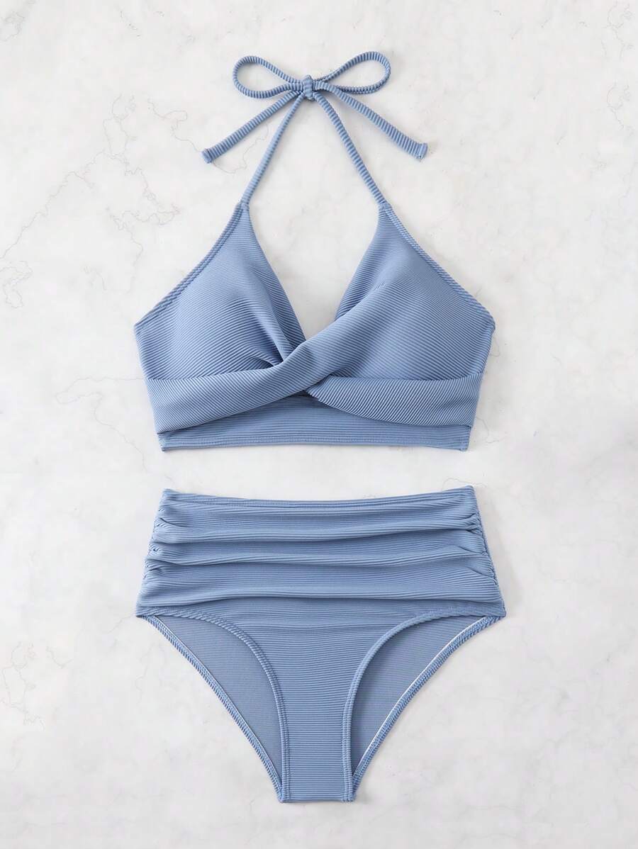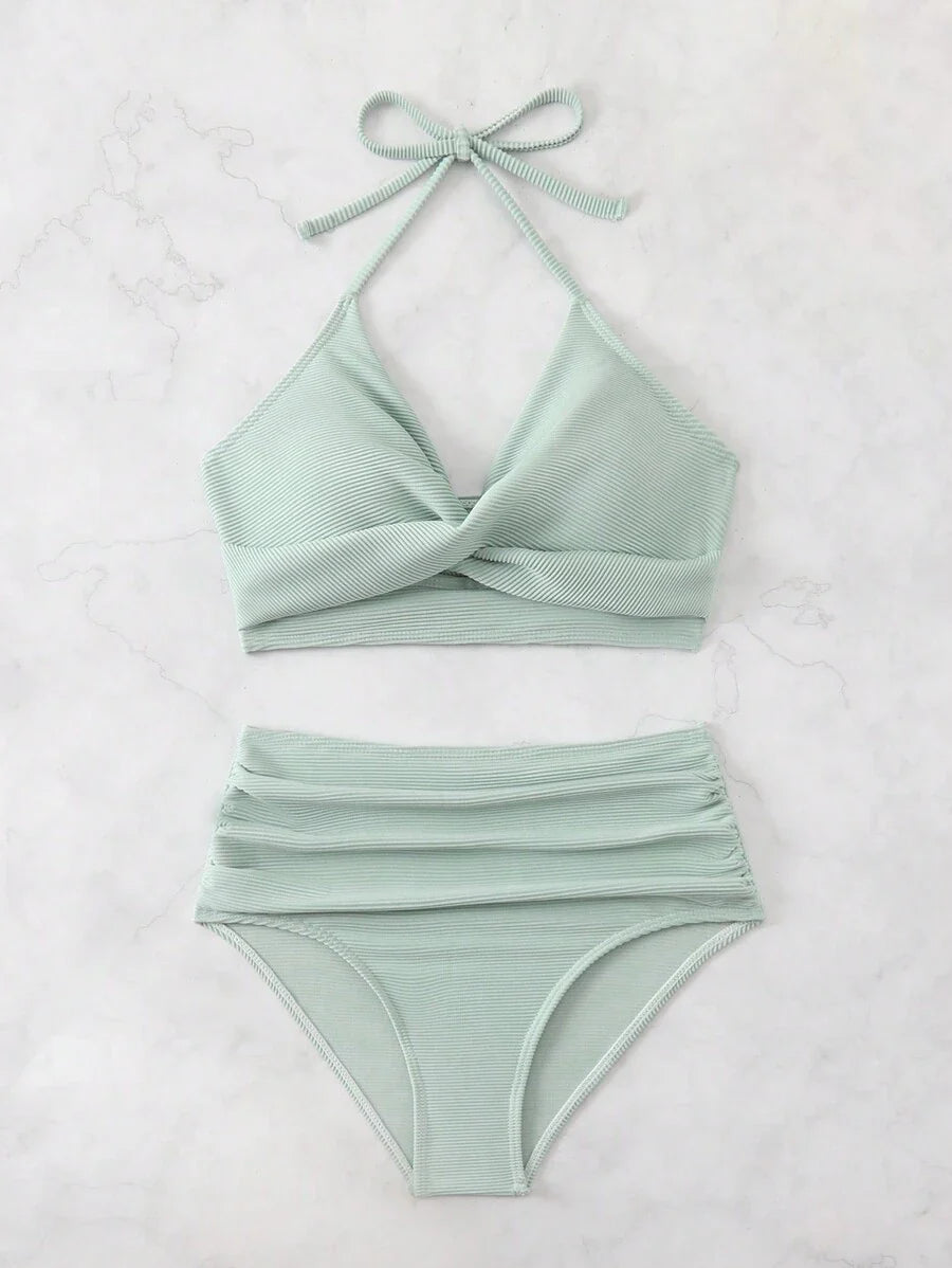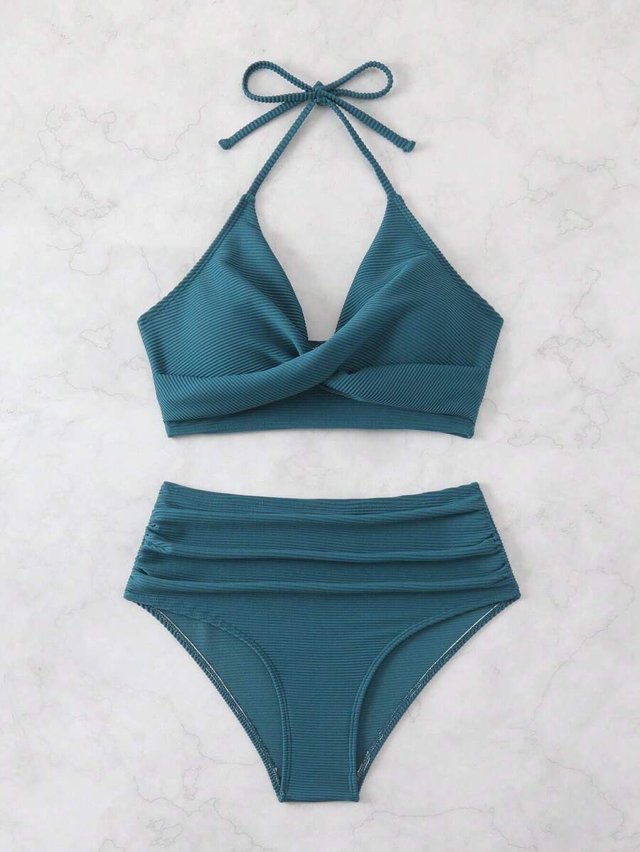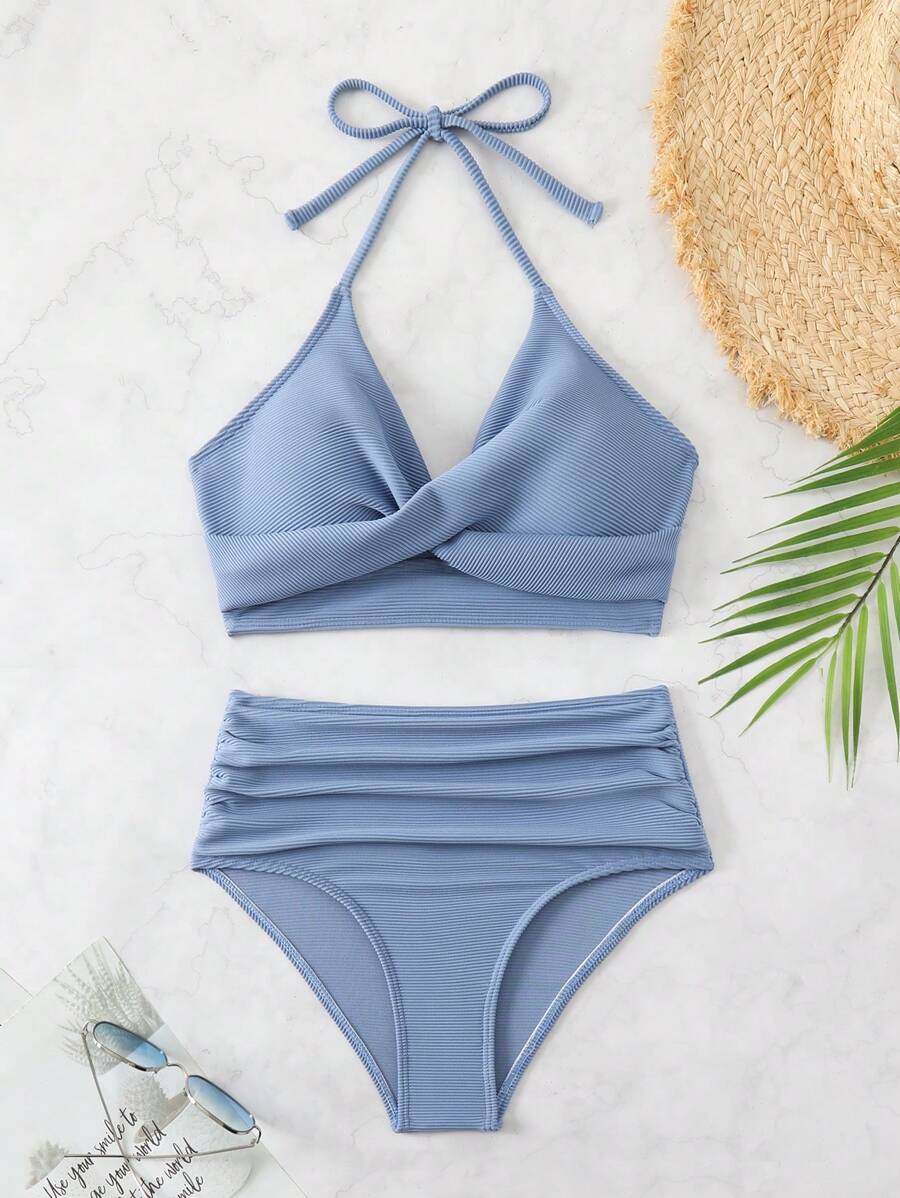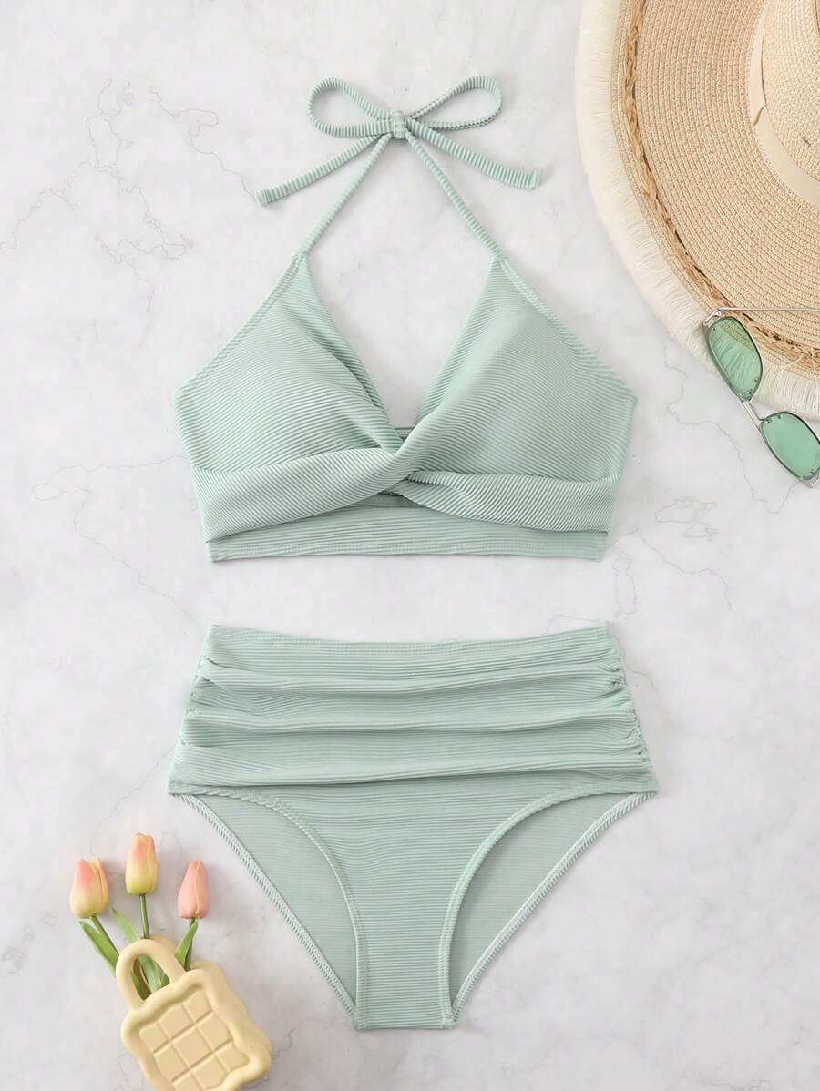 Conjunto de bikini con tirantes de espagueti con diseno retorcido y plisado en unicolor para la playa de verano en vacaciones
