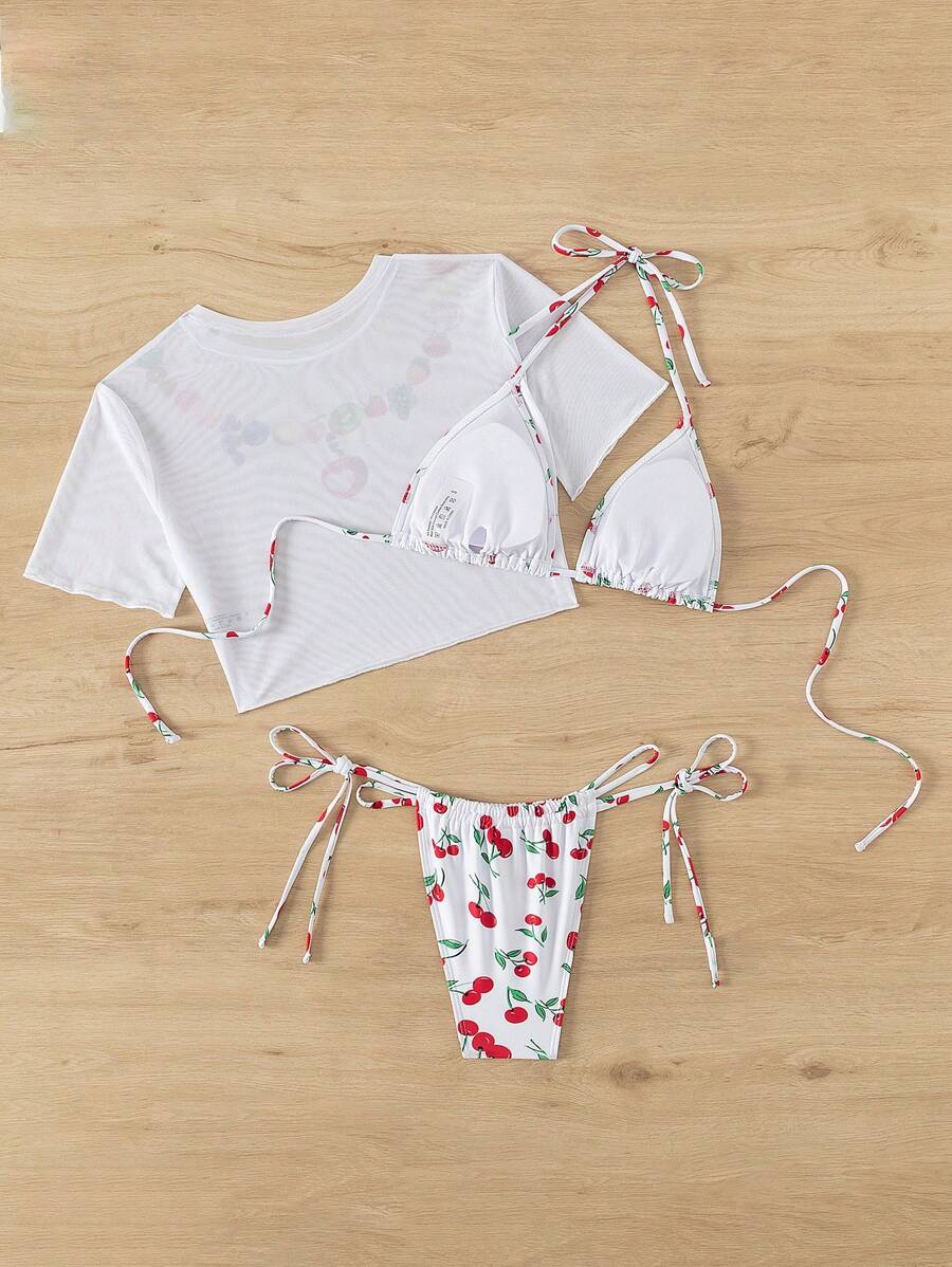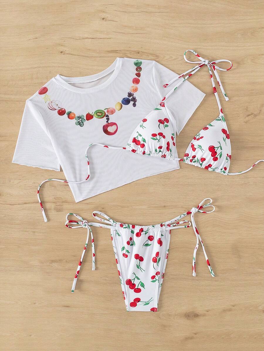 Conjunto de 3 piezas: top de bikini con estampado de cerezas en todo e – Muy Bonita