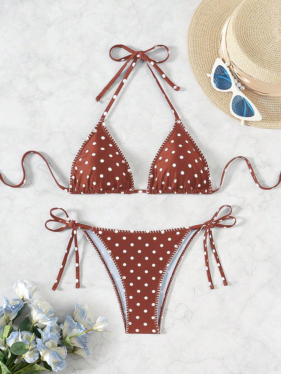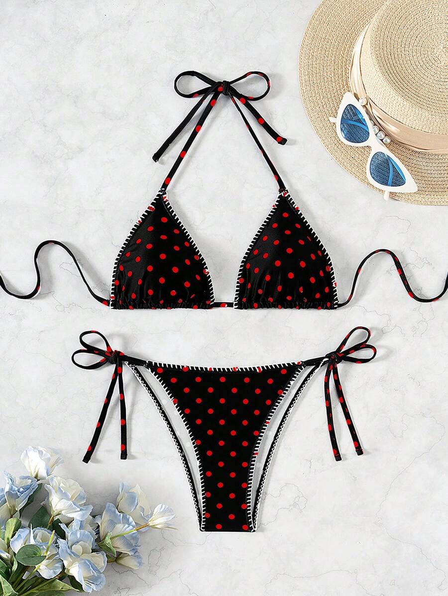 Conjunto de bikini para mujer de playa: top sin espalda estampado de lunares con cuello halter y tira de amarre en la espalda, y shorts de bano con estampado al azar y tiras laterales