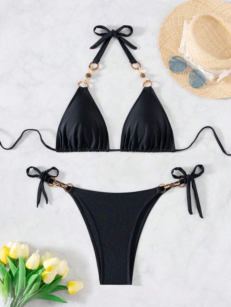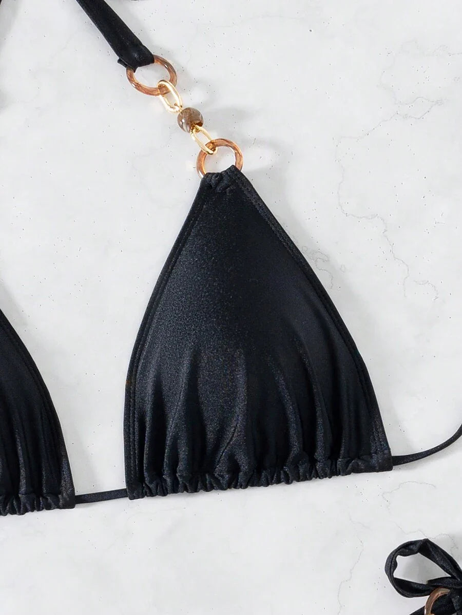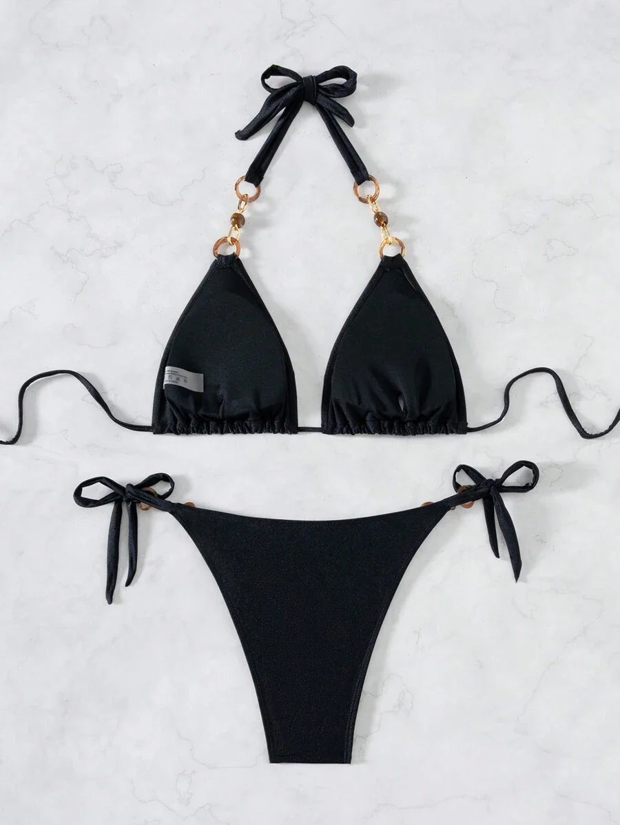 Conjunto de bikini de mujer en unicolor, sexy, con detalles metalicos y amarres en el cuello para usar en la playa