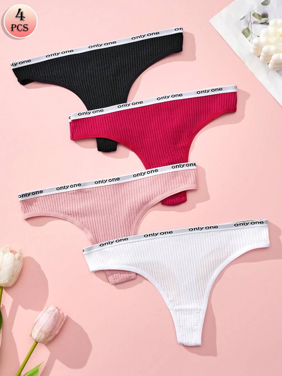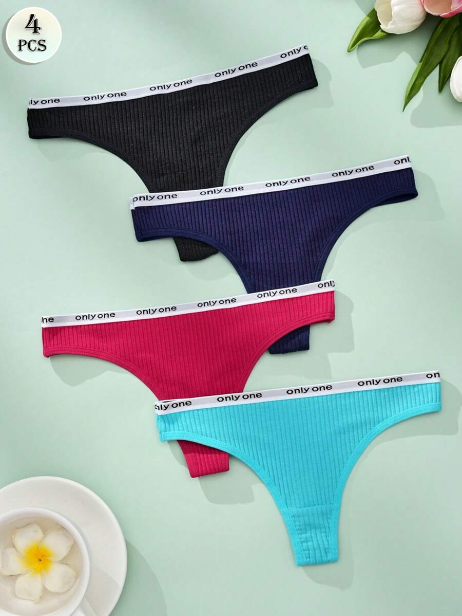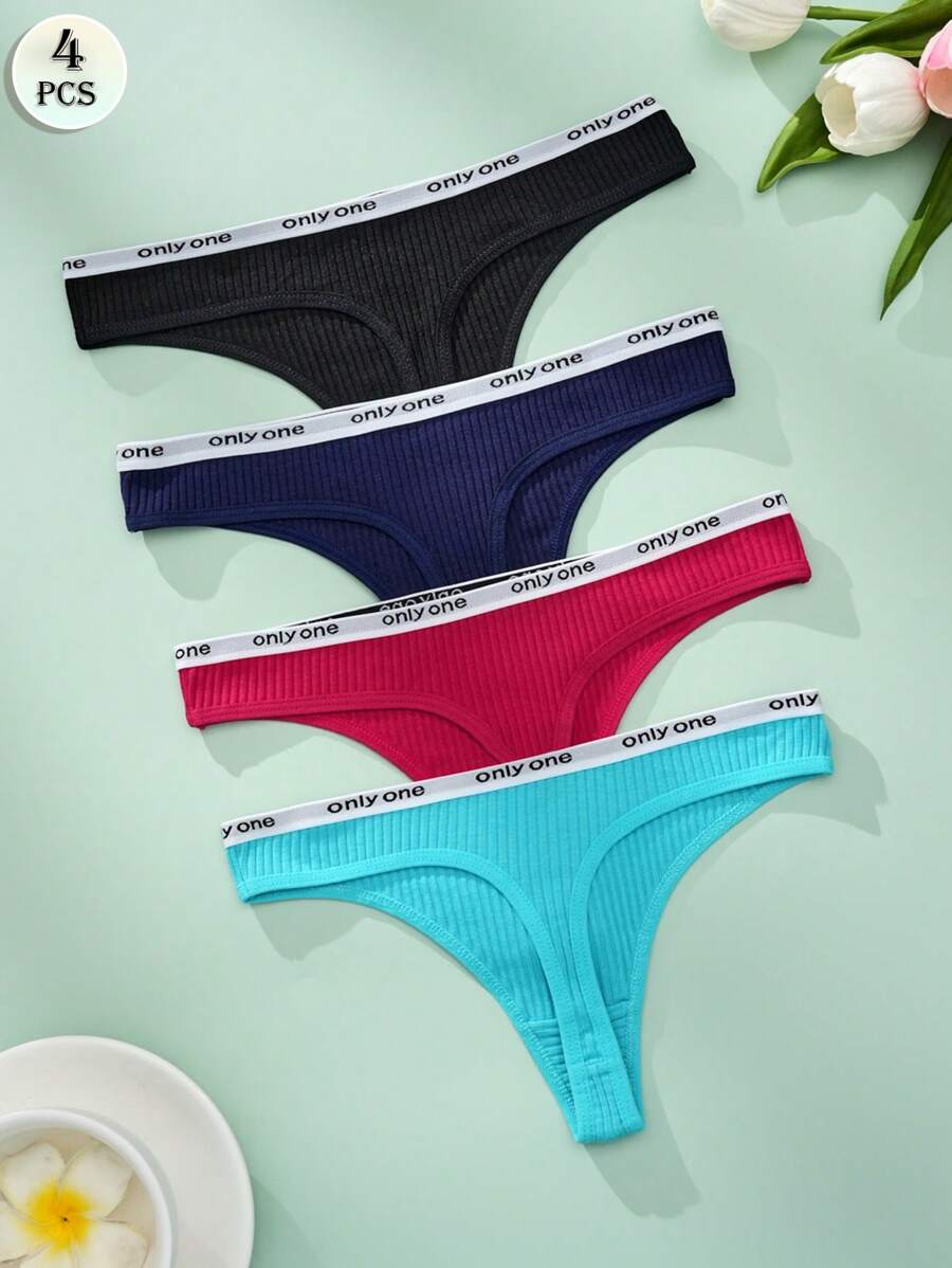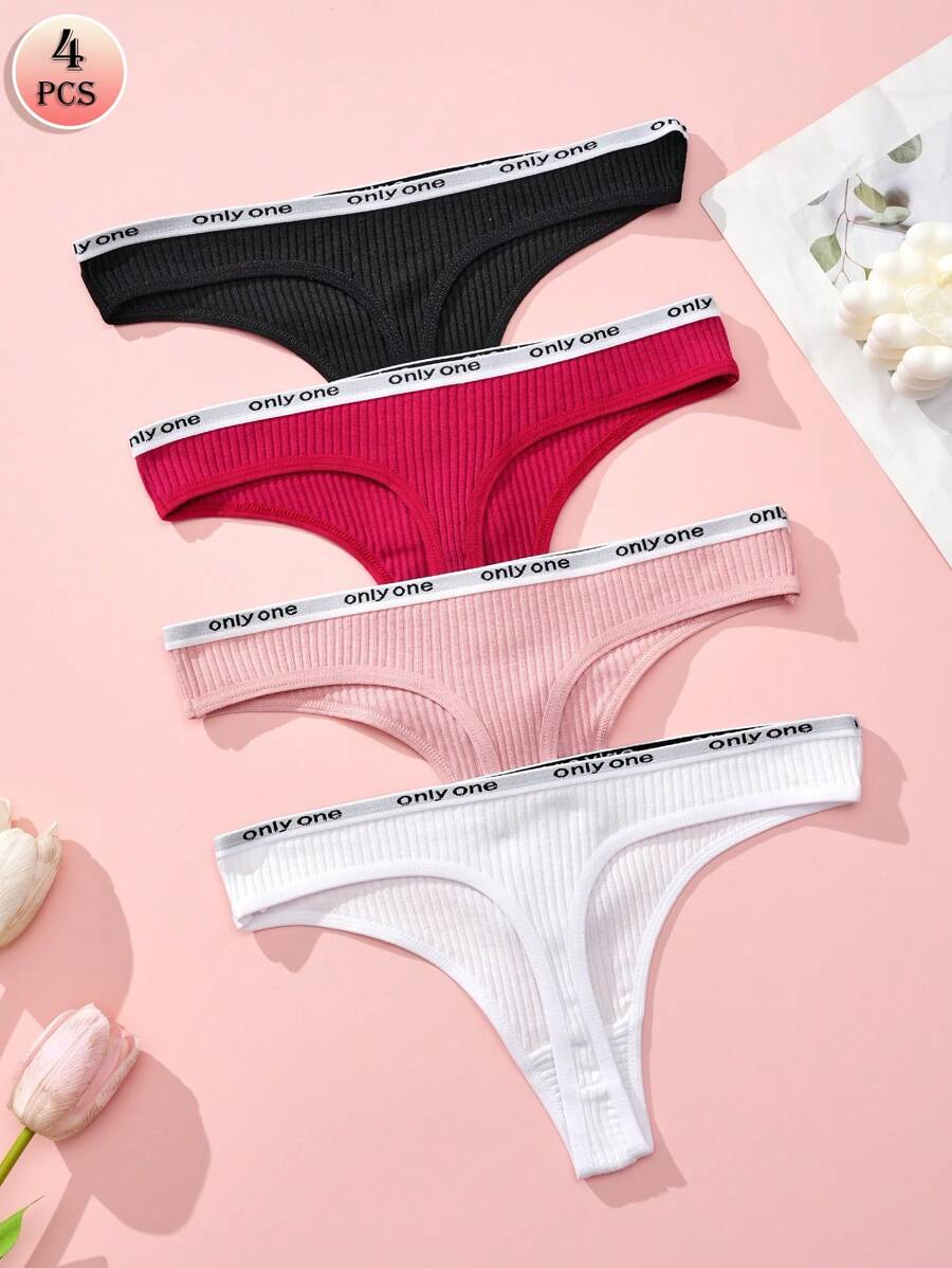 Aprsea paquete de 4 tangas de mezcla de algodon de colores aleatorios para mujeres - ropa interior sexy tipo tanga de talle bajo con estampado de letras, tela de punto comoda, calzoncillos con banda elastica sin marcas con diseno de letras