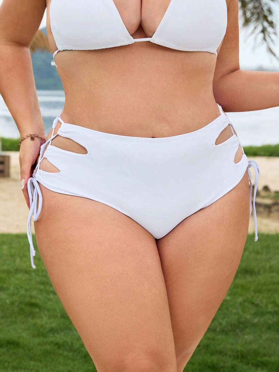 Bottom de traje de bano de playa para mujer talla grande, color blanco solido, con diseno de correa ajustable en la cintura y corte hueco