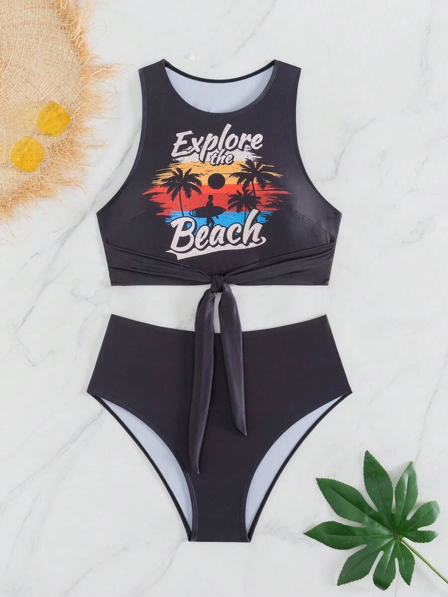 Lushoire nuevo estilo europeo y americano de vacaciones, conjunto de camiseta y bikini sexy estampado, que estiliza el abdomen, traje de bano de dos piezas para mujer, playa
