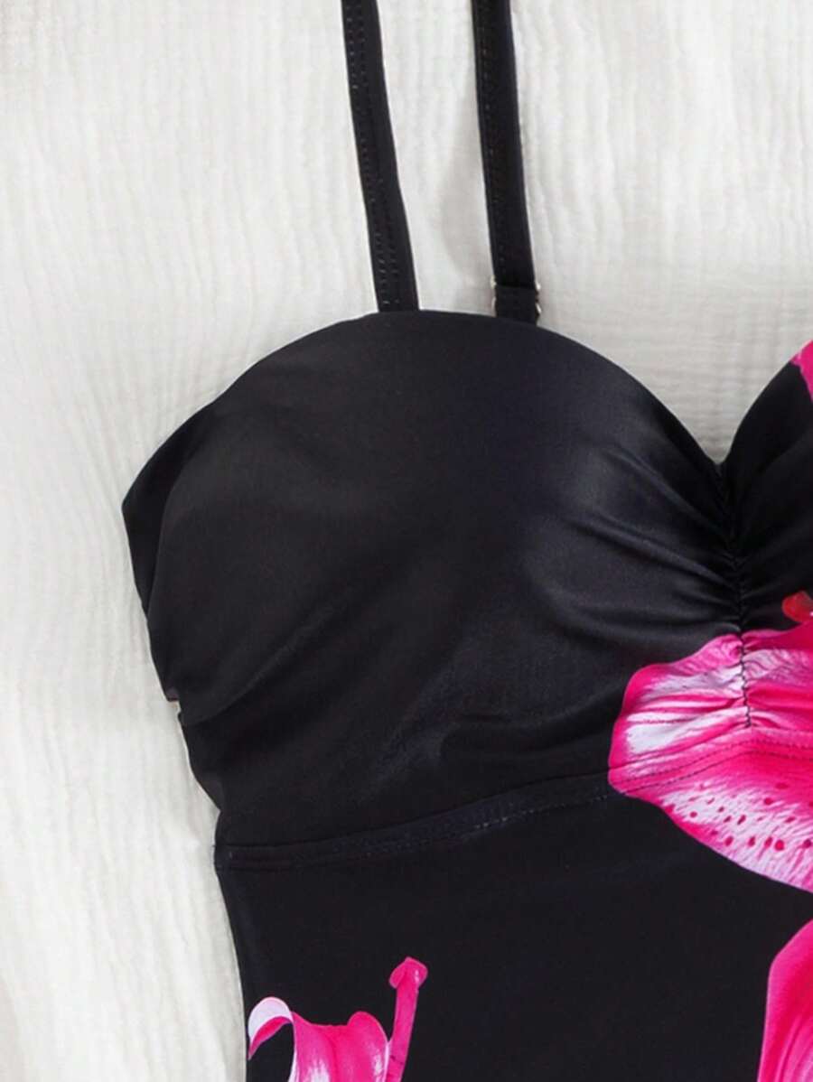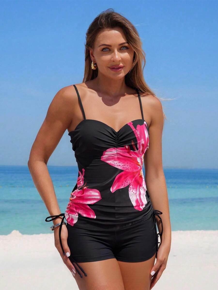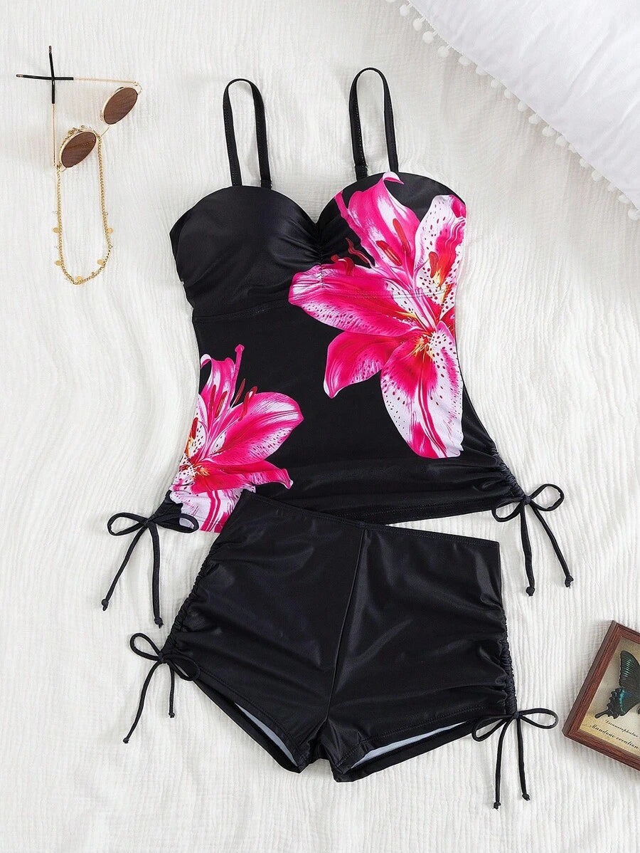 Lushoire traje de bano tipo tankini con volantes en la parte delantera y estampado de lirios de unicolor para mujeres, verano