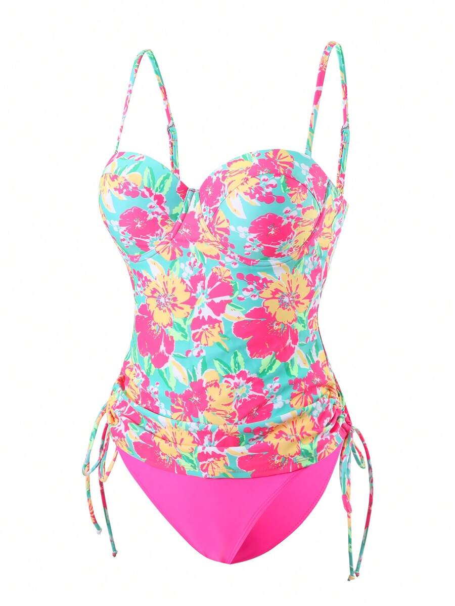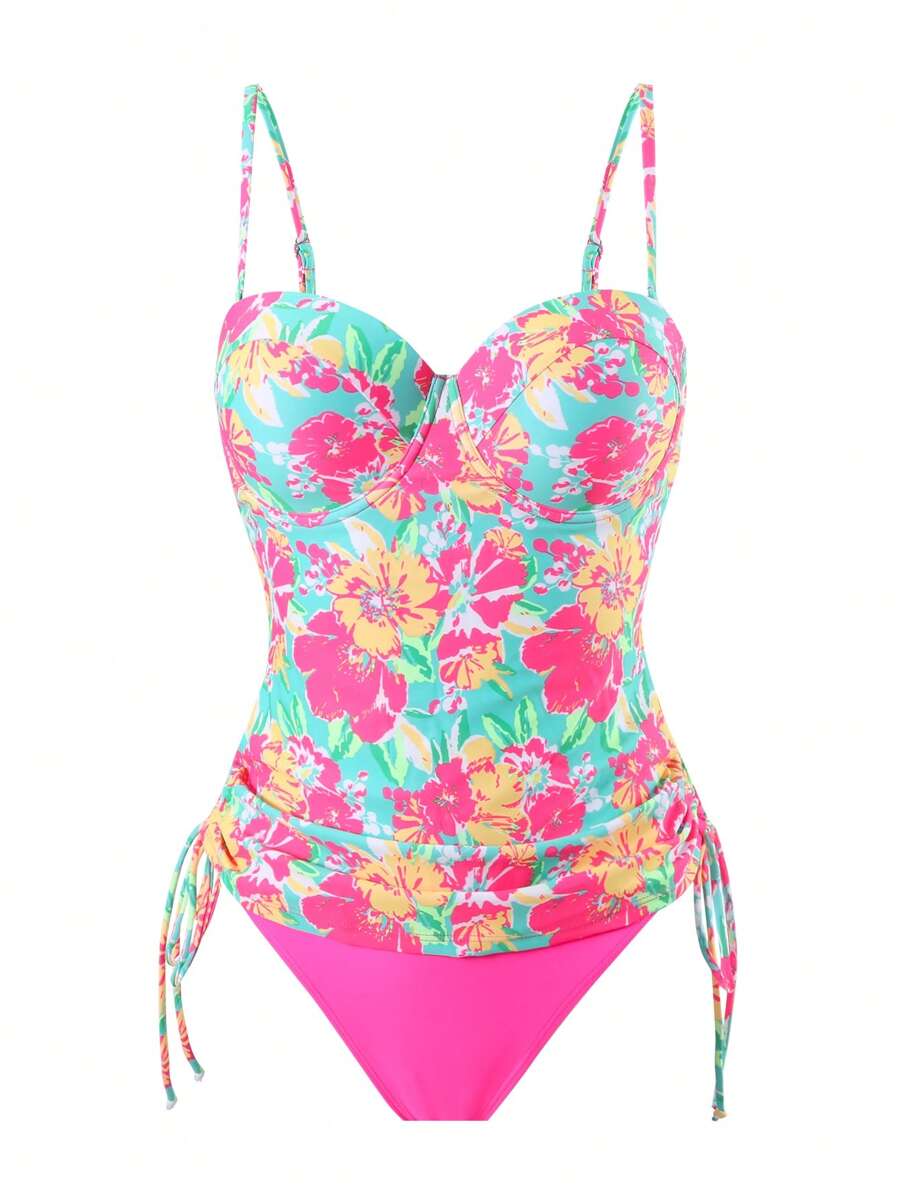 Lushoire conjunto de 2 piezas con top larga sin acolchado con brasier de alambres y estampado floral tropical maduro y sexy, y bottom de bikini con corte en v solida