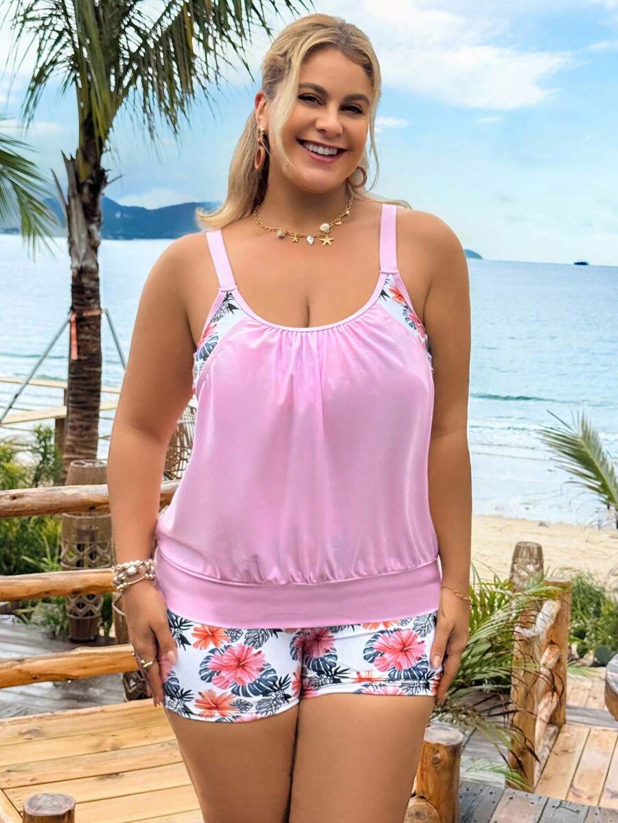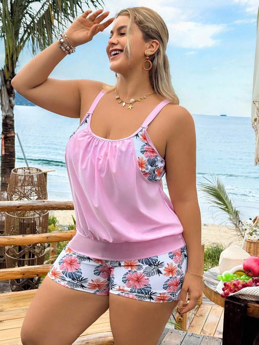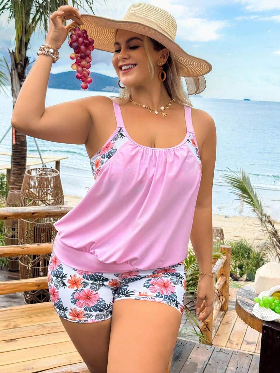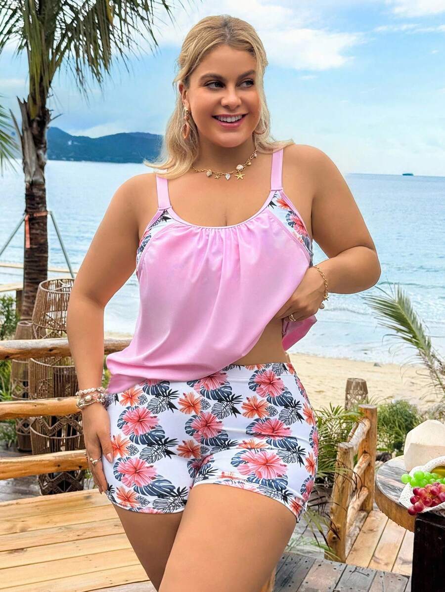 Lushoire conjunto de 2 piezas de talla grande con estampado de plantas, pantaloneta tipo boyshort de tirantes anchos, traje de bano tankini de estilo minimalista casual y maduro